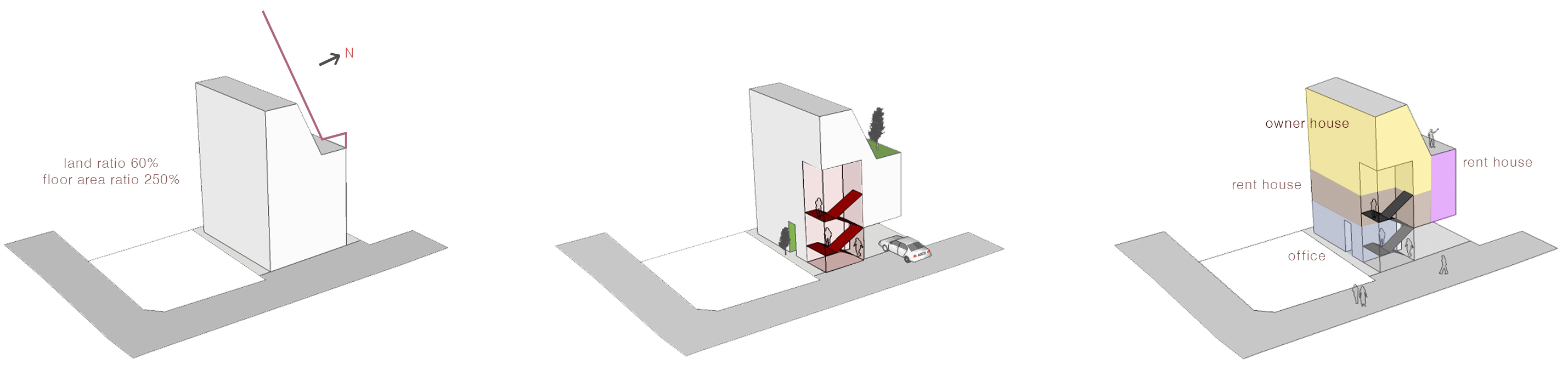 빌라승승은 초등학교를 다니는 두 딸이 있는 부부에게 꼭 맞는 도심 속 마땅한 땅 찾기로 시작하였다. 아이들의 초등학교와 멀지 않은 범위에서 주차가 가능하고 1층에 주차장과 사무실을 구성할 수 있는 땅. 정북조건을 적용했을 때, 임대 세대를 구성하고 신축 자금의 부담감을 조금이나마 덜 수 있어야 했다. 그렇게 찾은 땅은 남, 서, 북쪽은 인접 대지가 주택으로 둘러싸인 상태이지만 동쪽에 적당히 넓은 도로를 면하고 있었고, 도로에 면한 대지의 길이도 10m 정도 되었기 때문에 건축주가 원하는 계획 요소를 적용하기에 무리가 없었다.빌라승승은 인접 대지와의 이격 거리가 큰 북쪽에 주차장을 계획하면서 자연스럽게 공용부와 주거 공간이 남쪽으로 배치되도록 하였다. 남쪽에서도 오른쪽은 도로와 접한 곳이고, 왼쪽은 인접 대지와 접한 상태라 우리는 주거 공간을 도로에서 한걸음 물러선 왼쪽에 두기로 계획하였다. 그렇게 남은 공용부는 남쪽 도로변에 자리 잡았고, 이는 전체적인 매스에서 크게 변화를 줄 수 있는 요소가 되었다. 도로변에 접한 공용부는 외기에 노출되는 형태로 설계하여 전체 건물에서 1/5 정도가 비워지게 되었고, 마을로 열린 공용부를 형성하게 되었다.