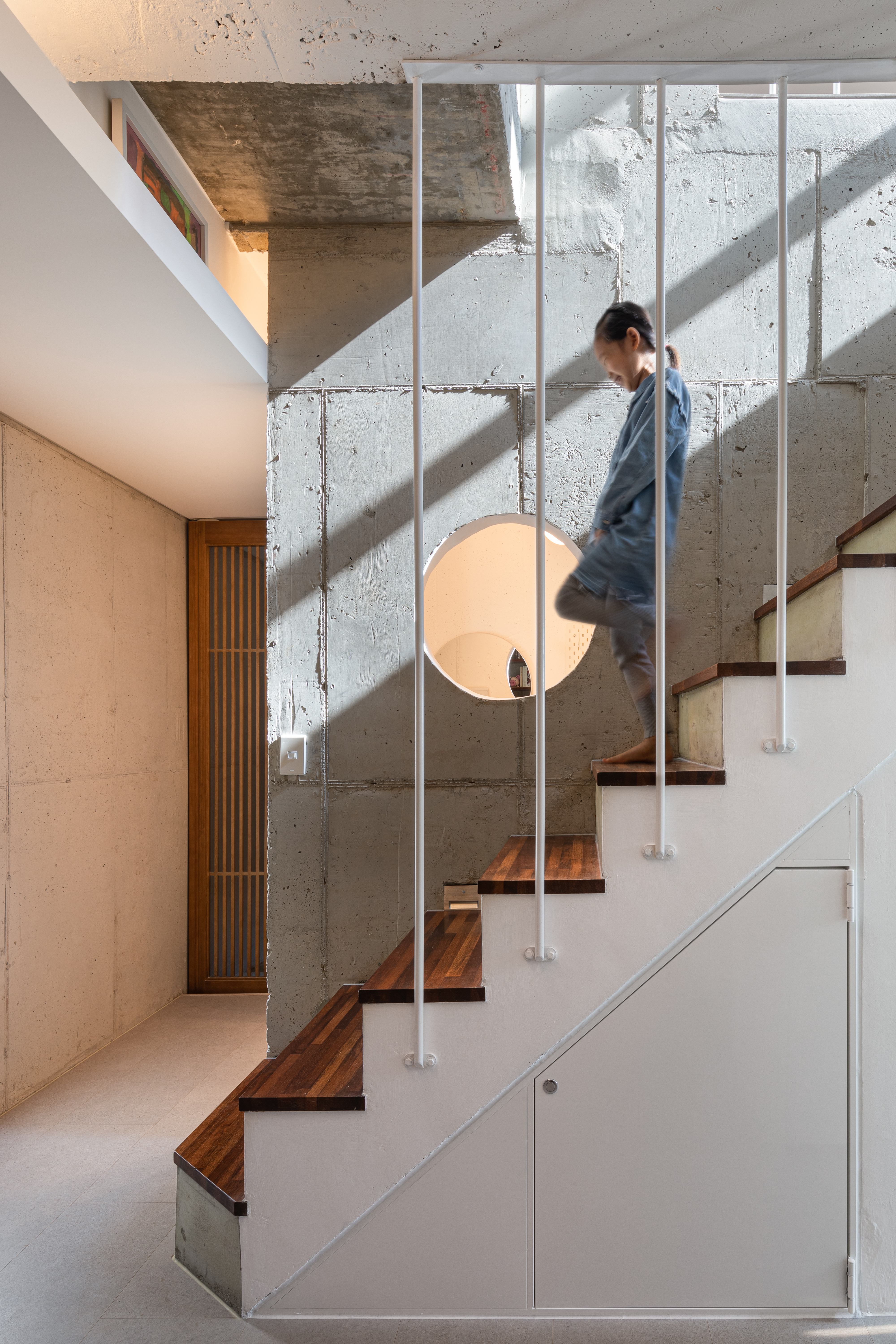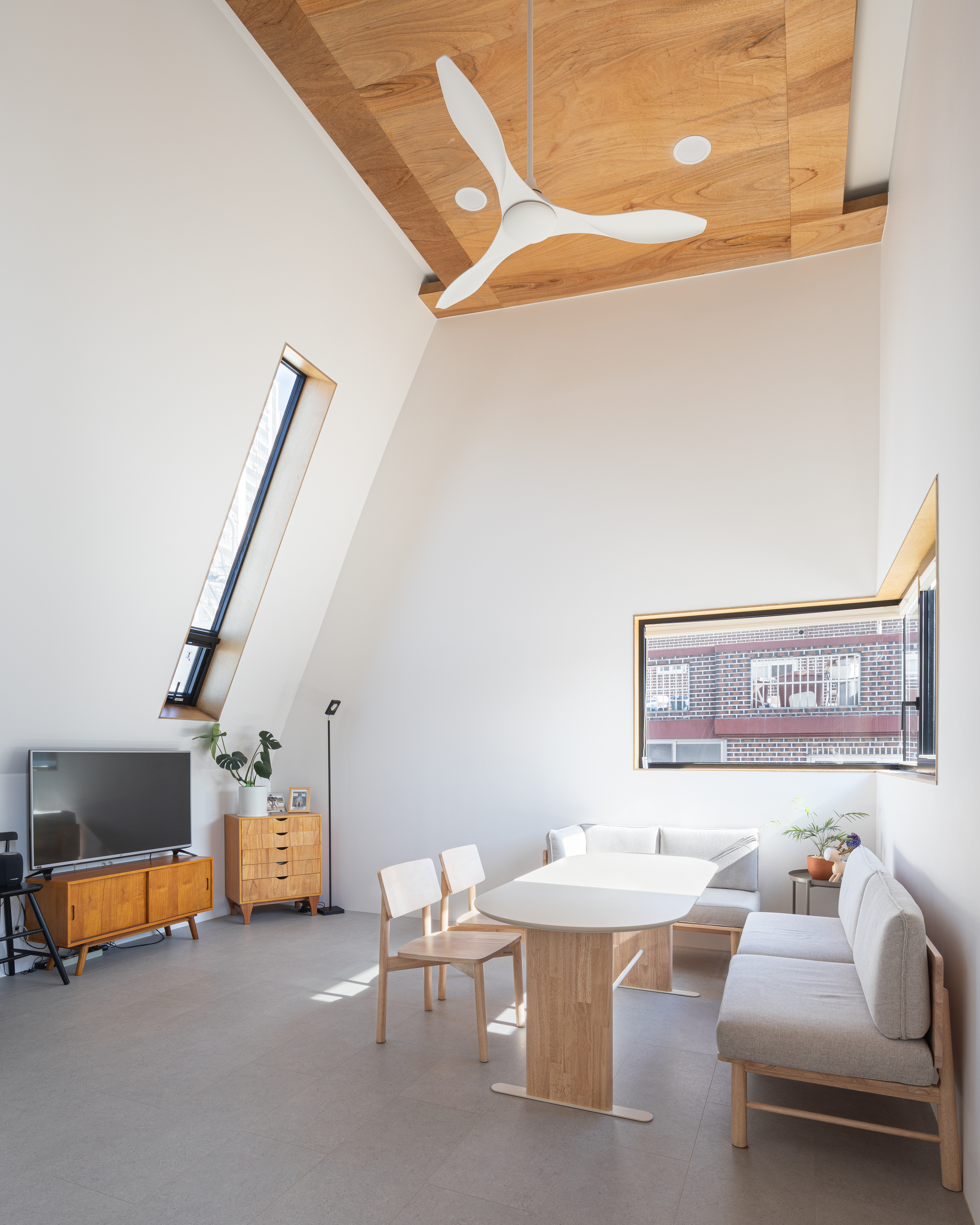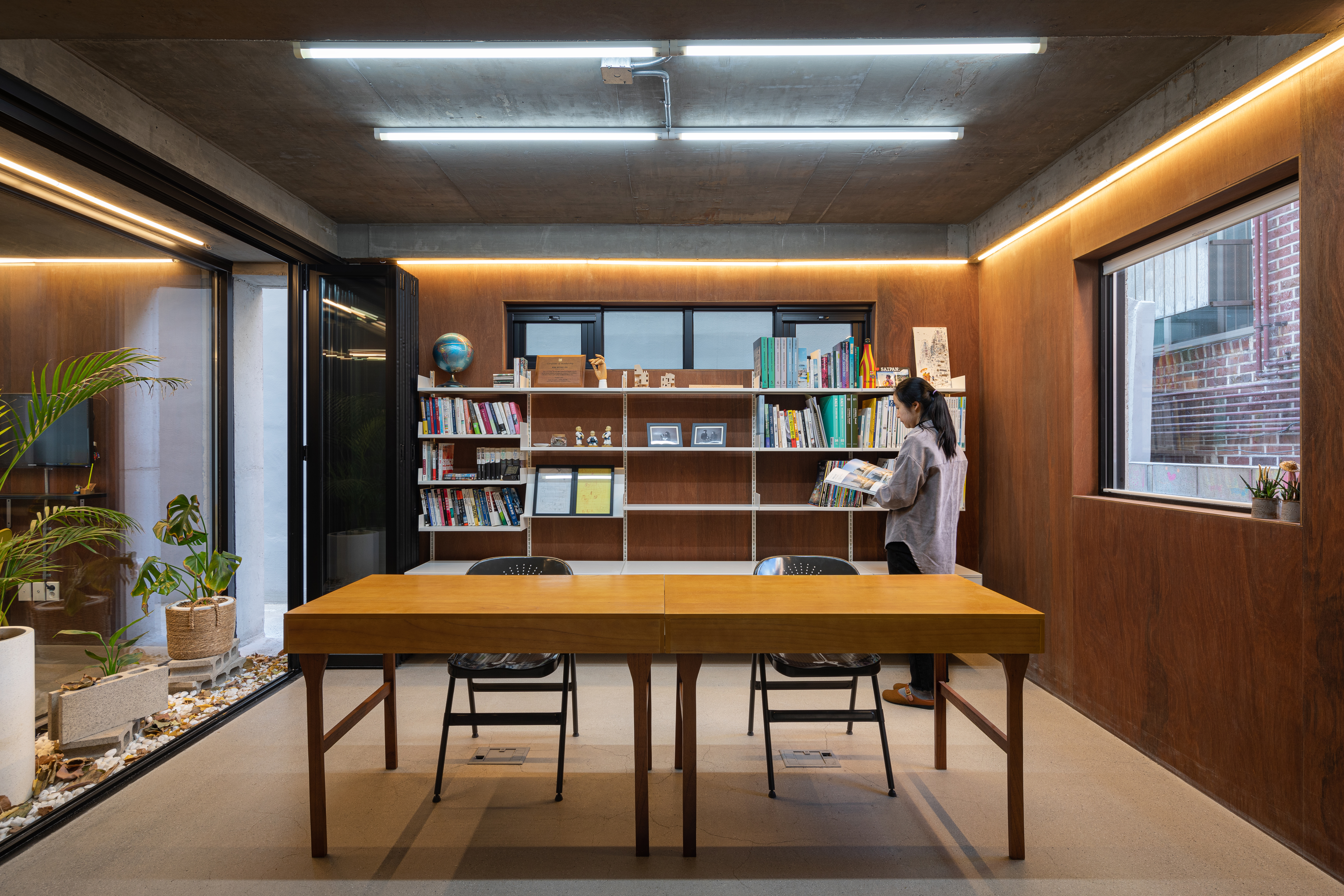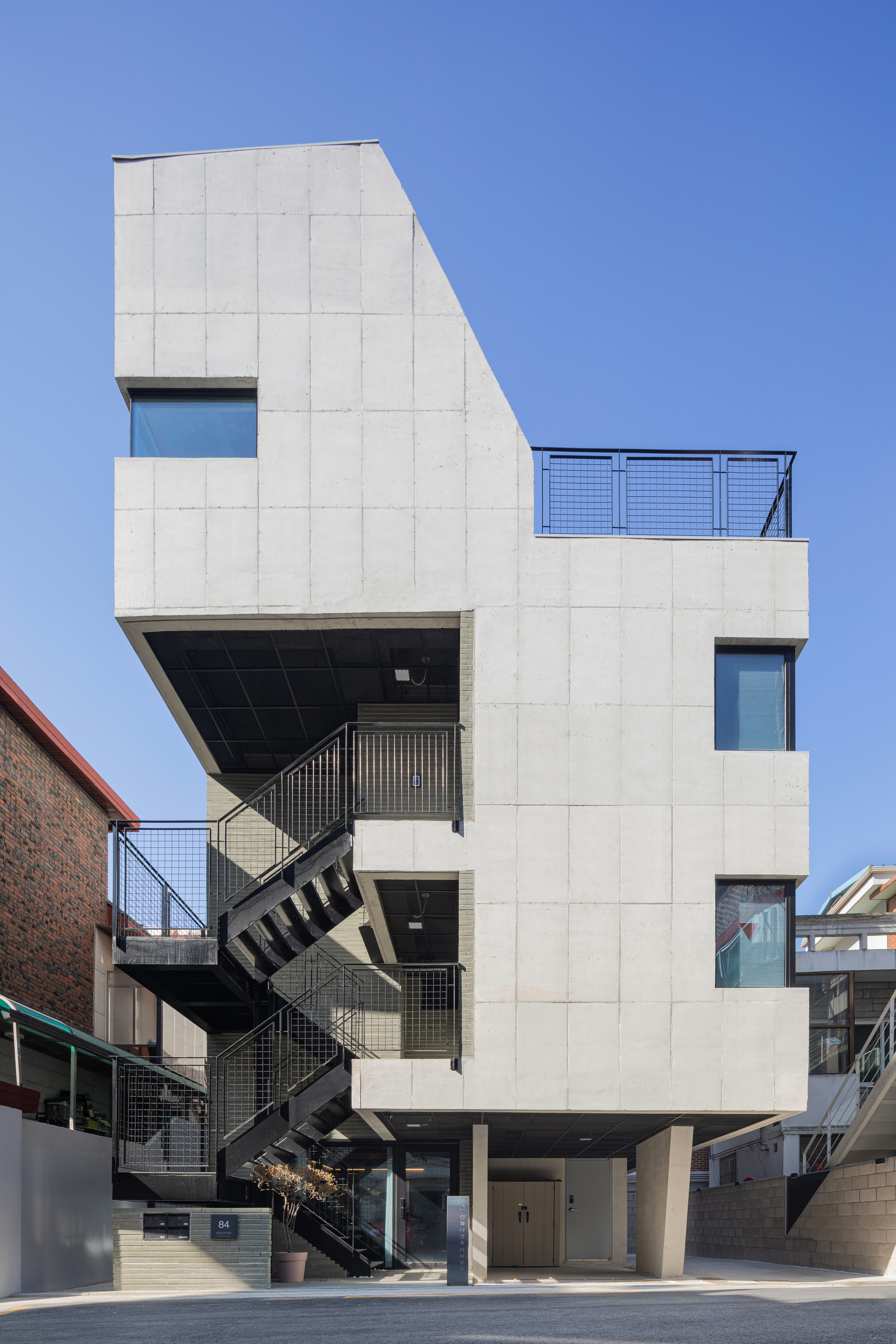 1층 근린생활시설 남쪽으로는 외부 환경 유입과 실내 환기 순환을 고려하여 슬릿한 오픈부를 만들어주었다. 그리고 마감재인 노출콘크리트와 시멘트 벽돌의 일차적인 물성을 건물 외부와 내부에서 이질감 없이 연계할 수 있도록 표현하였다. 단층의 투룸과 복층의 투룸으로 형성된 2층 임대 세대는 동네의 특성상 원룸의 수요보다는 신혼 부부나 젊은 세대의 수요가 많을 것이라 예상하였다. 건축주 세대인 3층 일부와 4층은 내부 계단을 둔 복층으로 계획하여 침실과 욕실을 콤팩트하게 3층에 계획하고, 거실과 주방과 옥상을 연계한 4층은 가족들이 온종일 머물 수 있도록 여유 있게 계획했다. 그리고 공용부는 법적인 최소의 면적을 유지하되 동네로 향한 생동감 있는 모습을 연출할 수 있도록 오픈된 철제 계단으로 계획하였다.