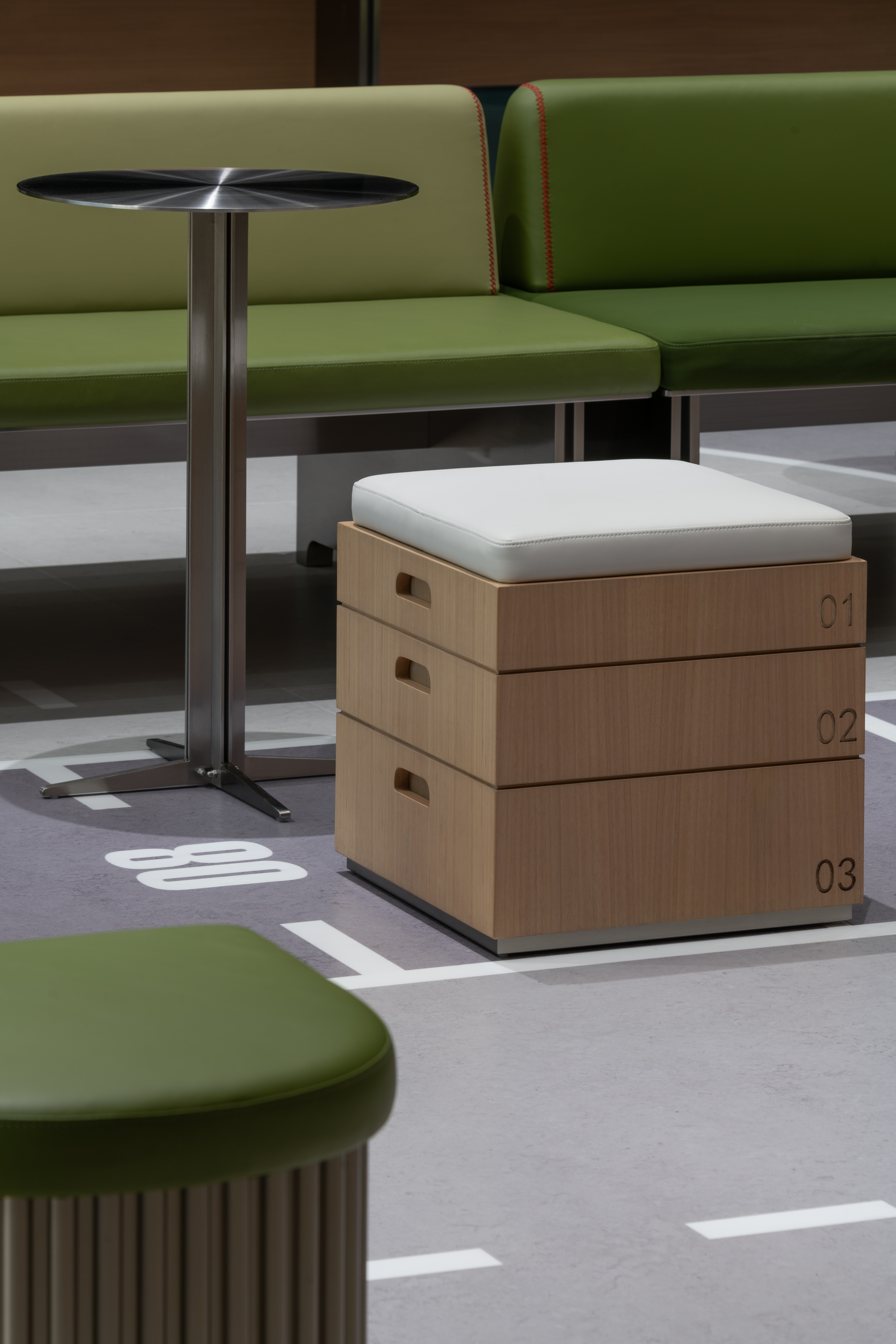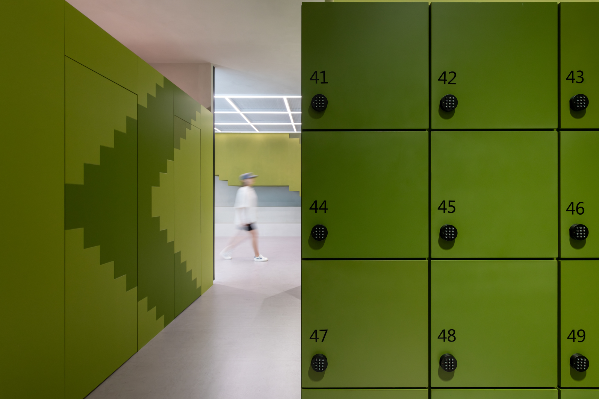 Complementing the colourful spaces, the atrium and breakout areas are lined in neutral gray and wooden tones to exude a relaxed atmosphere. Combining rock-climbing, basketball and boxing, the high-ceiling space is also equipped with a central stage and a 15.5m x 6.5m LED screen for group classes and game broadcast. Echoing the circles in a basketball court where a game is reset, the two semi-circular balconies stick out as “blanks” for observation or pause among surrounding actions. Besides colouring the “dopamine blocks”, the design employs graphic patterns to express a sense of vitality. Gradient metal ceiling grid changes density according to activity level; woodwool panels divided into pixels draw arrows or graphs on walls; the same progressive form recurs in the staircase design. The café continues the graphics of dynamic order in the ceiling light grid. Sports elements are integrated in the furniture design: green sofa garnished in red stitches mimicking those in a baseball, table legs simulating the weight found in strength equipment; wooden stool takes on the appearance of jumping boxes.