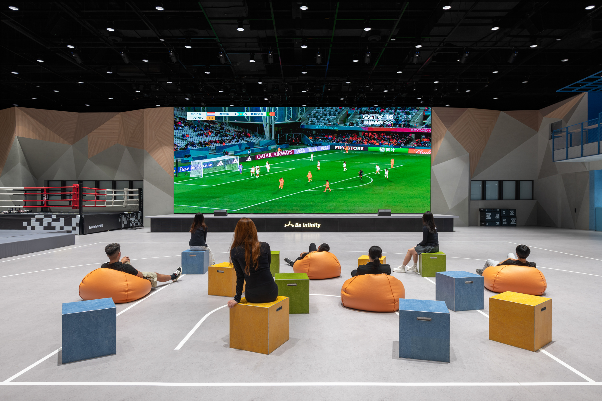 스포츠와 엔터테인먼트를 결합한 비인피니티(BeInfinity)는 트레이닝, 플레이, 휴식, 온라인 콘텐츠 공유 등 다양한 요구를 충족하는 플랫폼이다. 선명한 색상과 친근한 소재, 명확한기하학적 질서를 갖고 있는 룩스튜디오(Lukstudio)는 스포츠맨십의 아름다움을 즐기면서 모든 방문객에게 활기차고 창의적인 자아를 일깨워주는 유쾌한 탈출구가 되어 준다. 비디오 게임 테트리스와 색상 심리학에서 영감을 얻어 각 활동 영역마다 "도파민 블록"으로 설계되어 있고 각각의 특정 분위기를 갖는다. 에너지 넘치는 색인 레드는 장비 체육관과 짝을 이룬다. 차분한 느낌의 파란색은 공기총과 야구 타격과 잘 어울리는 배경이다. 야구장에는 즐거운 노란색이 적용되었다. 감정과 반응을 불러일으키는 것과 더불어 시각적 접근 방식은 길 찾기에도 도움이 되며 방문객에게 명확한 탐색이 가능하도록 해준다.
