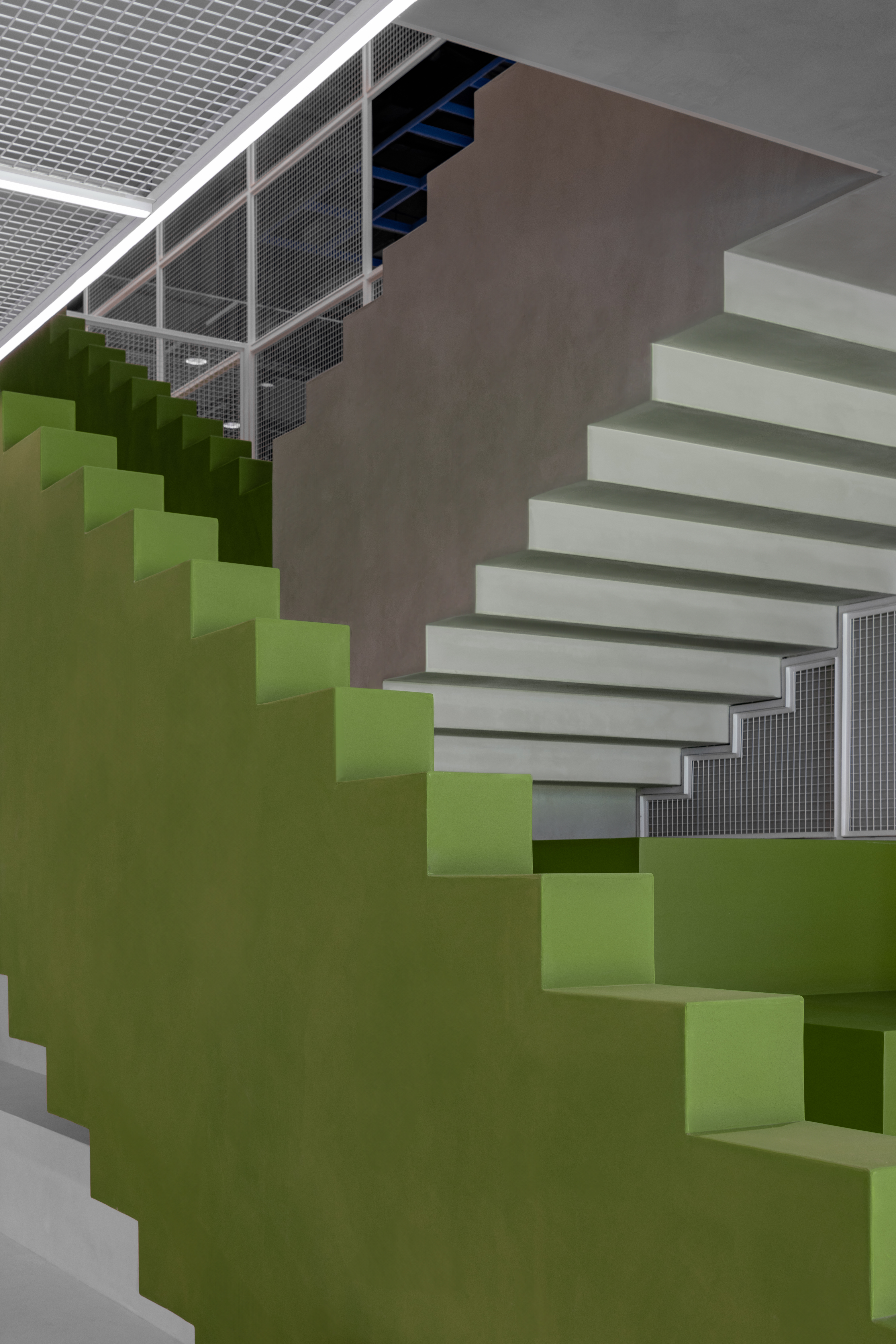 Complementing the colourful spaces, the atrium and breakout areas are lined in neutral gray and wooden tones to exude a relaxed atmosphere. Combining rock-climbing, basketball and boxing, the high-ceiling space is also equipped with a central stage and a 15.5m x 6.5m LED screen for group classes and game broadcast. Echoing the circles in a basketball court where a game is reset, the two semi-circular balconies stick out as “blanks” for observation or pause among surrounding actions. Besides colouring the “dopamine blocks”, the design employs graphic patterns to express a sense of vitality. Gradient metal ceiling grid changes density according to activity level; woodwool panels divided into pixels draw arrows or graphs on walls; the same progressive form recurs in the staircase design. The café continues the graphics of dynamic order in the ceiling light grid. Sports elements are integrated in the furniture design: green sofa garnished in red stitches mimicking those in a baseball, table legs simulating the weight found in strength equipment; wooden stool takes on the appearance of jumping boxes.