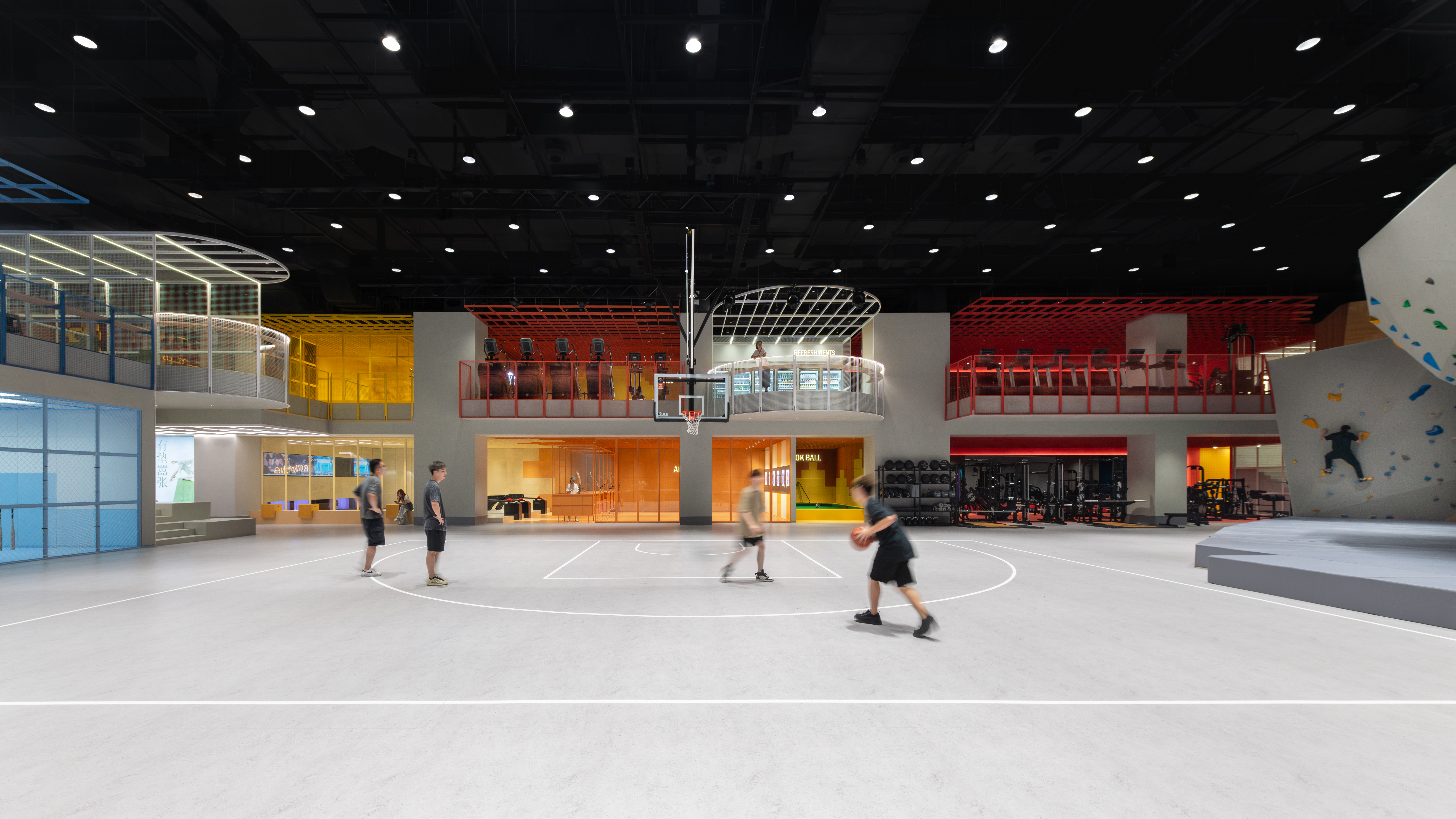 다채로운 공간을 보완하며 아트리움과 휴식 공간은 뉴트럴 그레이와 나무 톤으로 되어 있어 편안한 분위기를 자아낸다. 암벽 등반, 농구, 복싱하기에 적합한 높은 천장이 있는 공간은 중앙 무대와 그룹 수업 및 게임 방송을 위한 15.5m x 6.5m LED 스크린도 마련되어 있다. 농구 코트에 원이 반복해서 생기면 게임이 재설정된다. 두 개의 반원형의 발코니는 주변 동작을 관찰하거나 일시 중지할 수 있는 곳으로 돌출되어 있다. ‘도파민 블록' 컬러링 외에도 디자인에 그래픽 패턴을 활용해 생동감을 주었다. 그라데이션 금속 천장 그리드는 활동 수준에 따라 밀도를 다르게 하였다. 픽셀로 나누어진 목모 패널은 벽에 화살표나 그래프를 그려낸다. 계단은 점진적 형태가 반복되도록 디자인 되었다. 카페는 천장 조명 그리드에서 역동적인 질서의 그래픽이 이어진다. 야구공을 모티브로 하여 녹색 소파에 빨간색으로 스티치를 하였고, 근력 장비의 무게를 시뮬레이션해주는 것 같은 테이블 다리와 점프 박스 모양을 하고 있는 나무 스툴처럼 가구 디자인에도 스포츠 요소를 넣었다.
