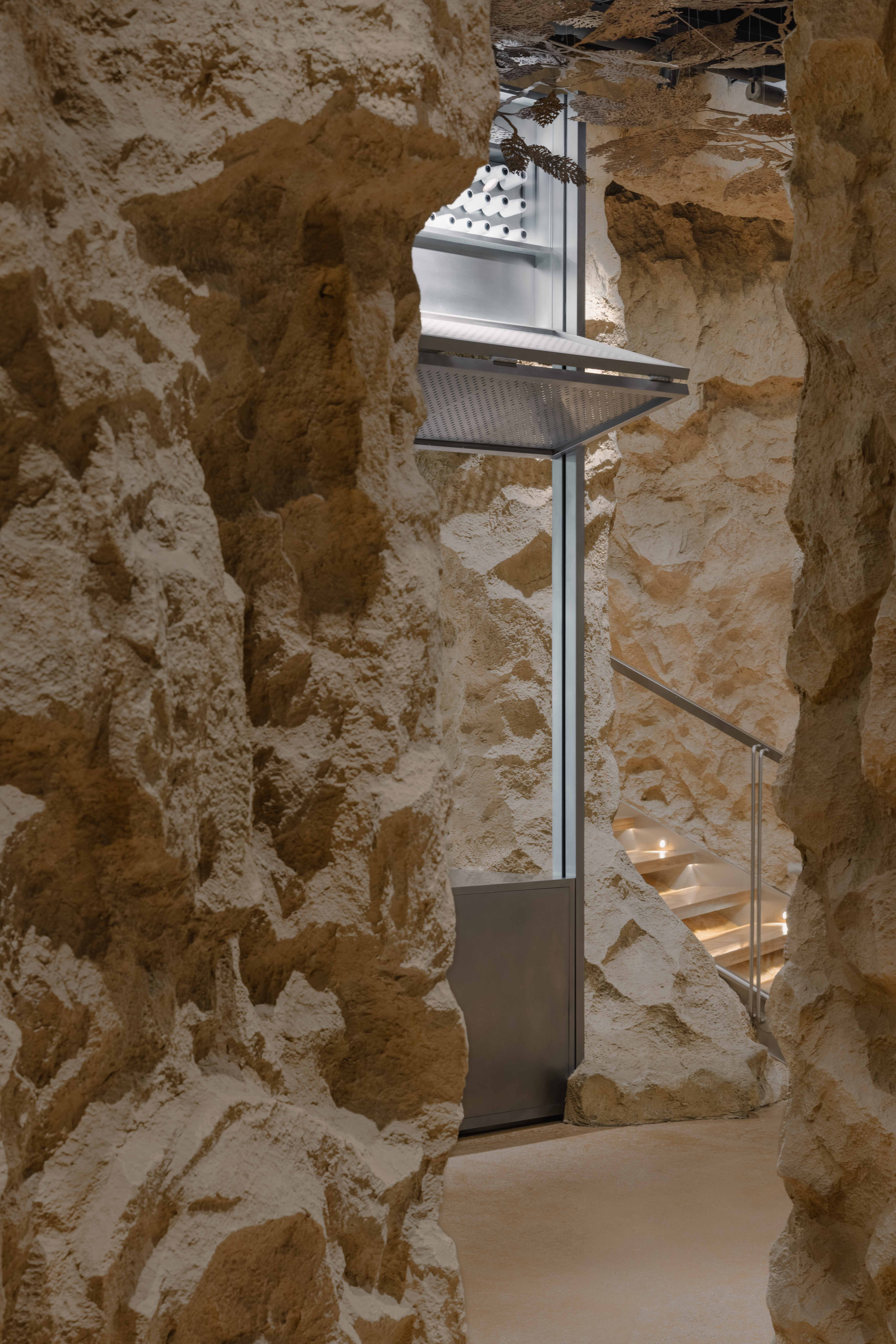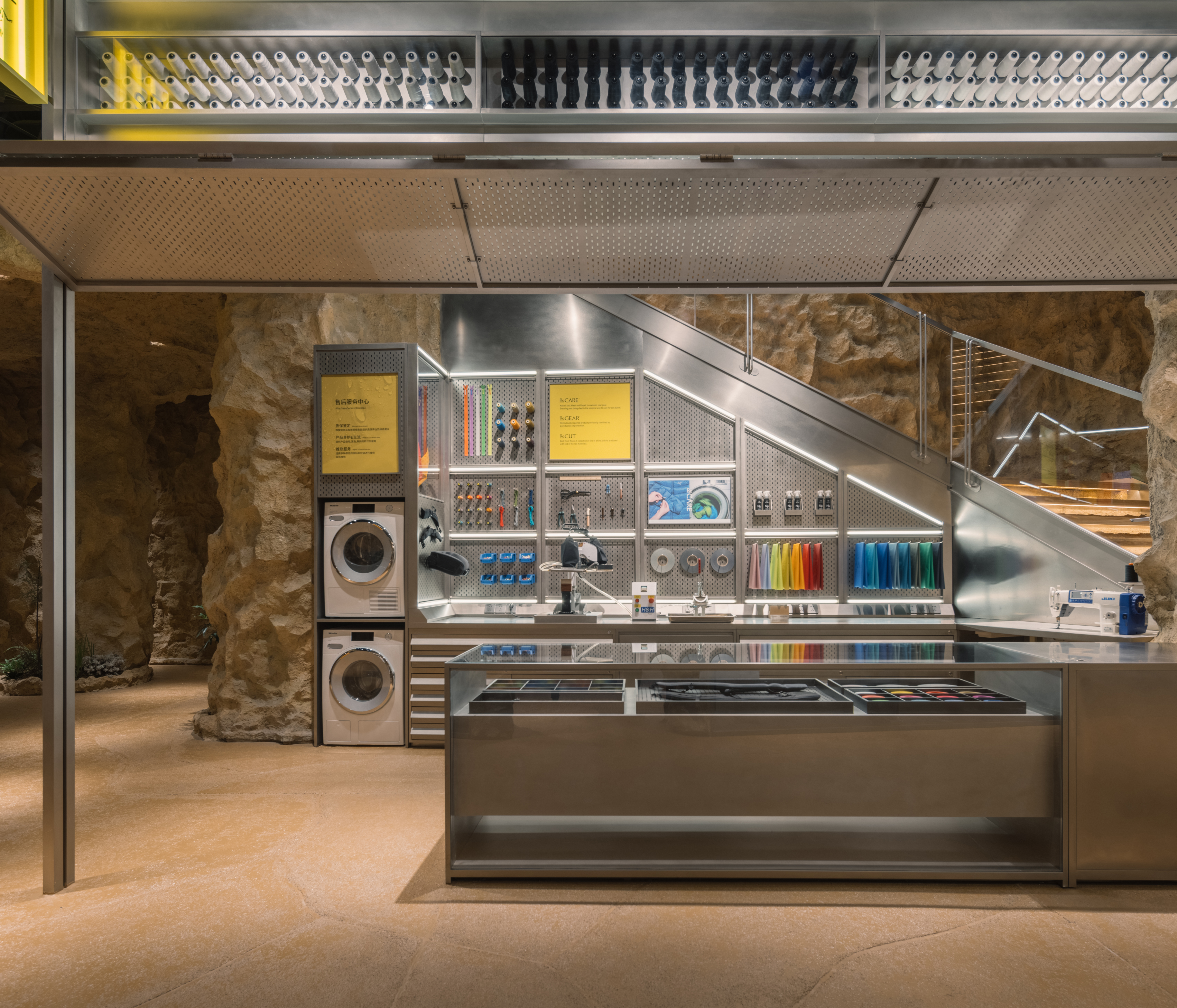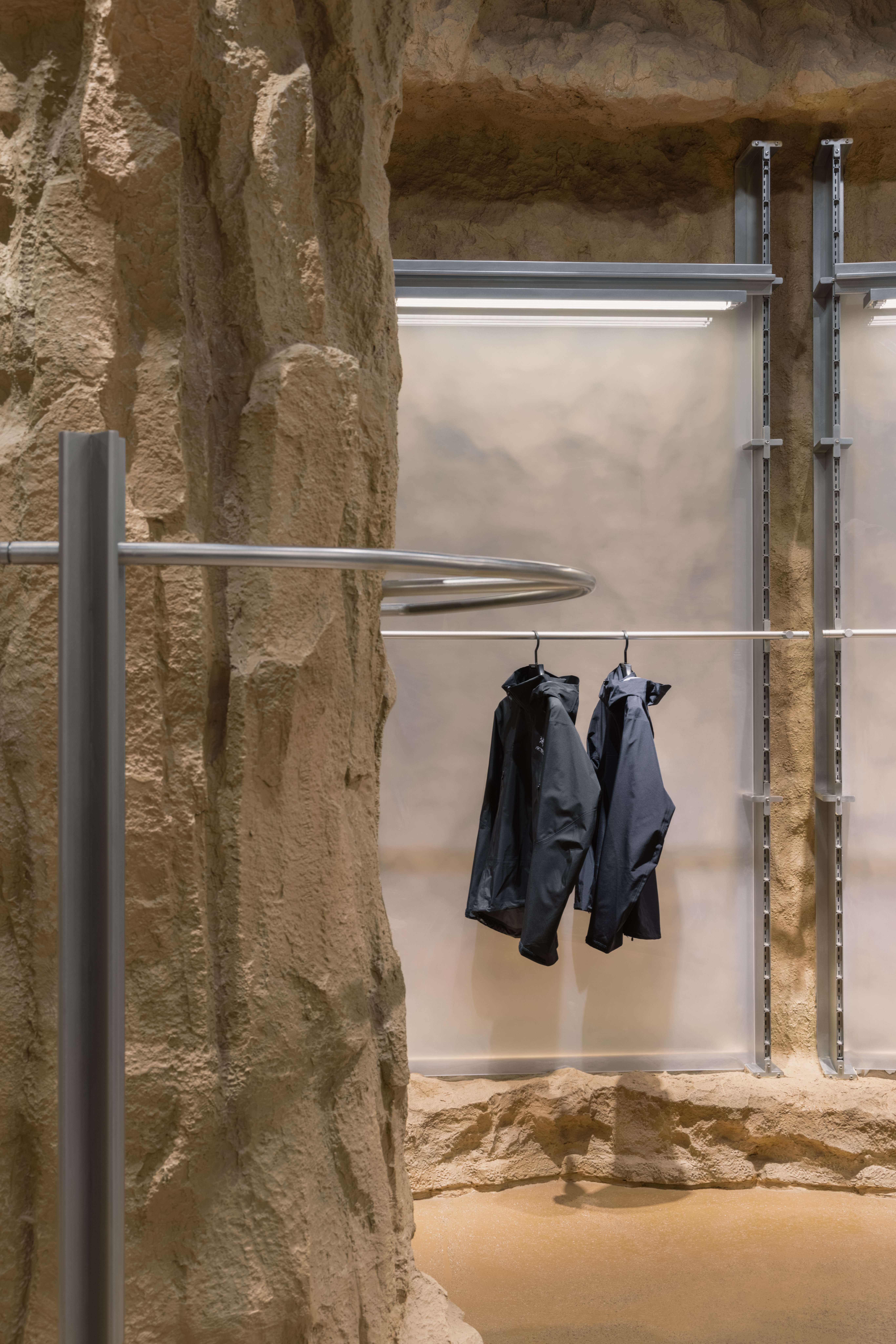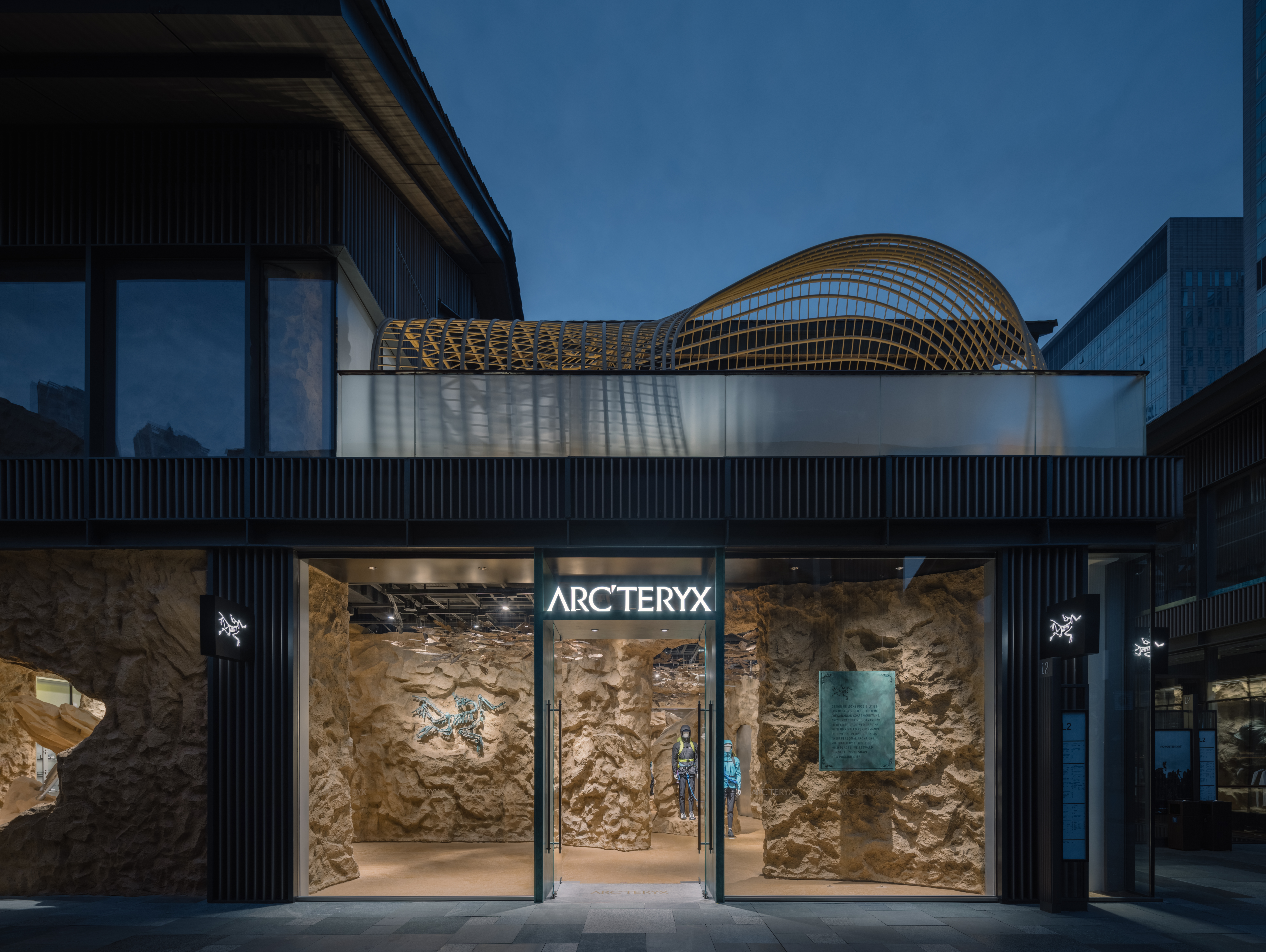 청두 타이쿠리에 있는 새로운 아크테릭스 매장은 고대의 산 바위들과 뛰어난 거대한 대나무 구조로 볼거리를 가지고 있다. 궁금증을 자아내는 디자인을 가진 매장은 새로운 가능성을 탐험하면서 고객들을 바다와 시간을 가로질러 여행하게 한다. 그것은 현재의 관점에서 미래를 바라보면서 과거를 엿보는 것을 제공하는 독특한 존재이다. 자연과의 공생이라는 브랜드의 콘셉트와 브랜드의 탄생지인 밴쿠버의 산악 경관, 풍요의 땅으로 유명한 쓰촨성의 독특한 문화 및 지리적 맥락을 접목한 디자인이 매장에 반영되어 있다. 맞춤형 카운터 측면에 아크테릭스 화석 로고가 새겨져 있고, 3층 테라스와 2층 커피 공간까지는 ‘동굴 탐험’을 하는 것 같은 분위기로 조성되어 있다. 이것은 브랜드 기원에 따라 디자인팀이 화석이 발견된 자연 동굴을 연상시키는 분위기로 매장을 디자인한 결과다. 이중 높이의 공간 상단에 작은 개구부가 조각되어 있으며, 부드러운 대낮 같은 광채를 드리우는 조명이 설치되어 있다. 질감이 있는 페인트, 샌드블라스팅 스테인리스 스틸, 페어페이스 콘크리트 벽 코팅 등을 이용하여 상품 전시 공간이 마련되어 있다.