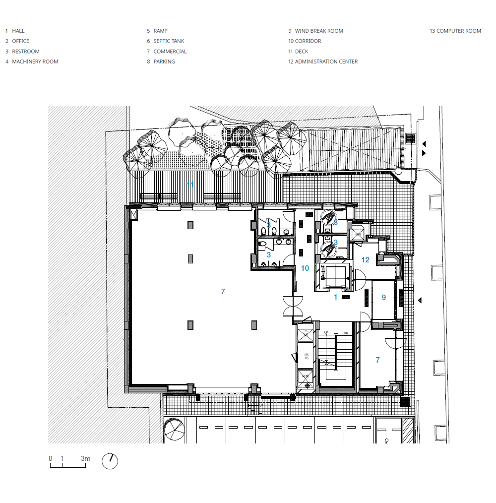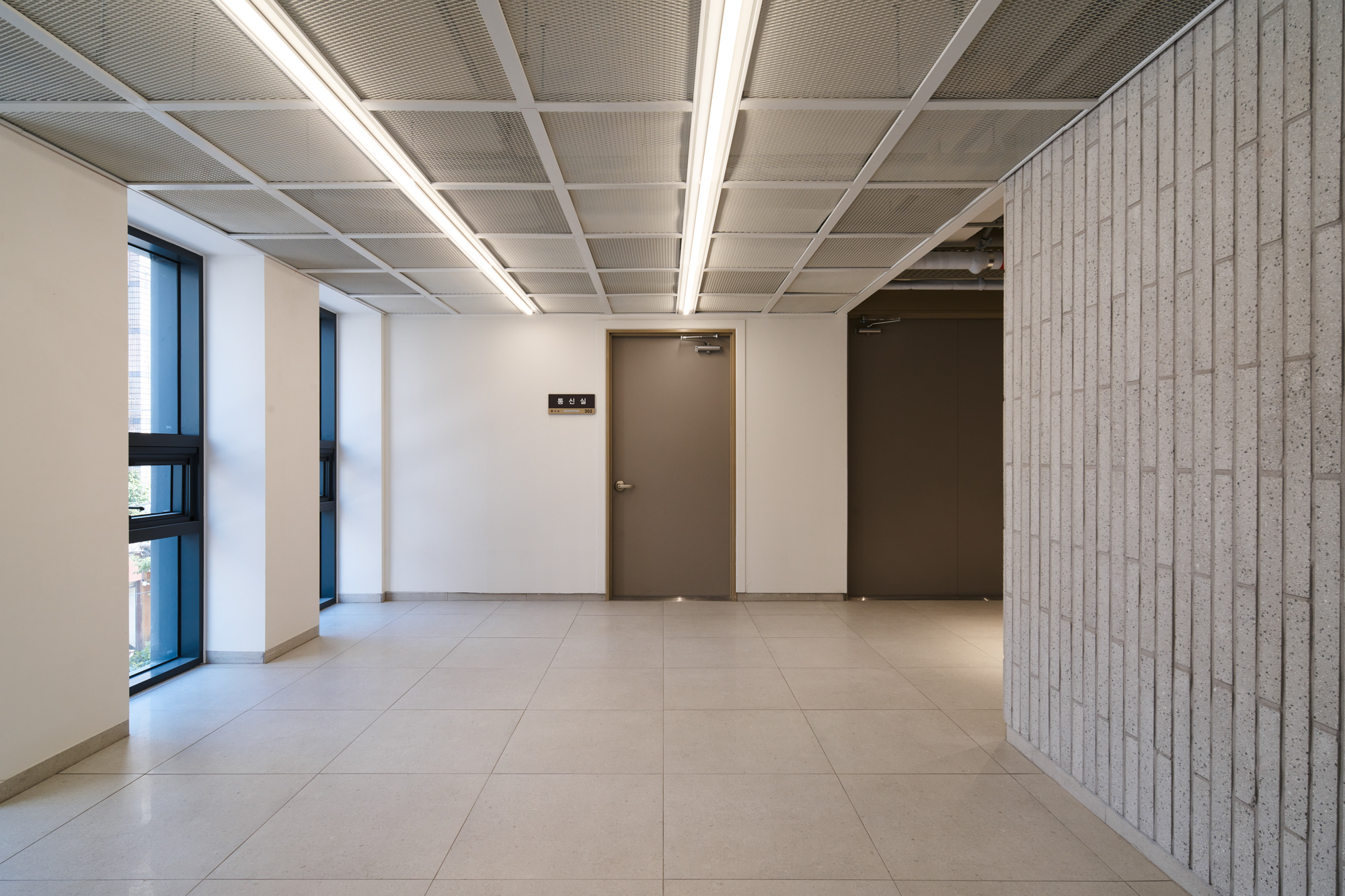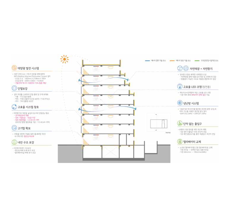 먼저 에너지 효율 향상을 위해 건물 외피 전체적으로 외단열을 적용하였고, 외장 마감재는 모던한 롱 브릭타일을 습식으로 부착하여 열교를 최소화하였다. 향과 무관하게 설치된 노후화 된 수평창을 전면 철거하고 단열과 기밀 성능이 확보된 시스템 창호을 적용하였다. 이로 인해 창 면적 축소, 개구부 위치 조정 그리고 개폐면적 확대가 가능해지면서 실내 열적 쾌적성과 자연 환기를 향상시킬 수 있었다. 이 이외에도 15.05kW의 태양광 모듈을 건축물 일체형 후면 통풍 방식 (BAPV, Building Attached Photovoltaic System)으로 남동측 입면에 부착함으로써 에너지를 직접 생산할 수 있는 건축물이라는 이미지를 부여하였다. 현재의 법적 기준을 만족시키기 위해 엘리베이터실과 계단실 벽체의 두께를 보강하면서 내진 성능를 확보하였고, 구조적 안정성이 확보된 상황에서 기존 승강기를 장애인 탑승 가능한 승강기(15인승)로 교체하였다. 기존 건축물의 층고(2,400㎜)가 매우 낮은 점을 감안하여 노출 천정으로 계획하되 스프링쿨러, GHP/EHP, EHP 배수배관 등은 질서있는 배열과 화이트 색상으로 마감하면서 내부 공간의 개방성도 확보하였다. 건물 주변에는 조경 및 휴게데크를 설치하고 옥상에는 옥상정원 이외에도 장기적으로 태양광을 추가 설치할 수 있는 면적도 계획하였다.