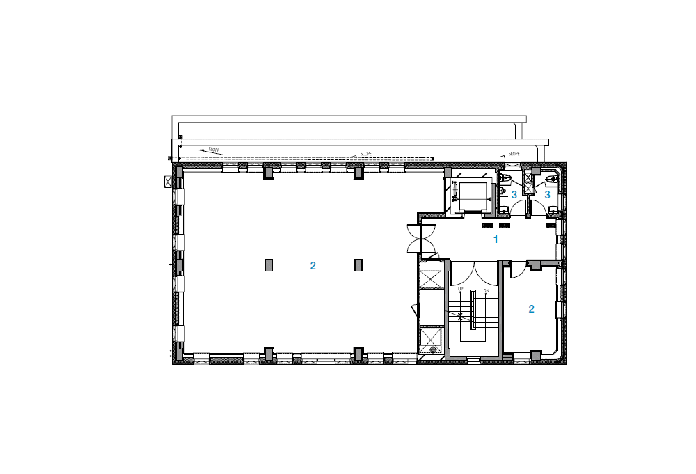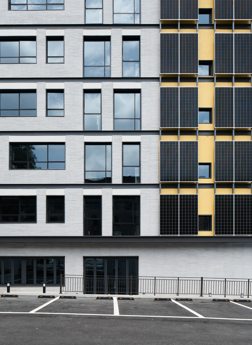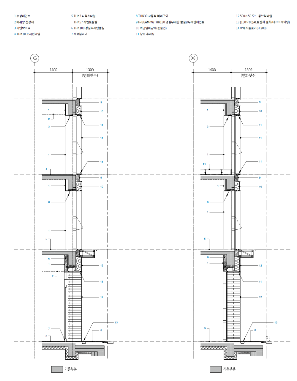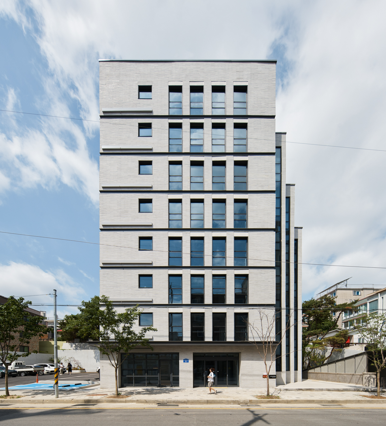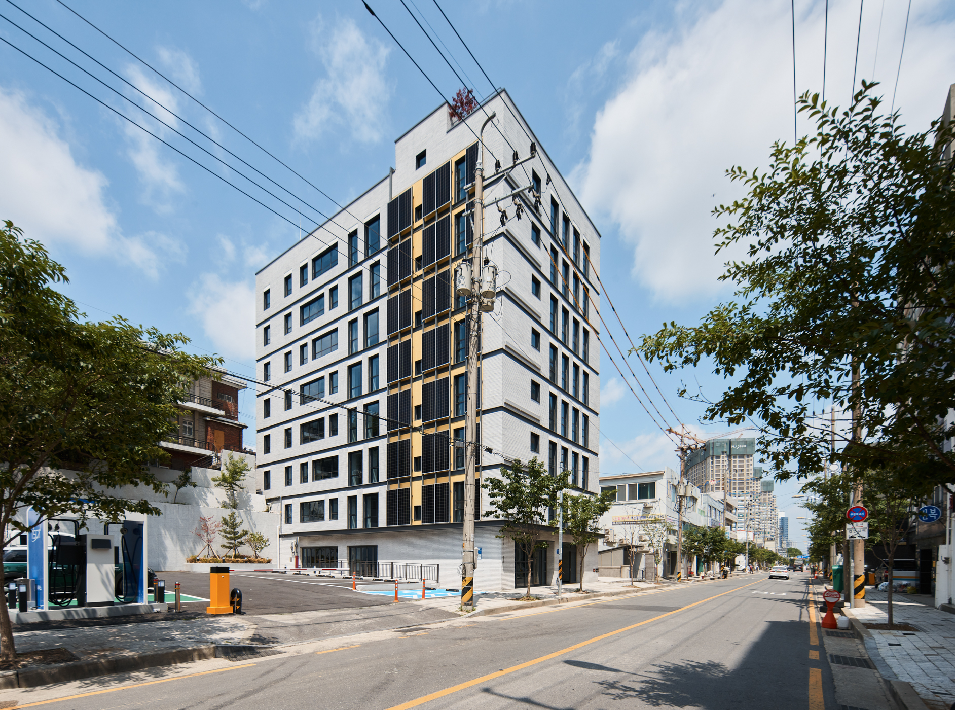 먼저 에너지 효율 향상을 위해 건물 외피 전체적으로 외단열을 적용하였고, 외장 마감재는 모던한 롱 브릭타일을 습식으로 부착하여 열교를 최소화하였다. 향과 무관하게 설치된 노후화 된 수평창을 전면 철거하고 단열과 기밀 성능이 확보된 시스템 창호을 적용하였다. 이로 인해 창 면적 축소, 개구부 위치 조정 그리고 개폐면적 확대가 가능해지면서 실내 열적 쾌적성과 자연 환기를 향상시킬 수 있었다. 이 이외에도 15.05kW의 태양광 모듈을 건축물 일체형 후면 통풍 방식 (BAPV, Building Attached Photovoltaic System)으로 남동측 입면에 부착함으로써 에너지를 직접 생산할 수 있는 건축물이라는 이미지를 부여하였다. 현재의 법적 기준을 만족시키기 위해 엘리베이터실과 계단실 벽체의 두께를 보강하면서 내진 성능를 확보하였고, 구조적 안정성이 확보된 상황에서 기존 승강기를 장애인 탑승 가능한 승강기(15인승)로 교체하였다. 기존 건축물의 층고(2,400㎜)가 매우 낮은 점을 감안하여 노출 천정으로 계획하되 스프링쿨러, GHP/EHP, EHP 배수배관 등은 질서있는 배열과 화이트 색상으로 마감하면서 내부 공간의 개방성도 확보하였다. 건물 주변에는 조경 및 휴게데크를 설치하고 옥상에는 옥상정원 이외에도 장기적으로 태양광을 추가 설치할 수 있는 면적도 계획하였다.