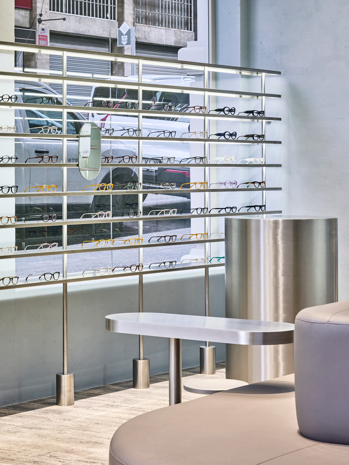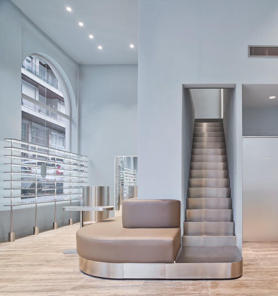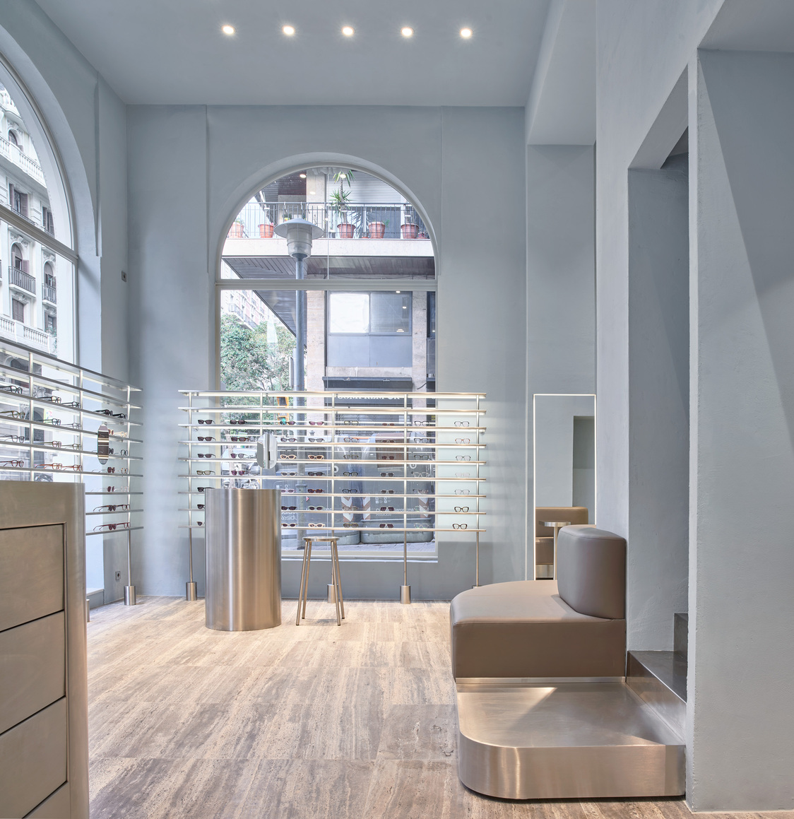 The walls of the space have been coated with a historical lime mortar in a bluish-gray shade. An architectural feature that alludes to the collective imaginary association with Barcelona's high society and its "blue blood," as traditionally, this sector has historically occupied this part of the city. Tubular elements of stainless-steel integrate as monolithic blocks for furniture, mirrors, shelves and stairs, maintaining visual harmony and coherence. The nobility of the space extends to the silver travertine floor, where its grayish tone dialogues with the vertical surfaces, ceiling and steel furniture.