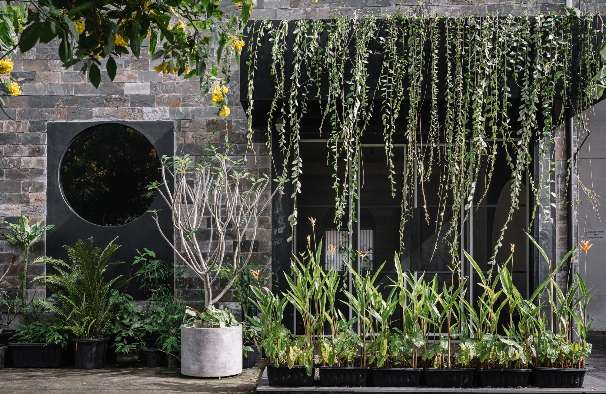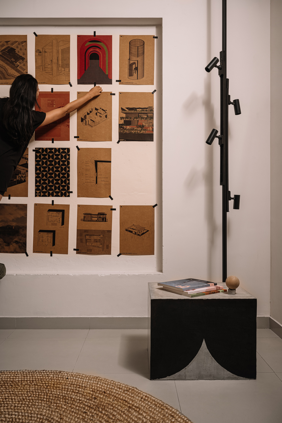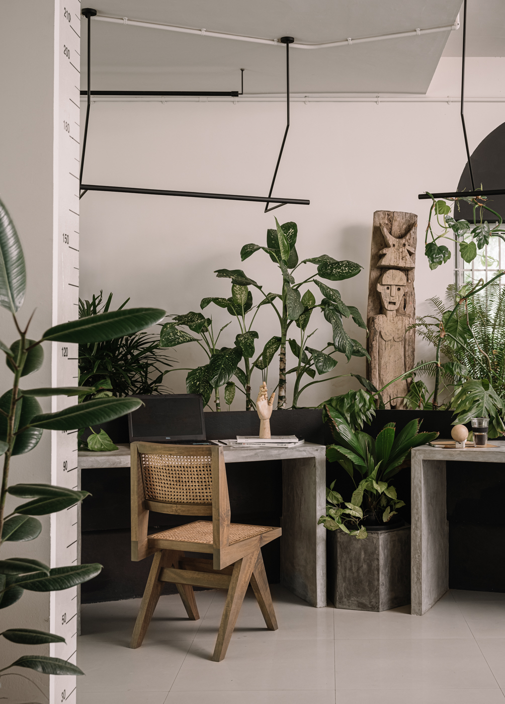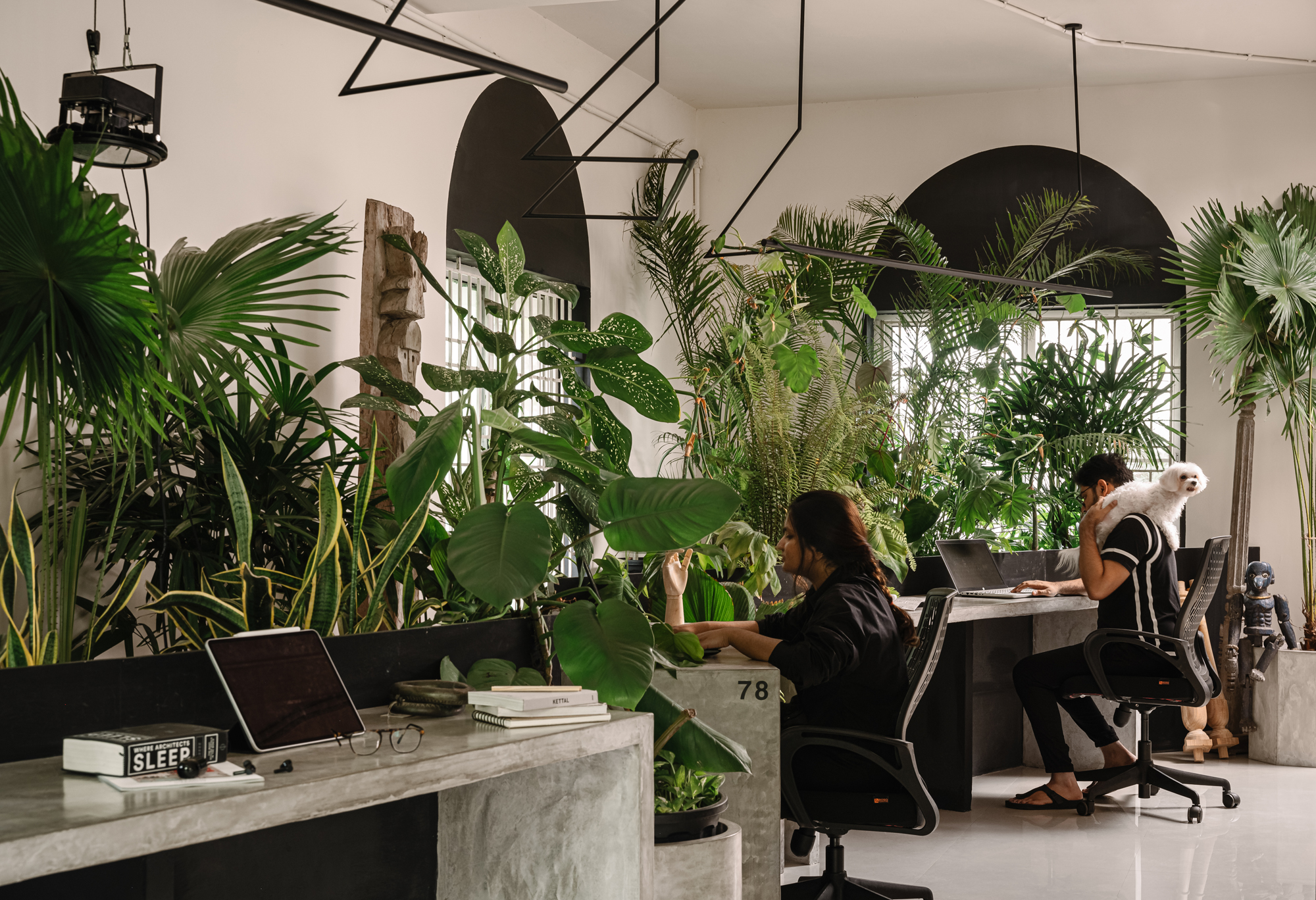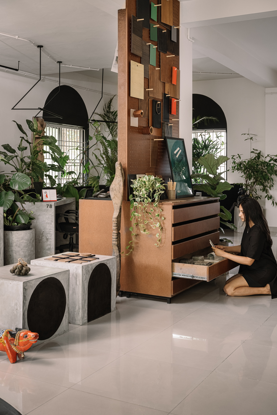 Materials were thoughtfully curated to reflect this aesthetic, with a focus on sustainability and waste management. Cement concrete, High-Density Fibreboard, and mild steel rods were selected for their versatility, durability, and environmental benefits. The sample storage board, made from HDF, is a central feature representing the studio's commitment to sustainable design. It serves as a dynamic, tactile centerpiece, embodying the studio's ethos of innovation, inspiration, and impact. The studio's approach to materials, like using HDF for tabletops and showcasing its inherent beauty, emphasizes sustainability and waste reduction. This creative integration of over 100 potted tropical local plant species not only enhances the well-being of the members but also contributes to privacy, mood elevation, air quality, and natural sound absorption. The studio features unique 240 cm by 120 cm ferrocement tables with a cement oxide finish, promoting collaboration while allowing private workspaces. The design minimizes the use of air conditioning by leveraging natural ventilation and air-purifying plants, significantly reducing energy consumption.