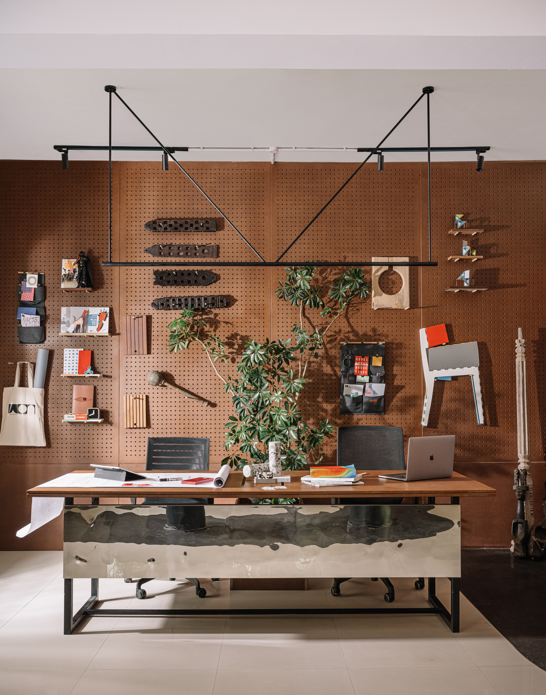 The design team explored various layout options to maximize the potential of the space, ultimately settling on an open-plan arrangement that encouraged interactions and collaboration. The studio is divided into work and social zones, reflecting the modern blend of work and personal life. The peg board wall, a dynamic feature in the atelier space, facilitates constant change and adaptation. This layout also facilitated cross-disciplinary learning, aligning with the studio's philosophy of continuous growth.