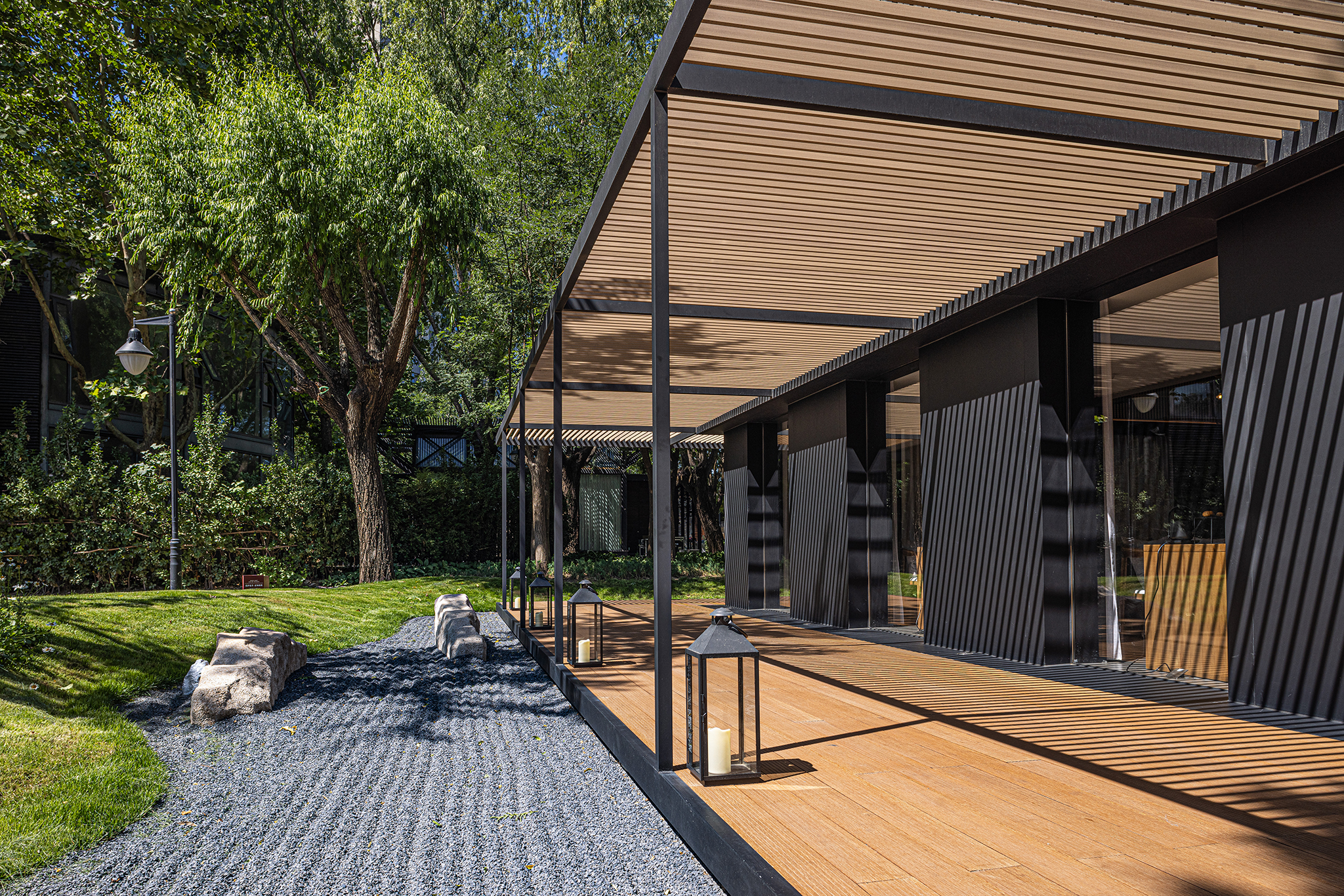 블루레이크 티하우스는 리두 가든(Lidu Garden)의 북문으로 들어서서 서측으로 펼쳐진 호수를 따라 길게 이동하여 만날 수 있는 위치에 자리잡고 있다. 북측에 마련된 새로운 문이 열리면, 기존에 설치되었던 남측 문은 서비스 입구로 사용하여 방문객에게 ‘입장식’의 경험을 부여한다. 구불구불한 길은 사람들이 긴 시간 동안 걸으며 티하우스에 대한 감정을 느끼고 이어질 경험에 대한 준비를 할 수 있는 여유를 준다. 건물 자체에 초점을 맞춘 새로운 입면 디자인은 주변의 경관을 하단으로 밀어내어 건물과 수평이 되고, 바깥으로 밀려나 주요 구조물 사이의 부드러운 분리를 만들어냈다. 건물에 설치된 2m 폭의 플랫폼은 복도의 형태로 뻗어 있으며, 그 주변으로는 일본식 정원처럼 자갈과 물, 돌이 고리를 이루어 마치 호수 위를 떠다니는 섬과 같은 자연적인 풍경을 제공한다. 건물의 코어에는 하늘의 빛을 투과시키는 열린 유리 지붕으로 이루어져 풍부한 자연광을 건물 안으로 들이며, 벽면에 설치된 5개의 창문은 빛을 통해 야외의 풍경과 더불어 건물 내의 사람과 자연, 공간을 엮는 역할을 한다. 베이지, 그레이, 우드톤의 내부 마감, 나무 그릴로 단단히 연결된 내부의 계단, 불규칙적인 배열의 철망 램프와 같은 요소는 단순하면서도 강력한 구성 요소가 되어 아늑하고 쾌적한 실내 공간의 분위기를 만든다.