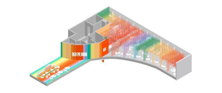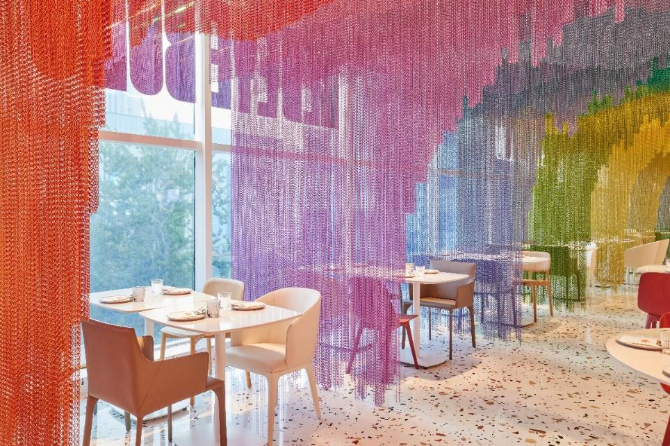 금속 커튼은 코모레비처럼 울퉁불퉁하게 흩어져 공간을 정의하면서도 다층적인 색의 그라데이션을 드러낸다. 반투명한 질감과 저밀도의 패턴은 식사 공간에 프라이버시를 제공하면서도 공간의 시각적인 투명성과 개방성은 유지하여 즐거운 공간의 상호작용을 일으킨다. 산란광과 맞물린 색조는 층층적이고 변형적인 효과를 발생시켜 공간과 얽히고설켜 사용자와 상호작용한다. 곡선 형태는 때로는 땅 위를 맴돌며, 때로는 땅에 닿으며, 손이 닿는 지평선에서 무지개처럼 보인다. 레스토랑은 낮에는 태양 광선의 색상을 상징하고 밤에는 도시 경관에 활기찬 색상을 선보인다.