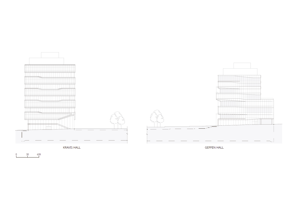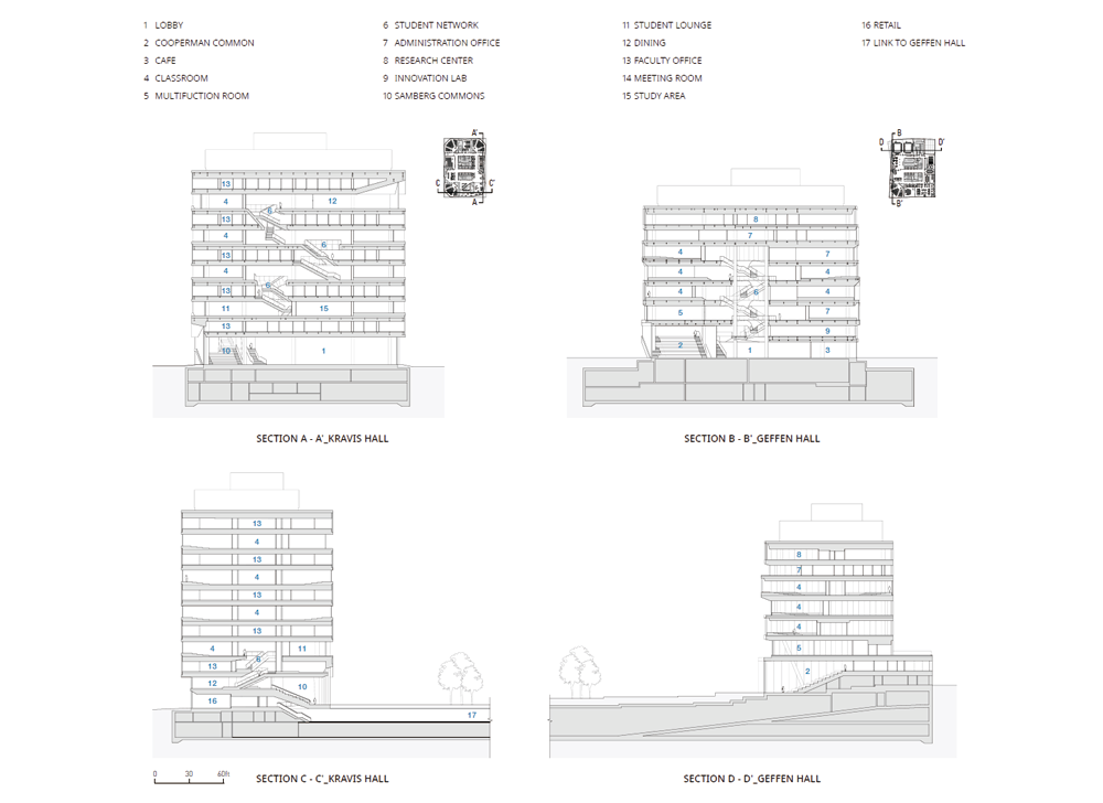 11층 규모의 클라비스홀은 학생 학습 공간과 교직원 사무실으로 이뤄지며, 8층 규모의 게펜홀은 학습 공간을 중심으로 행정 사무실이 교대로 섞여 있다. 각각 섞인 층은 건축물 파사드에 영향을 주었으며, 사용자들과 용도에 맞춘 시스템으로 건축물을 표현 수단이 된다. 학교 내부 공간은 수직으로 뻗어나가는 순환망과 협력적 학습 환경이 교차되는 공간으로 구성되어 있으며, 활기찬 학업에 대한 열정, 상호적인 영향력, 다양한 연속성을 보여준다. 클라비스홀은 360도로 노출되어 있으며, 근처의 허드슨 강을 바라볼 수 있다. 이와 동시에 게펜홀은 인근 지역의 도시 구조와 맨해튼빌 기본 계획의 중간 블록 보행자 축과의 강력한 연결 고리의 역할을 한다. 모든 강의실에서는 도시 풍경을 조망할 수 있다. 또한 학교 전통에 따라 지역 기업가를 후원하는 10년 역사를 기반으로, 게펜홀 2층에 마련된 콜롬비아-할렘 중소기업 개발 센터는 새로운 전용 공간을 포함하여 지역 사회에서도 환영받고 있다. 공원과 지역 상품을 특징으로 하는 카페를 포함한 새로운 상점들도 들어서서 콜롬비아 경영 대학원과 주변 지역을 더욱 가깝게 연결하고 있다.