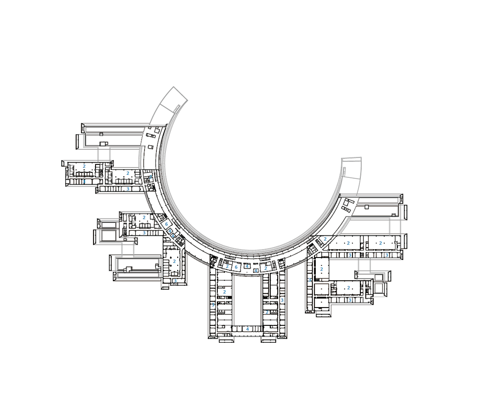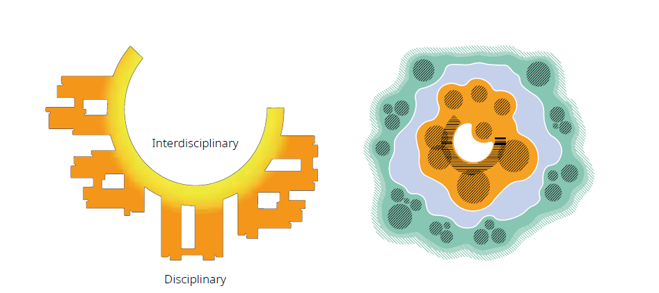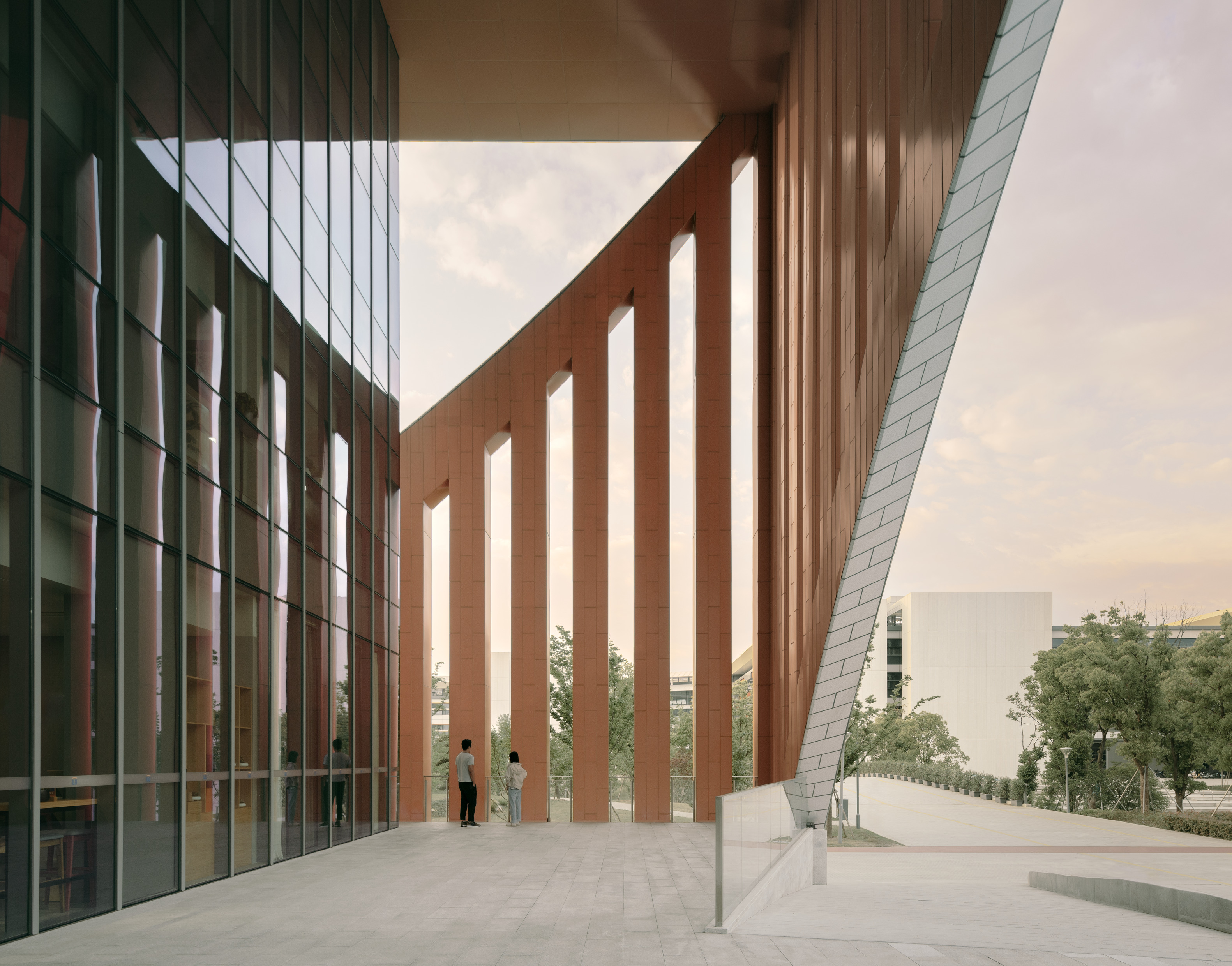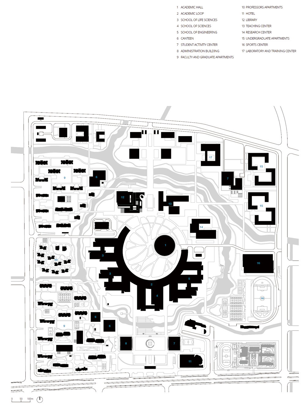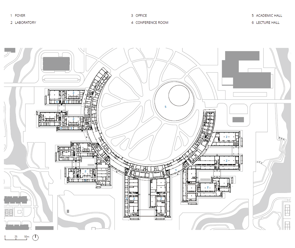 건물은 프리캐스트 콘크리트 틀로 엇갈린 직사각형 유리로 구성되어 다채로운 분위기와 맞춤형 프로그램으로 패턴을 이루고 있다. 안쪽에 위치한 건물들은 연결과 학제 간 교류를 촉진하기 위해 학술적인 순환을 이루는데, 이는 대학 내의 지적이고 긴밀한 사회를 형성하는 핵심이 된다. 역동적인 3층 높이의 공간은 연결된 건물들을 통해 안팎으로 파노라마 뷰를 제공한다. 건물의 원형 형태는 많은 수의 공동 공간, 회의 공간, 세미나실, 실험실을 포함하고 있다. 이 원형의 중심에는 사회적인 교류를 지원하는 아름다운 중앙 정원이 마련되어 있다. 캠퍼스 건물은 고요한 수로로 둘러싸여 있으며, 수로에 놓인 12개의 다리는 학생과 교직원을 위한 독립적인 기숙사로 이어지게 한다. 캠퍼스의 외부를 이루는 생활 고리는 상점, 매점, 스포츠 시설 등이 둘러싸고 있어 캠퍼스를 하나의 도시처럼 변화시킨다.