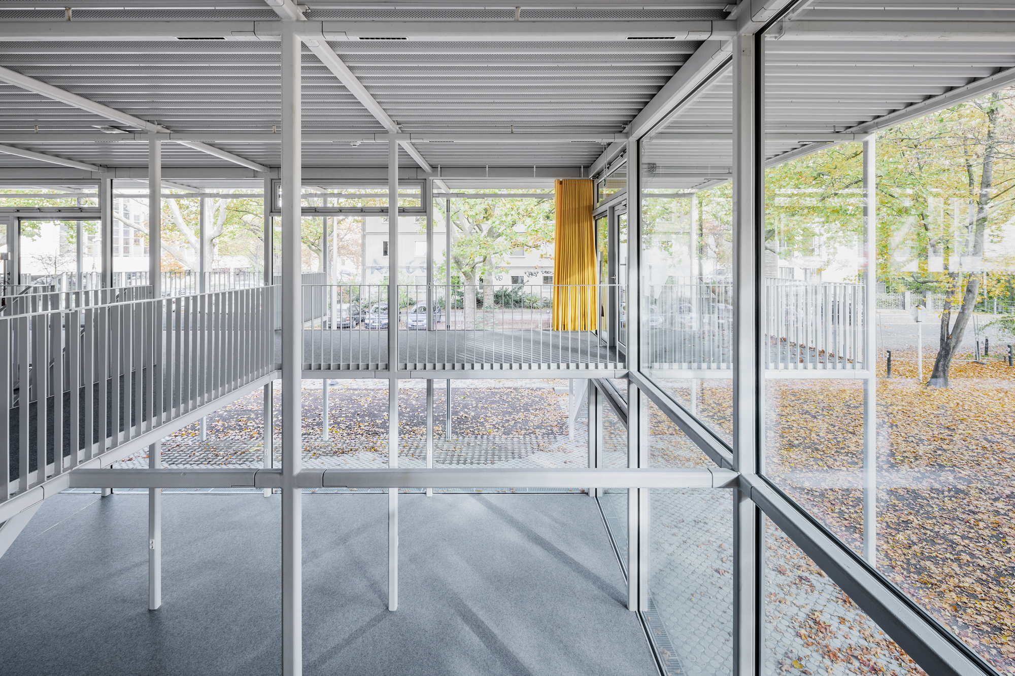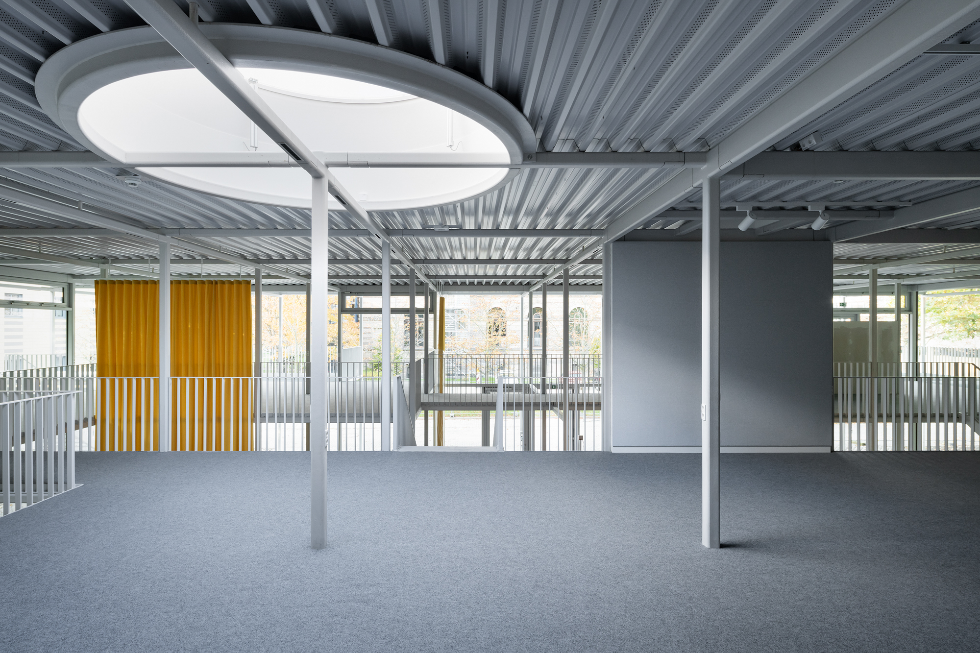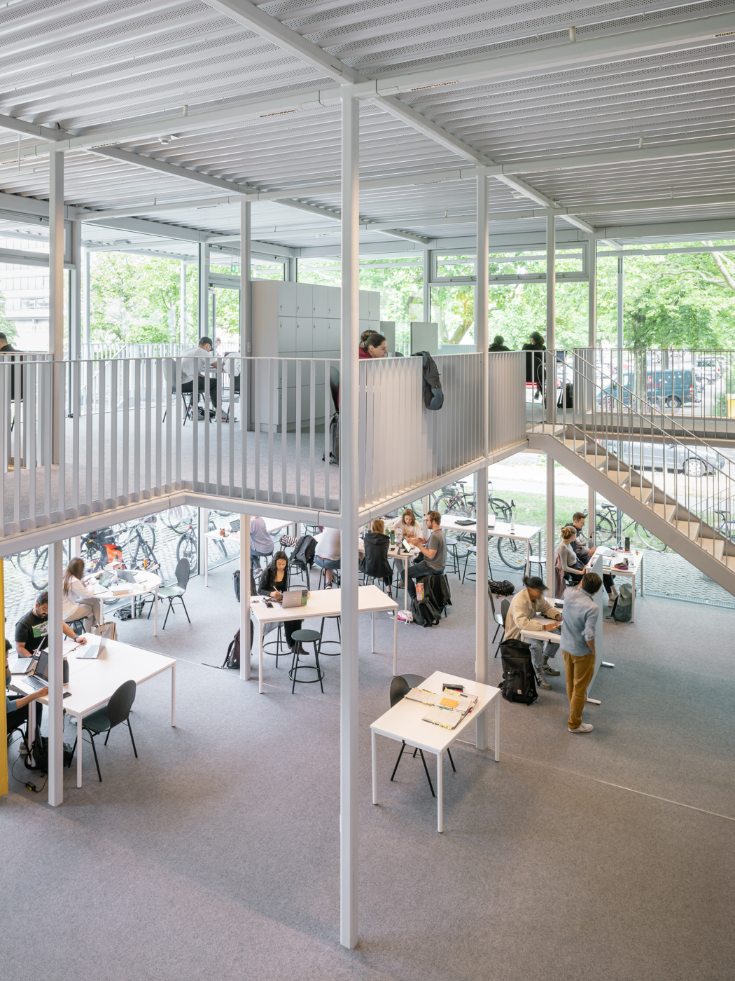 건물의 조직적 원리는 상부 구조의 개념을 따르며, 평면도를 지속적으로 재구성할 수 있습니다. 이러한 레이아웃의 유연성으로 인해 건물은 일시적이고 반응성이 뛰어나므로 오랫동안 새로운 캠퍼스 요소로서 관련성이 유지됩니다. 혁신적인 강철-목재 하이브리드 구조는 완전히 분리 가능하며 "분해를 위한 디자인" 원칙을 따릅니다.