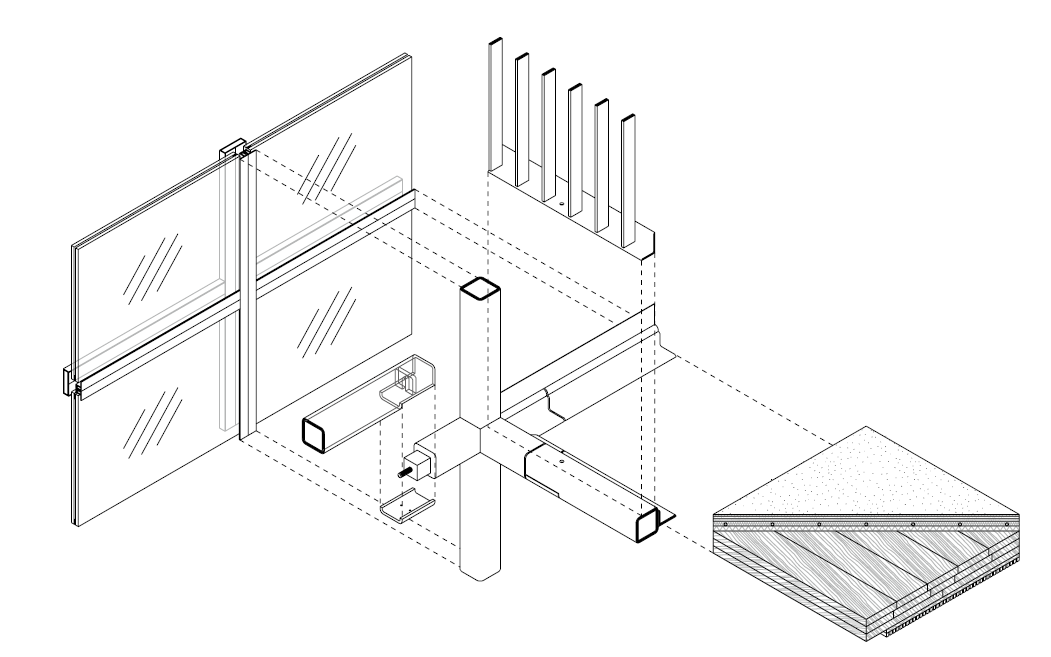 The primary support structure, consisting of beams and columns, is modular and designed on a square 3 × 3m grid, composed of the same 10 × 10cm square hollow profile. The wooden ribbed decks inserted into the beam frames are only bolted at points, the facade is not glued and is also demountable. In addition to possible densification through the addition of further platforms, the building could also be re-built in a different form or at a different location, following the principle of the „future material depot“, in which not only building materials can be reused but entire architectural elements such as facade-panels, stairs and platforms find new use in the spirit of „circular building“.
