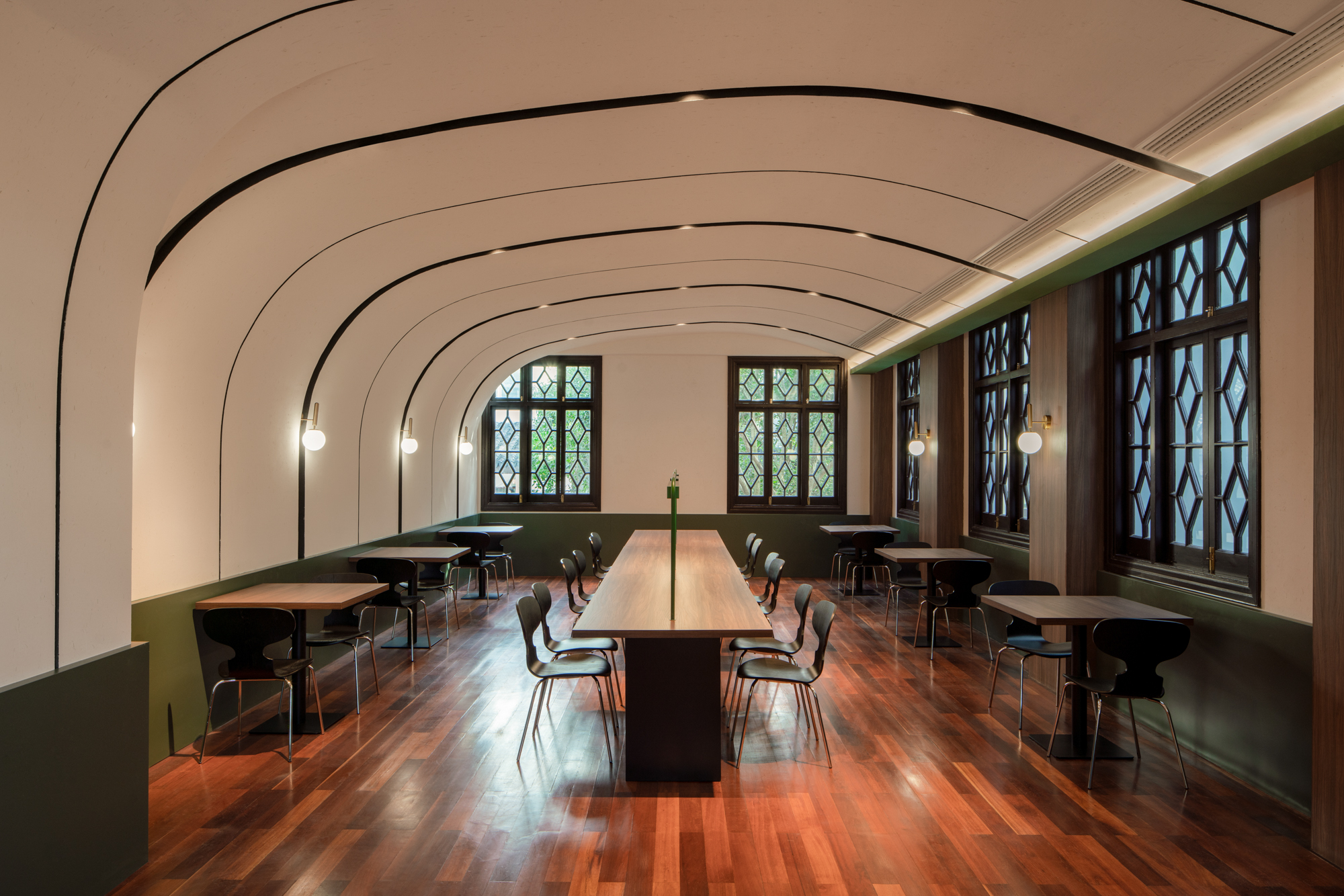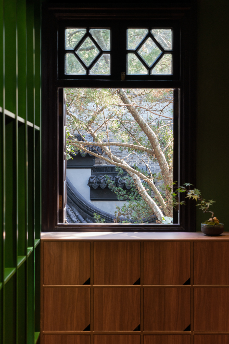 The enchanting city of Suzhou encapsulates the poetic beauty of the Southern Yangtze region. Once the heart of Suzhou, this area, adorned with gray bricks and flat tiles, embodies the profound cultural heritage and charm of a place steeped in the arts of calligraphy and painting. Constructed in 1932, this residence belonged to an eminent scholar of Chinese nationalism named Zhang Taiyan. In 2023, Gu Wu Xuan Bookstore took over its operation and entrusted Tsing-Tien Making to renovate this century-old mansion into a bookstore and a museum based on the scholar’s former residence. The design divides the originally deep, narrow, and disjointed layout into two distinct sections. Utilizing the first and second columns on the north side as a boundary, the space is vertically segmented into the northern and southern halves. The southern spaces are connected, and a reading area in the loop layout akin to the Chinese character “回” is positioned by the window. Wood is arranged in the form of “lines,” complemented by jade-green panels. The rhythm of the grid elements extends to the ceiling and the walls in the west. This space not only serves the function of a bookstore but also allows readers to appreciate traditional artifacts created by masters or obtain information about activities in the National Study Lecture Hall while searching for books.