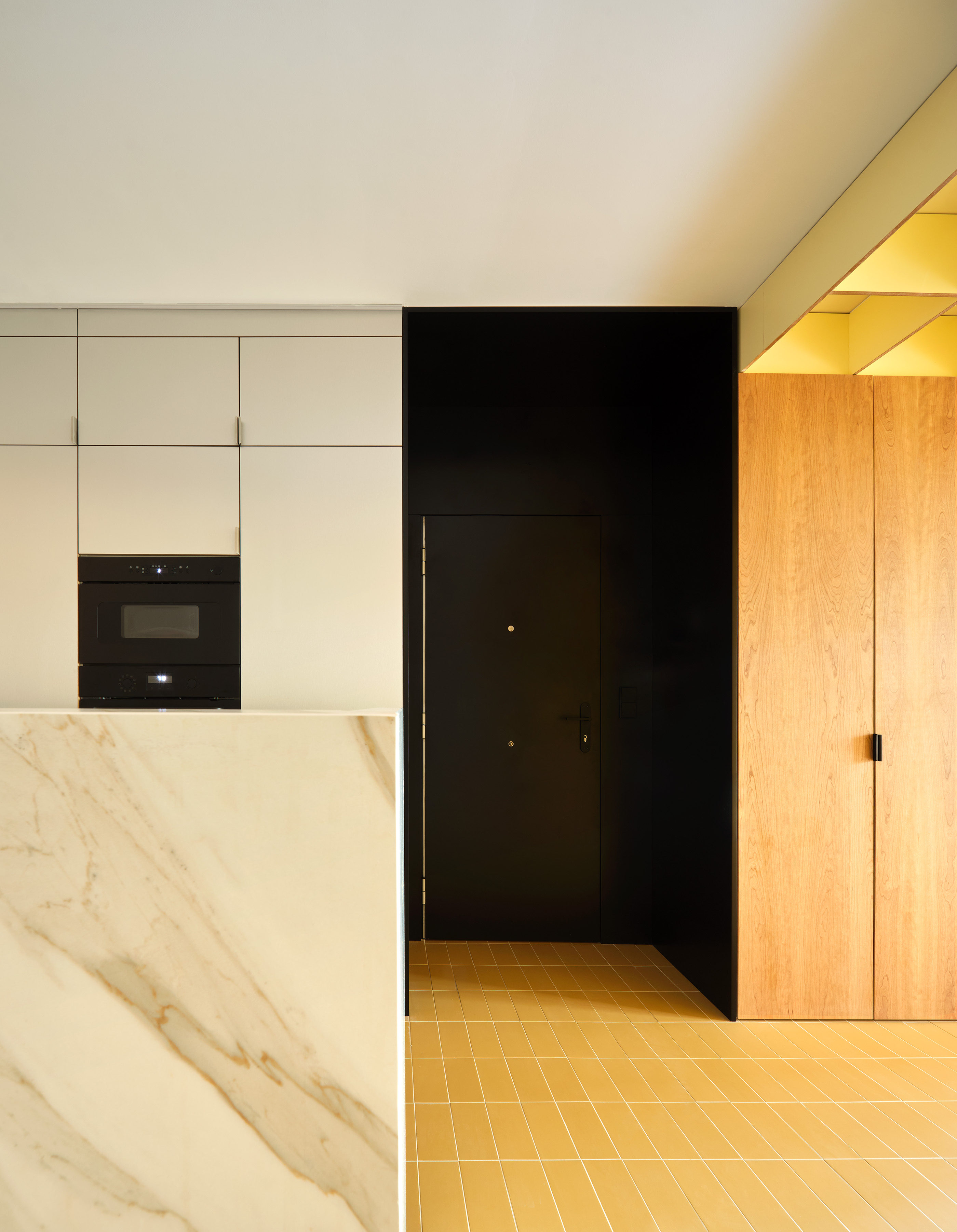 Each room in the house is occupied by an object that qualifies the space and makes it function specifically. The main piece at the entrance to the residence is characterized by an enormous shelf covering the wall and folding horizontally, resulting in a false ceiling of cells that illuminates and conditions the space. This spatial shelf is made of raw DM plywood panels with a vanilla-colored laminate. A built-in wardrobe supports this inverted L-shaped structure. The wardrobe, seen from the living room, functions as a large cherry wood cube assembled with the shelf. Atop this wooden piece is the entrance to the residence executed with black paneling. This hollow and dark piece serves as a hinge to transition to an open kitchen connected to the hall and living room. The countertop's position and the removal of the partition separating the kitchen allow the hallway to be used as an area that makes cooking more enjoyable.