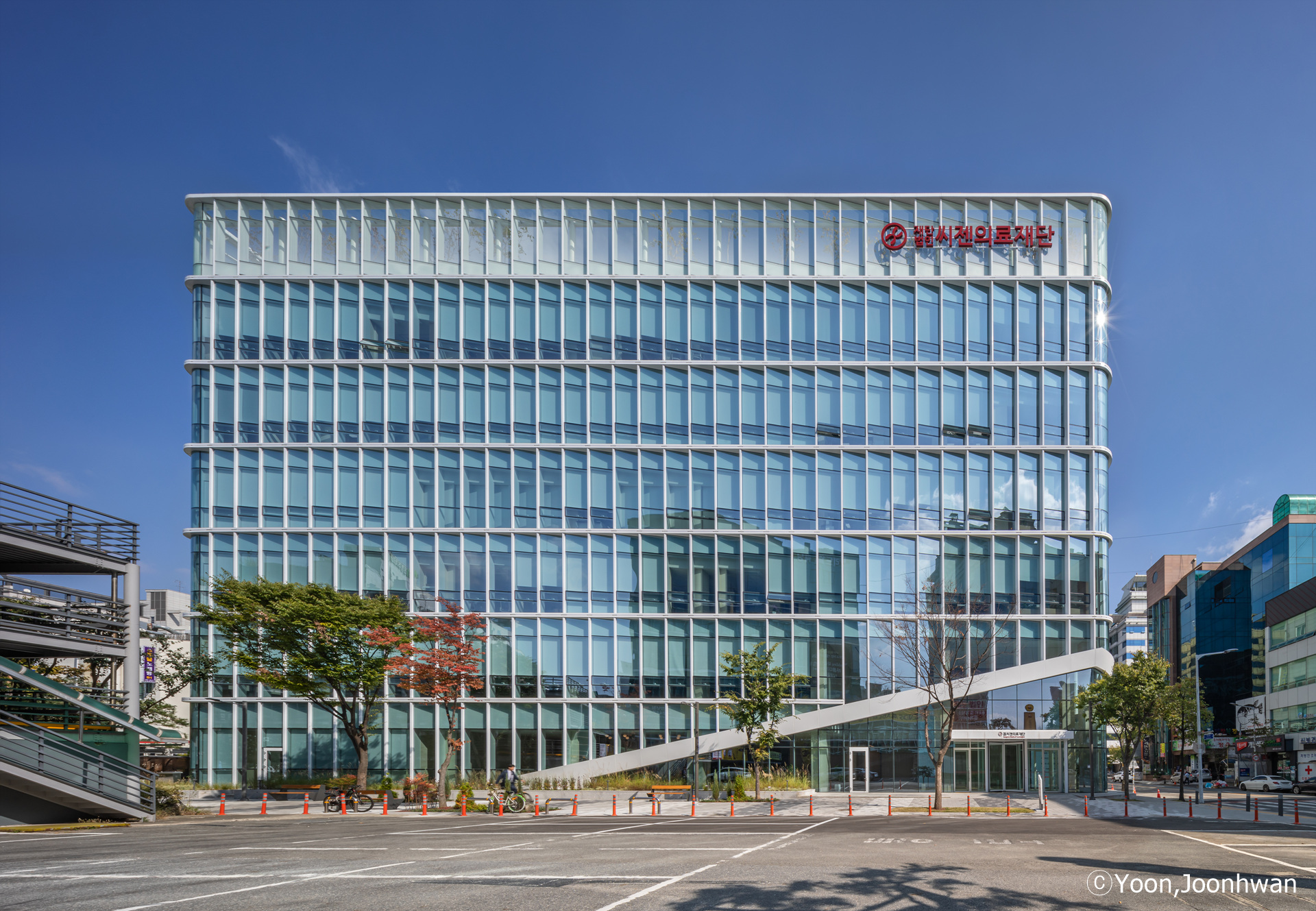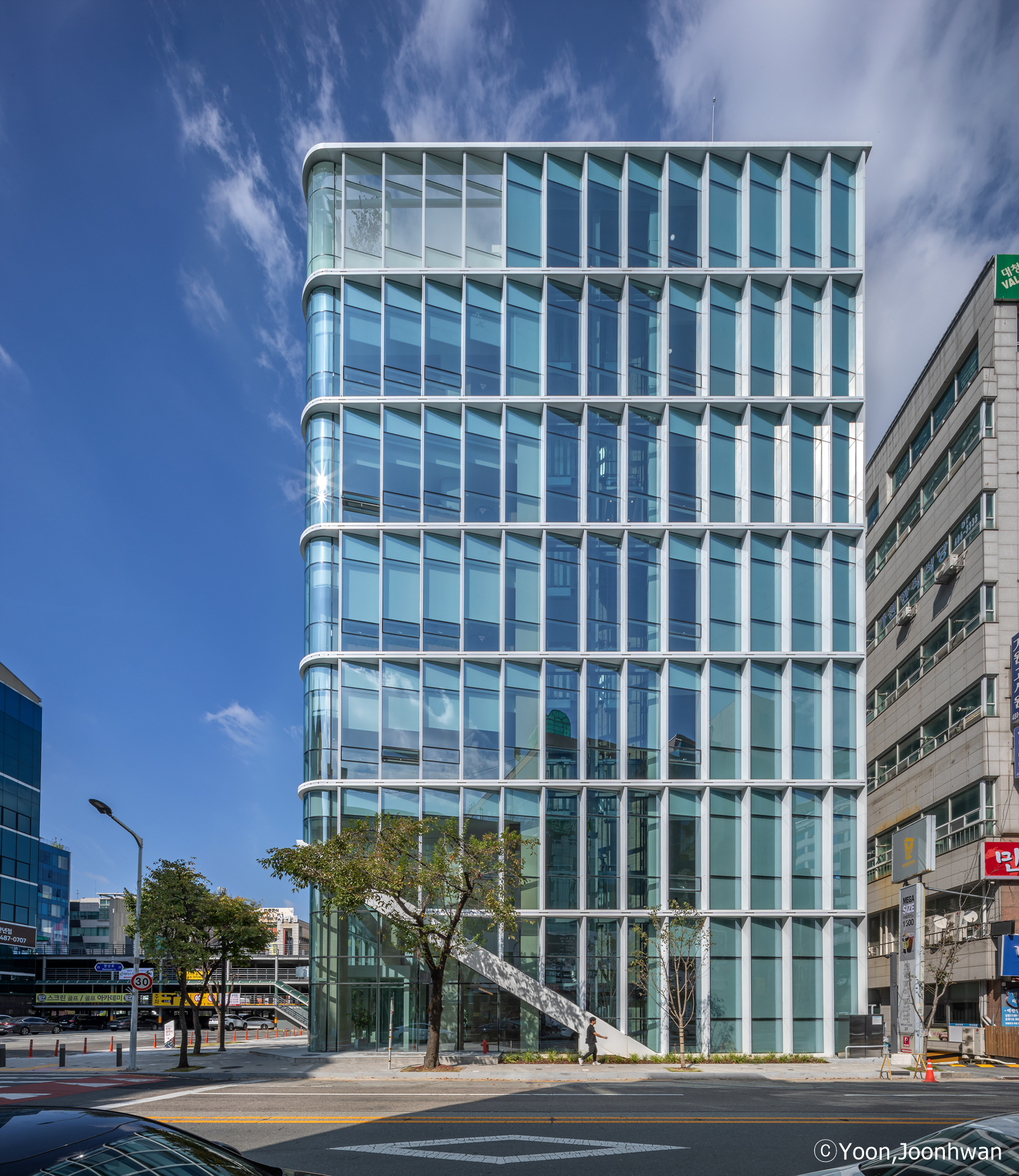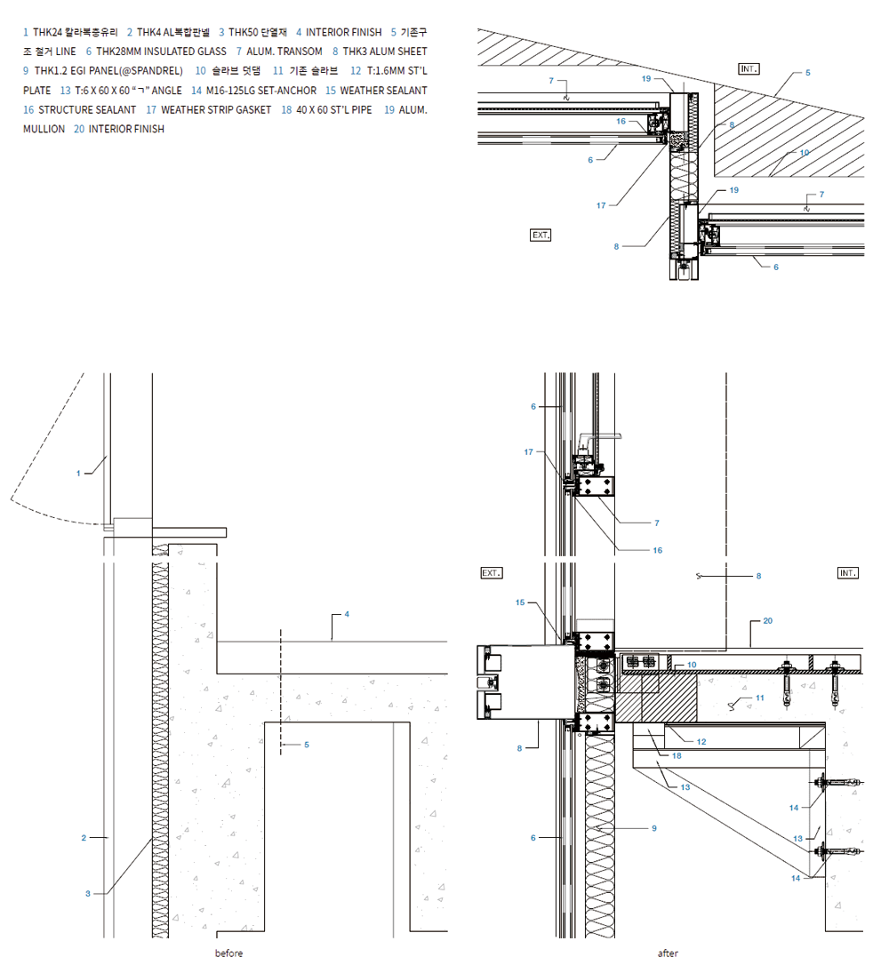 준공된 사옥의 두 가지 외부 재료는 백색 알루미늄 시트와 유리이다. 공공 보행 통로를 중심으로 유동 인구가 많고 접근성이 좋은 코너를 오픈하여 인지도를 높이고 자연스럽고 편안한 동선을 유도하였다. 내부 진입시 경험하는 개방된 로비 공간은 기존 슬라브와 보를 철거하여 개방된 공간을 확보하였고, 극적으로 대면하는 기업의 첫인상을 제공한다. 또한, 남·서·북측으로 사선 커튼 월과 곡면 유리, 경관 조명 적용하여 주·야간으로 다양한 도시 경관을 고려하였다. 사선 커튼 월을 설치하기 위한 과정에서 건축 한계선을 지키기 위해 기존 캔틸러버 보와 수벽, 슬라브 등 돌출 부분을 50cm 철거하고 개방감 있는 유리 커튼 월 방식의 새로운 파사드를 적용하였다.