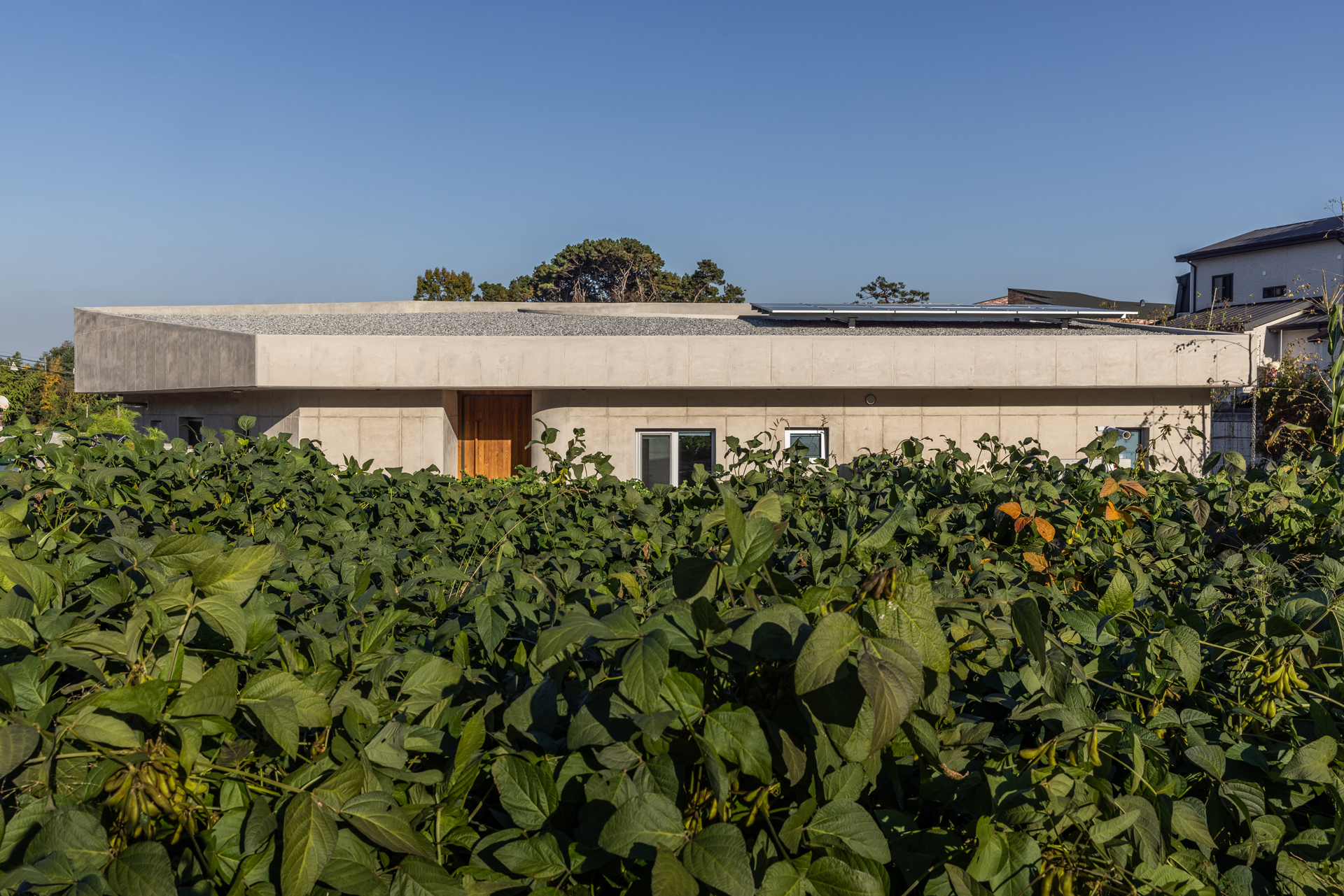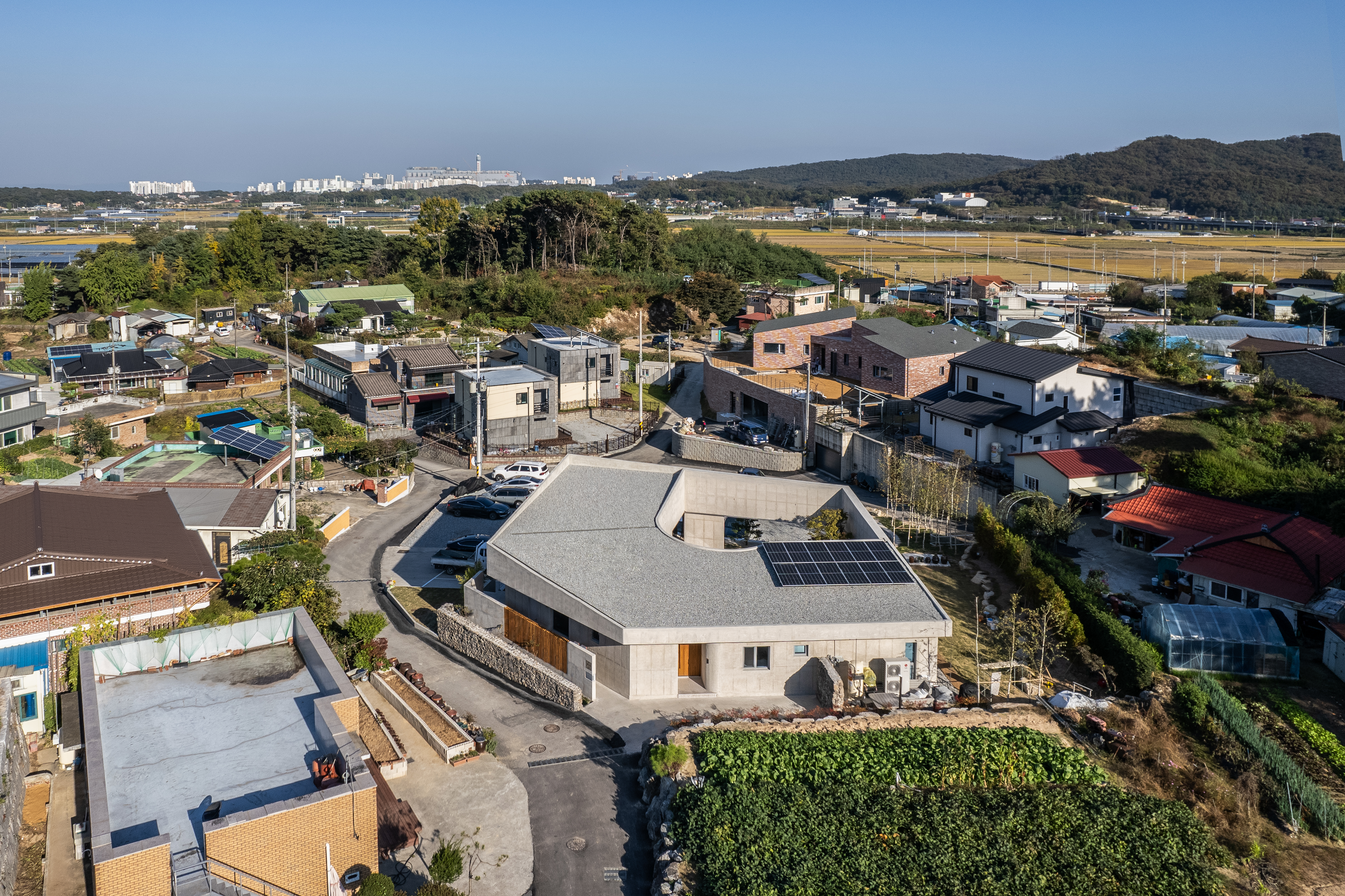 경기도 이천시 작은 마을 클라이언트는 아파트 생활에서 직장 근처 이 마을로 생활을 옮기기로 하였다. 한쪽에는 정비가 된 단독주택 필지가 있고, 주택이 지어질 땅 주변으로는 기존 촌락이 다양한 모습으로 형성되어 있었다. 땅은 기존 촌락의 중심에 위치한다. 사생활을 중요시하는 단독주택에서는 조금 불리한 위치 조건을 가지고 있었다. 땅은 이미 정리가 되어 평탄하지만 주변에 다양한 레벨이 존재하였다. 대지의 서측은 1.5m 높게, 동측은 1.5m 낮게 형성되어 있었고, 남동측의 단독주택은 2m 높게 지어 대지를 내려다보고 있었다. 이러한 레벨 차이는 주택을 배치하는 데 불리한 요소이나, 오히려 이를 이용해 불리한 조건을 극복하고자 하였다.