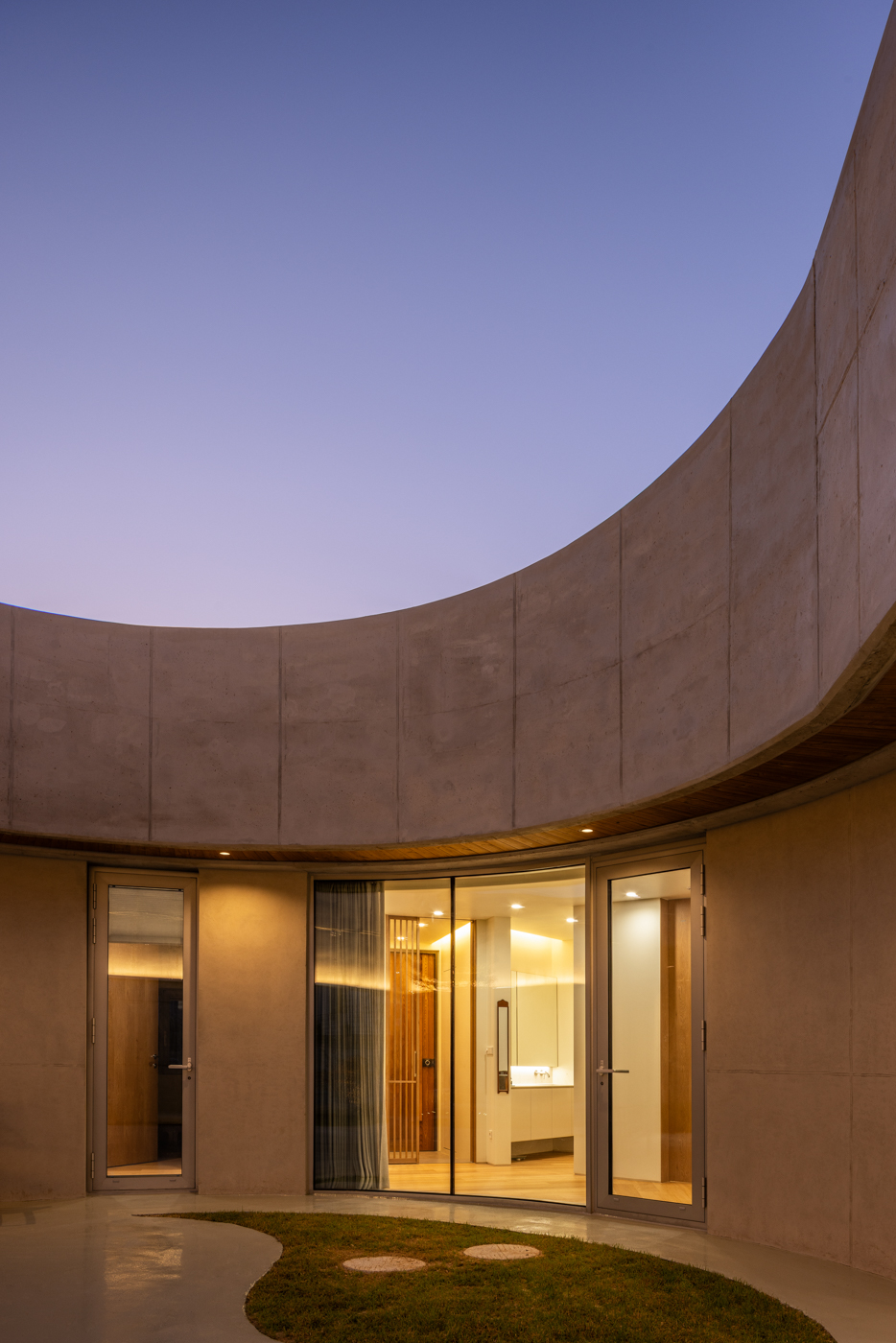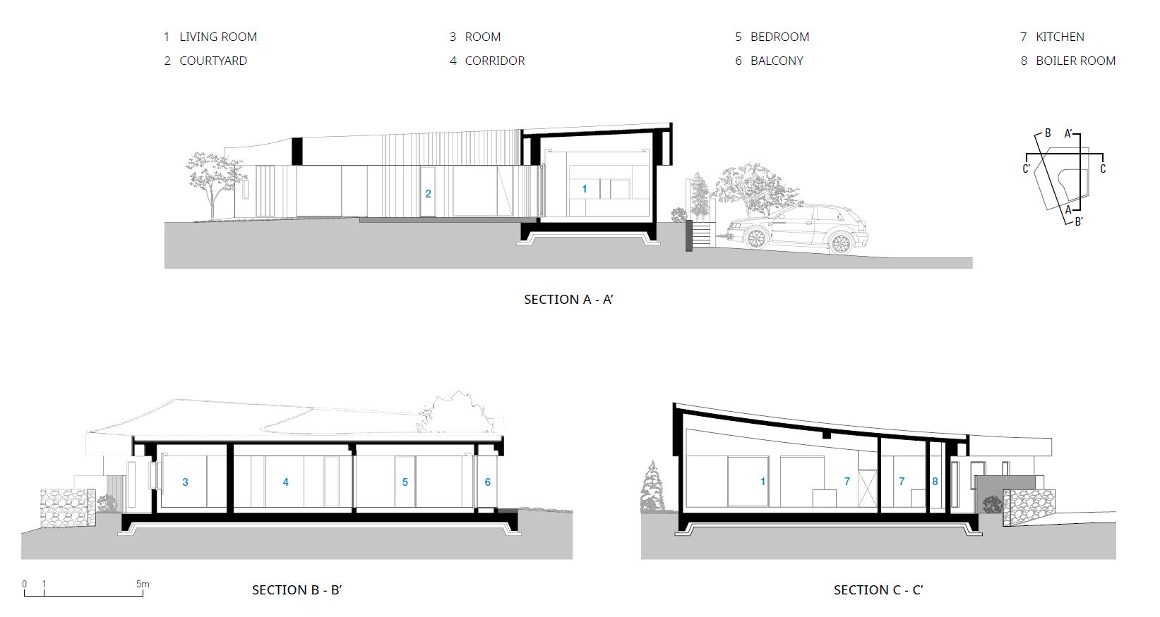 마당을 중심으로 복도와 거실, 안방을 배치하여 마당을 감싸 안은 집을 계획하였다. 서측의 높은 인접 대지에서는 지붕이 낮게 깔려 있고, 동측의 낮은 인접 대지에서는 건물의 매스감이 보이도록 하였다. 그리고 마당을 좀 더 사적화 하면서, 남동쪽의 단독주택으로부터 시선을 차단하기 위해 수평의 떠 있는 띠를 만들었다. 이를 통해 마당은 좀 더 아늑하면서 사람의 시선에서는 땅의 연속성을 유지하여 답답하지 않은 형태를 가지도록 하였다. 그리고 마당의 면적을 좀 더 키우면서 각 실의 독립성을 확보하기 위해 ‘벌린 ㄷ자’ 형태의 평면을 계획하고, 마당의 수평 띠까지 오각형의 형태로 계획하였다. 세 개의 변 중 하나는 거실과 부엌의 공공 공간으로, 다른 한 변은 안방과 게스트룸으로, 마지막 한 변은 현관과 화장실을 이루는 공용 공간으로 구성하였다. 이때 각 변은 모두 마당을 감싸 안은 형태다.