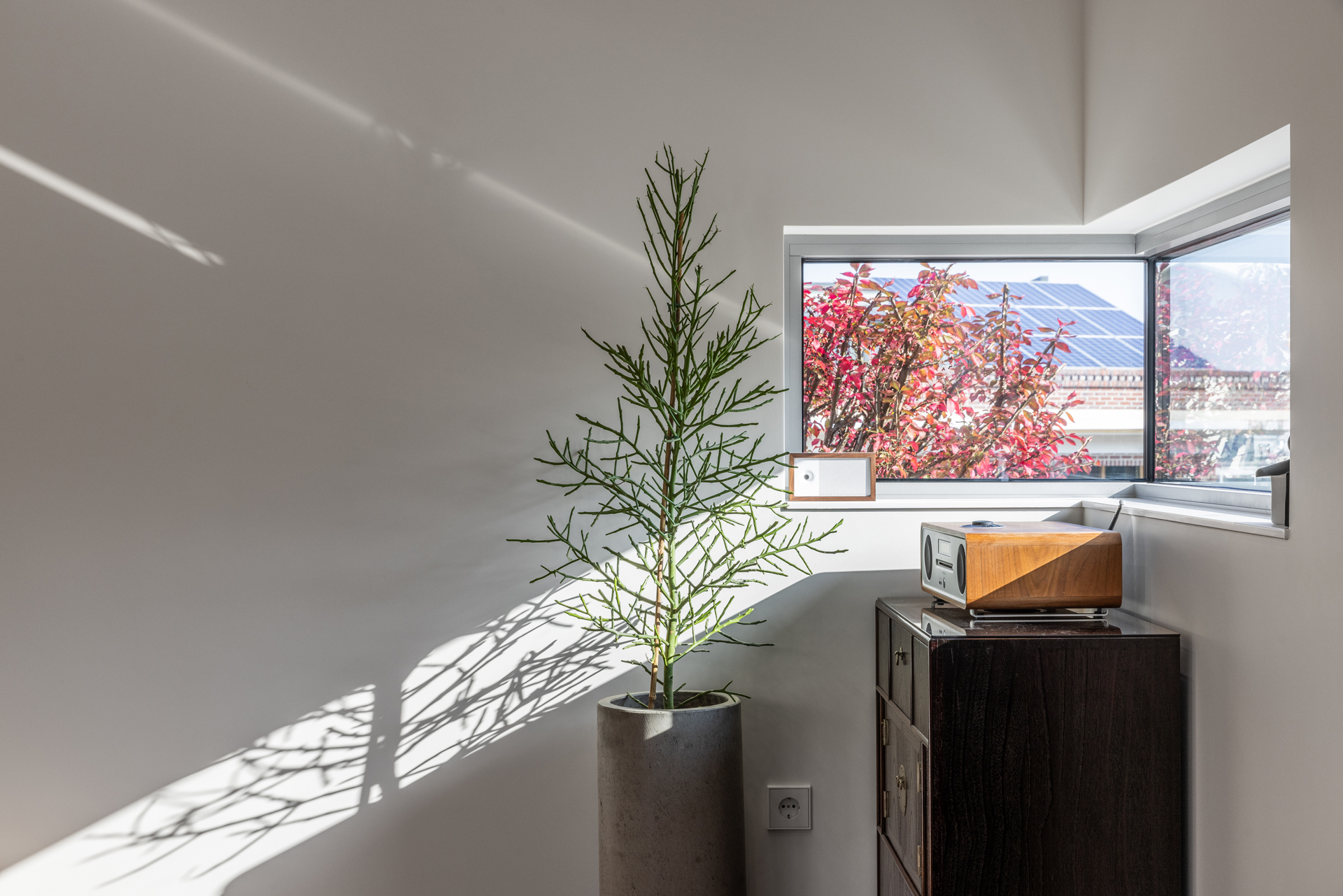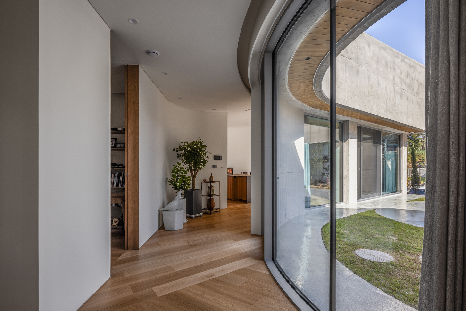 전체적으로 실과 지붕의 두 부분으로 나뉘어 단순한 구조로 보이도록 하였다. 지붕은 처마를 두어 햇빛의 채광을 조절할 수 있도록 하면서, 좀 더 경제적이고 클라이언트의 요구사항을 만족시킬 방법으로 제안하였다. 클라이언트는 거실이 냉난방 효율을 위해 너무 높지 않았으면 하였지만, 동시에 일반적인 층고를 갖는 것 또한 원하지 않았다. 그래서 안방과 다른 실들은 기본 층고를 유지하면서도 거실 쪽으로 경사를 만들어 거실의 층고를 점점 높여 복도에서부터 거실까지 연속적으로 높아지는 공간감을 만들었다.
