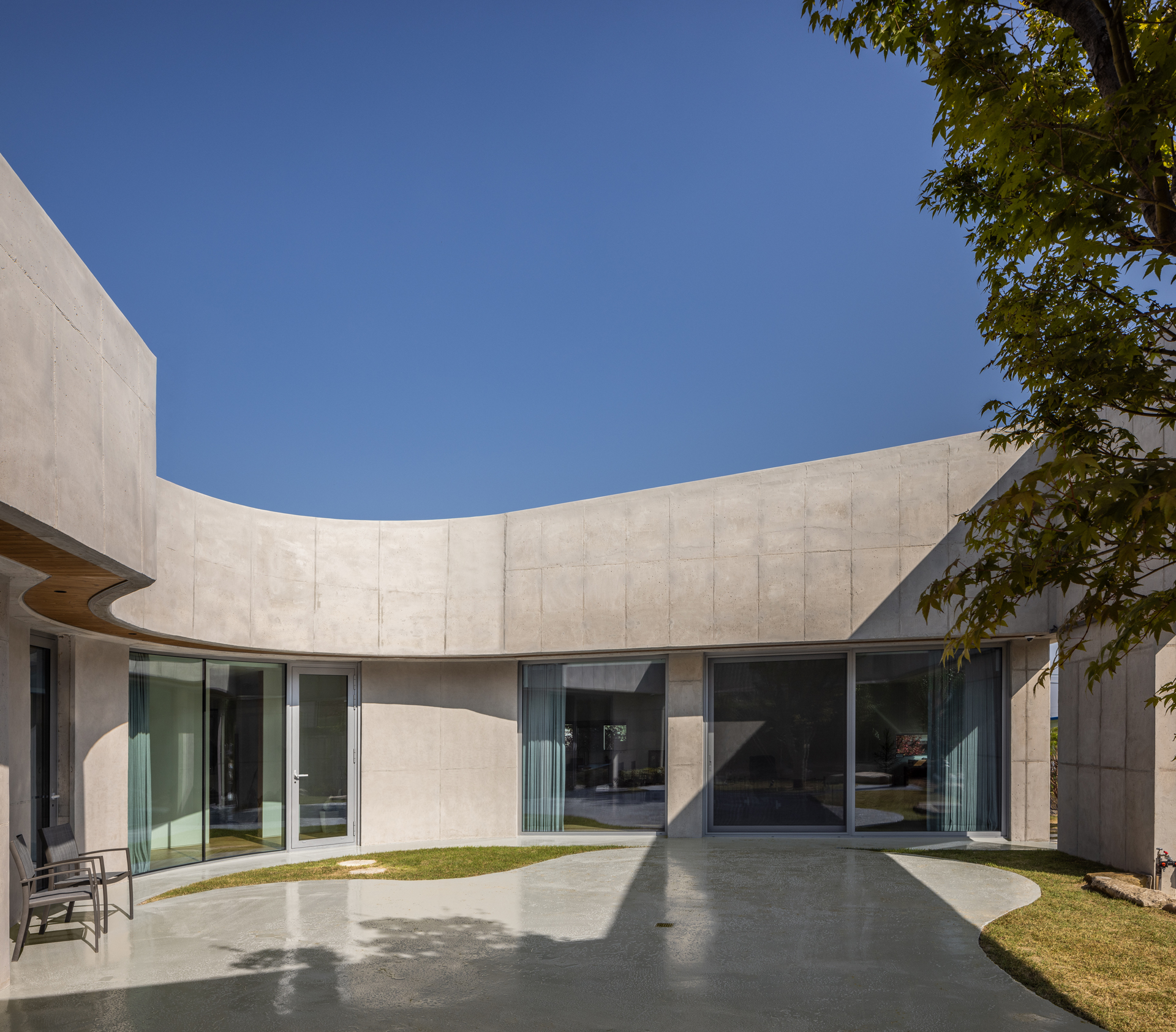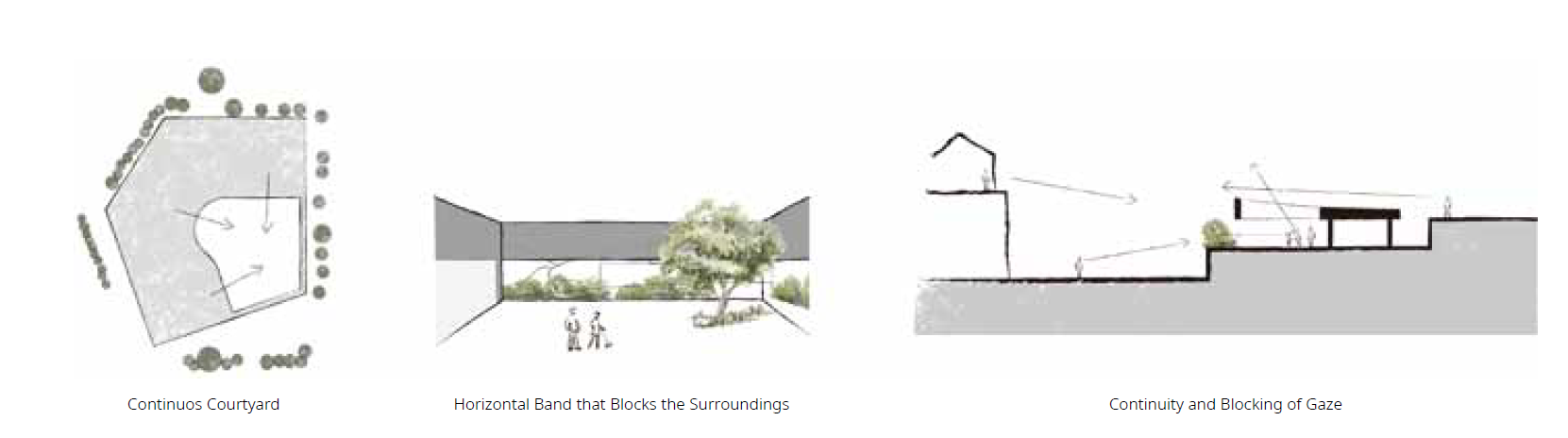 마당을 중심으로 복도와 거실, 안방을 배치하여 마당을 감싸 안은 집을 계획하였다. 서측의 높은 인접 대지에서는 지붕이 낮게 깔려 있고, 동측의 낮은 인접 대지에서는 건물의 매스감이 보이도록 하였다. 그리고 마당을 좀 더 사적화 하면서, 남동쪽의 단독주택으로부터 시선을 차단하기 위해 수평의 떠 있는 띠를 만들었다. 이를 통해 마당은 좀 더 아늑하면서 사람의 시선에서는 땅의 연속성을 유지하여 답답하지 않은 형태를 가지도록 하였다. 그리고 마당의 면적을 좀 더 키우면서 각 실의 독립성을 확보하기 위해 ‘벌린 ㄷ자’ 형태의 평면을 계획하고, 마당의 수평 띠까지 오각형의 형태로 계획하였다. 세 개의 변 중 하나는 거실과 부엌의 공공 공간으로, 다른 한 변은 안방과 게스트룸으로, 마지막 한 변은 현관과 화장실을 이루는 공용 공간으로 구성하였다. 이때 각 변은 모두 마당을 감싸 안은 형태다.