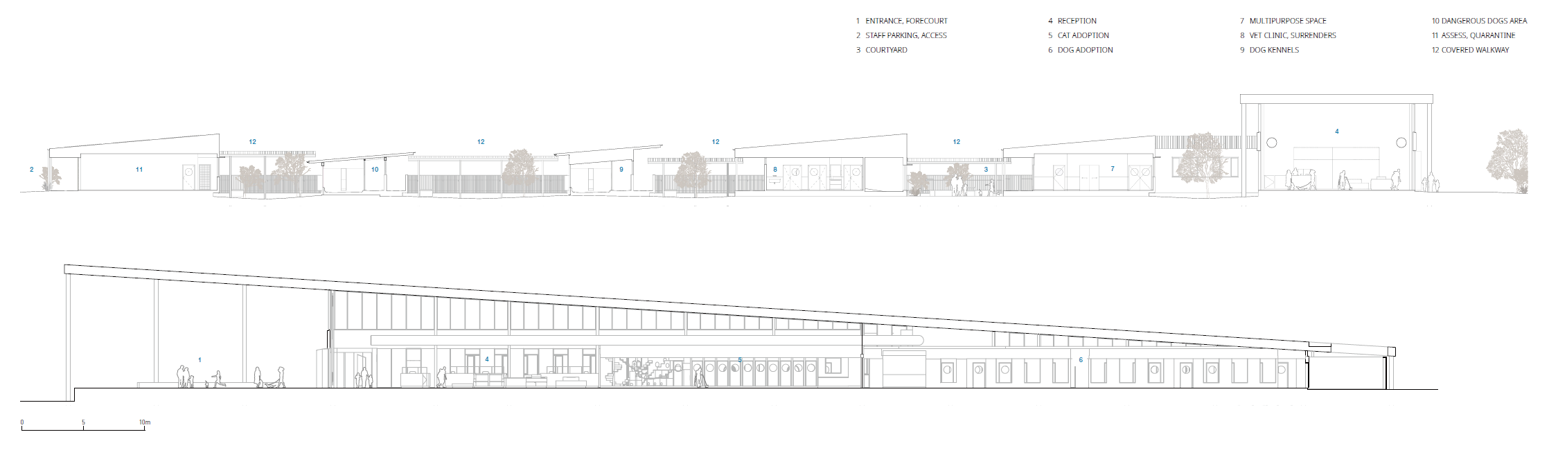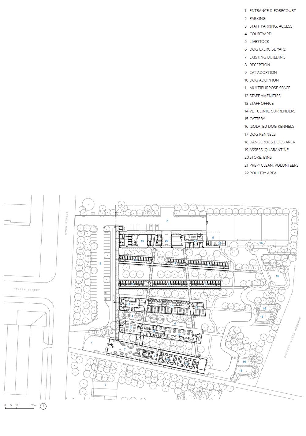 블랙타운 동물보호소는 웨스턴 시드니 파크랜즈 인근에 세워진 380마리의 강아지와 고양이를 수용할 수 있는 남반구 최대 규모의 동물보호소이다. 블랙타운 동물보호소는 총 6개의 건물로 구성되어 있는데, 시골에서 일반적으로 볼 수 있는 길쭉한 헛간이이 마치 길쭉하게 쭉 뻗은 여섯 개의 손가락처럼 배치되어 있다. 각 건물은 동물의 보호 효율을 높이기 위한 사육장, 수의시설, 광장 등 다양한 기능이 있다. 손가락처럼 긴 건물이 일정한 간격을 두고 배치된 형태는 동물들이 주변 풍경과 직접적으로 연결되어 자연 및 사람들과의 상호 작용을 높일 수 있도록 한다. 이 배치는 열적, 시각적, 청각적 편안함을 극대화하고, 고통을 최소화하고, 재활을 돕고, 직원들에게 편의를 제공한다. 자연과의 연관성을 극대화하는 것은 동물보호소 설계에서 가장 중요한 부분이었다. 건물들 사이마다 배치된 자연은 동물들과 그들과 함께 지내는 직원들, 방문객이 건축물에서 편안함을 느끼게 해주기 때문이다. 뿐만 아니라, 자연과 건축물이 함께 공존한다는 인식은 모두에게 환대의 인사를 보낸다.