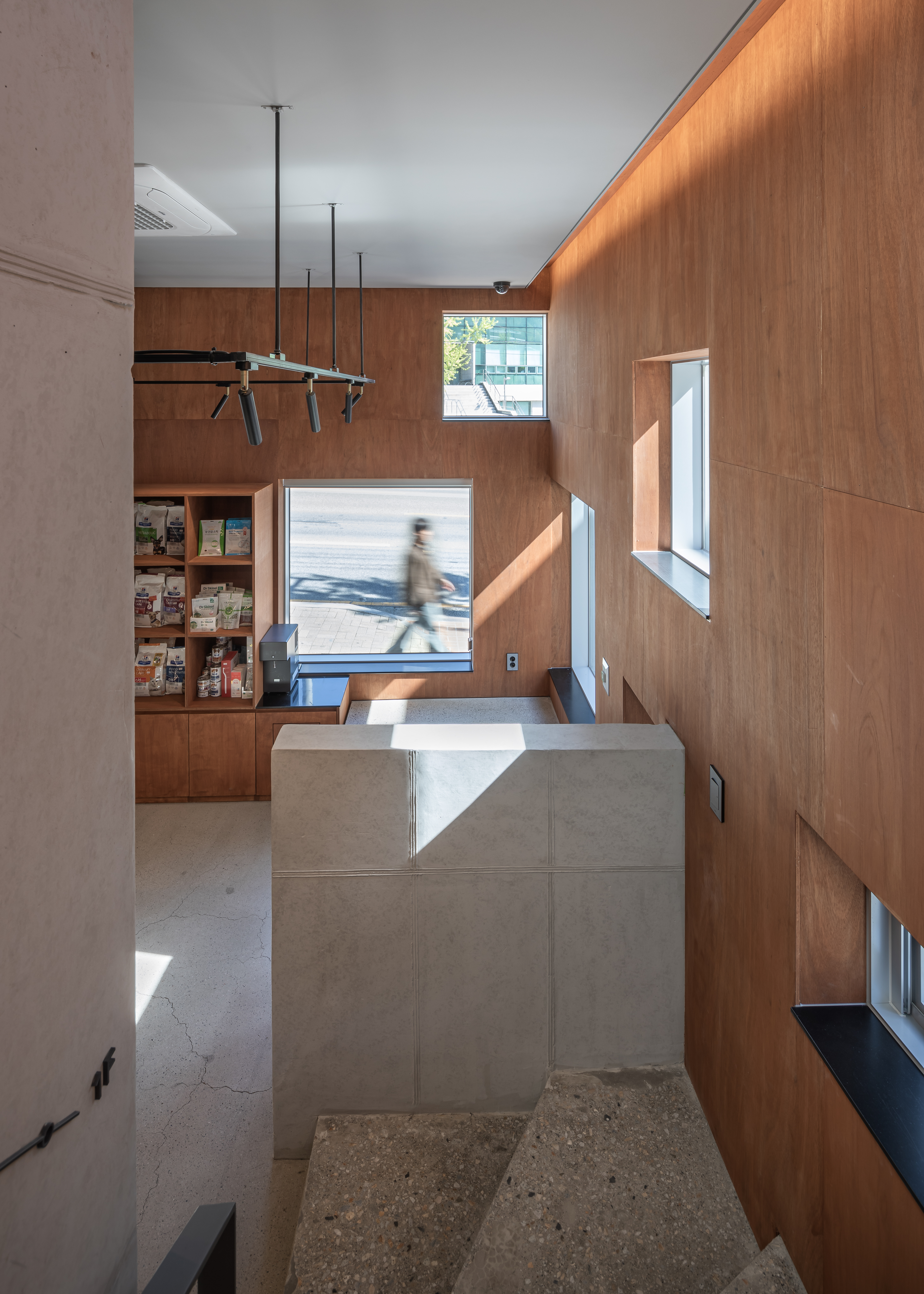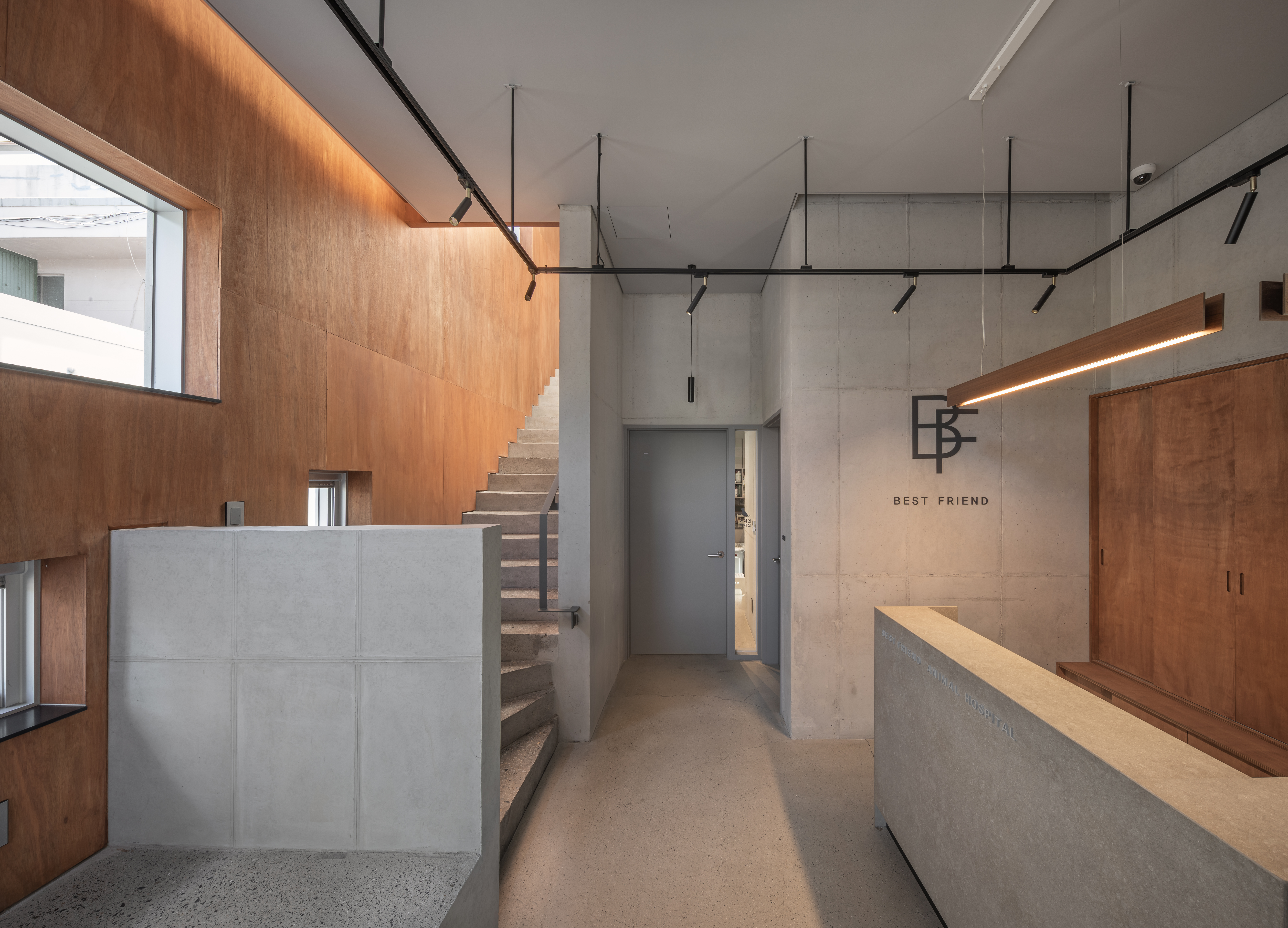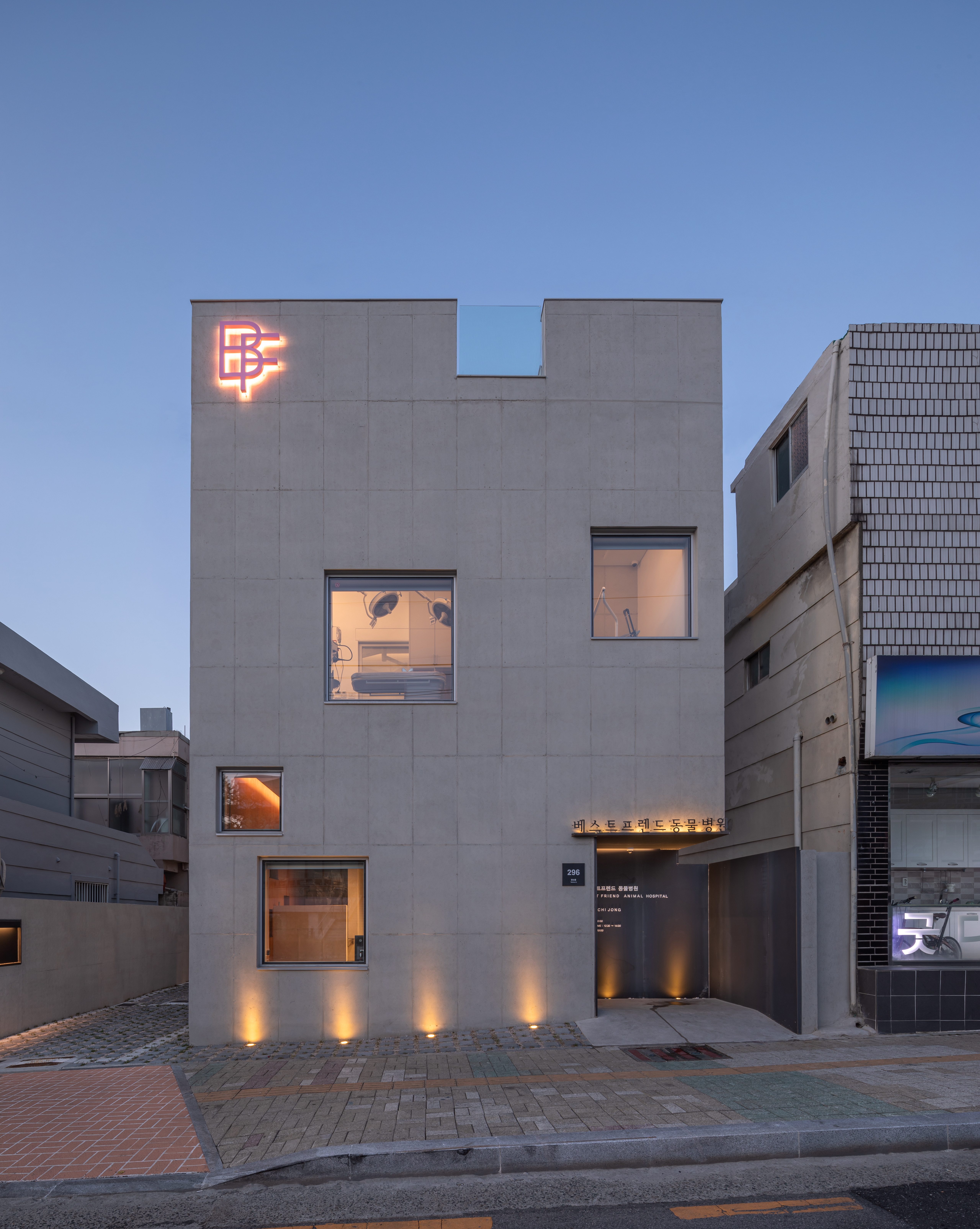 ‘창’이라는 요소는 채광과 환기라는 기본적인 기능 뿐만 아니라, ‘안에서 밖의 풍경을’ 또는 ‘밖에서 안의 일상을’ 담는 액자와 같은 역할을 한다. 즉, 이곳에서의 창은 변화하는 도시의 모습을 생동감 있게 실내로 끌어들일 뿐만 아니라, 외부에서는 동물병원 내에서 일어나는 다양한 행위들을 전시하며 자연스럽게 사람들의 이목을 끌 수 있는 장치가 되길 바랬다. 내부에서의 창은 그 자체가 인테리어 오브제의 중심으로, 외부에서의 창은 이를 통해 인식되는 내부의 모습 그 자체가 건물의 주요 입면이자 간판이라 생각했다. 이를 위해 내외부의 주요 마감재들과 간판은 배경으로서 존재하도록 단순화하거나 축약시켰다. 건물의 형상은 단순한 박스이지만 비례가 중요했고, 반복과 대칭되는 노출콘크리트 거푸집 경계선들과 그 바탕 위에 리듬감 있게 부유하는 창들과의 관계를 깊이 고민하였다.