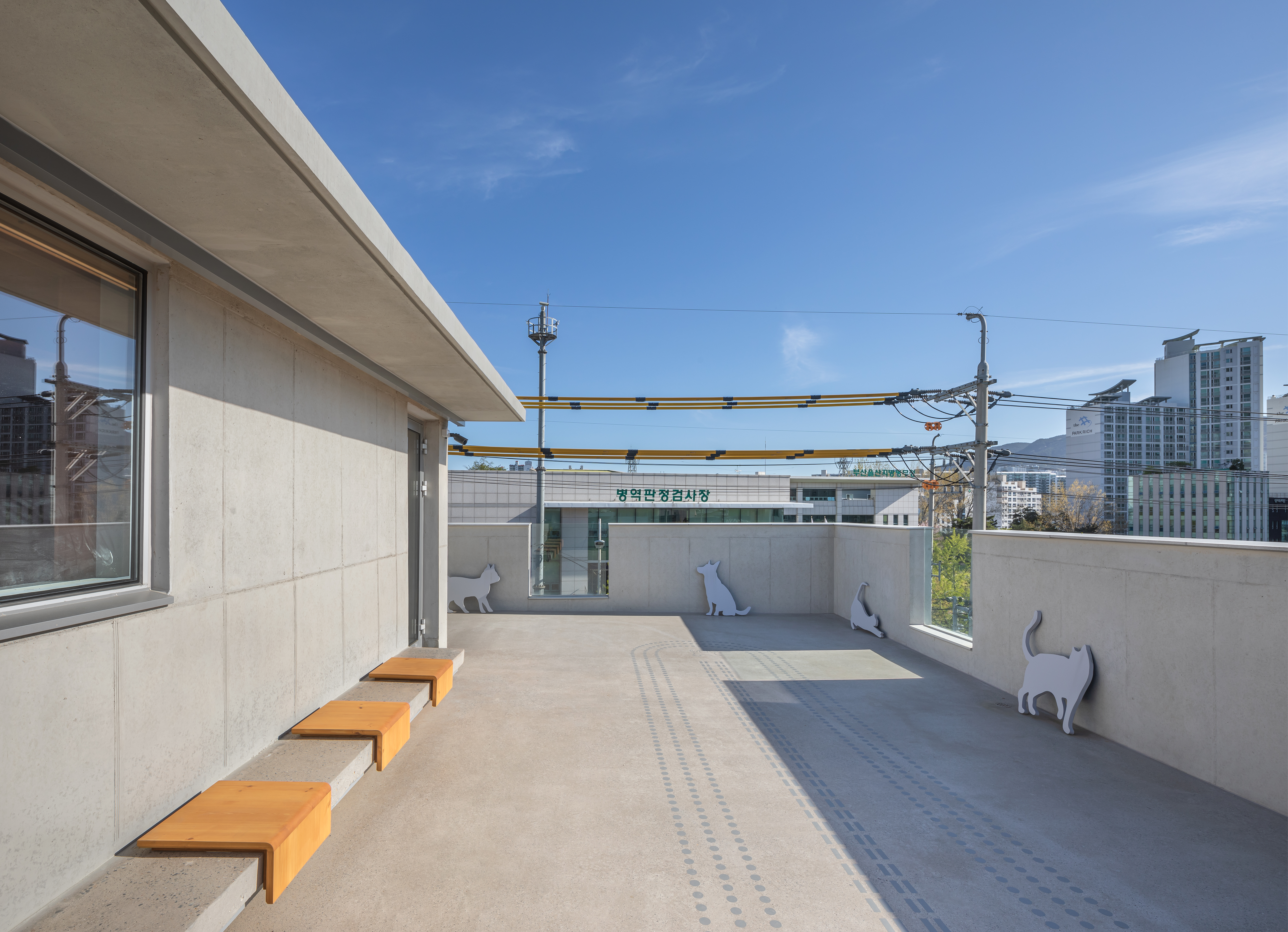 이 동물병원은 총 40여 평의 면적 내에서 동물의 진료, 검사, 처치, 수술, 스태프 휴식공간 등의 다수 실들로 구성되어 있다. 동물병원으로서 작동하기 위한 기능적 공간 체계를 구현하는 것을 넘어서서, 방문한 보호자들과 반려동물들이 대기하는 동안 입구부터 옥상마당까지 이어지는 각각의 공간에서 다양한 장면들(sequence)을 경험하도록 하였다. 1층 실내로 진입하여 만나는 홀 공간은 높은 층고와 수직적으로 쌓여진 창들에 의해 가로변 풍경이 한아름 들어오고 실내가 가로의 일부, 외부 같은 내부 공간으로 인식되기도 한다. 건물 테두리를 돌면서 오르내리는 계단에서는 위치와 크기가 다른 창들에 의해, 하늘, 빛과 그림자, 블록 내 주택 풍경이 곳곳마다 다르게 느껴진다. 단열재와 각종 의료 설비를 벽체 안에 품고 마감되는 라왕 합판 벽과 노출콘크리트 벽은 계단을 따라 재료간 조합이 달라지며 공간의 성격을 다양하게 변화시키고, 이는 마을의 계단 골목길과 같은 공간을 연상시킨다. 마침내 다다른 옥상 마당은 주변의 낮은 건물들에 의해 펼쳐진 근거리 도심 풍경과 원경의 산 전경을 한눈에 선사한다. 옥상은 반려동물들이 울타리 없이 안전하게 맘껏 뛰놀 수 있는 놀이터 공간이기도 하다.