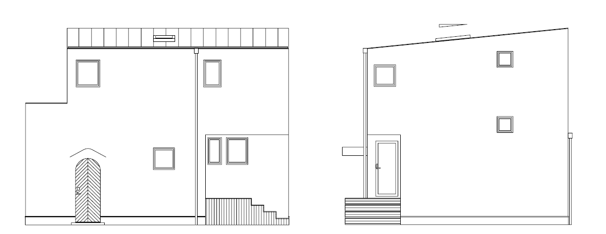 주택의 전체적인 형태는 두 개의 ‘L’자형 볼륨으로 구성되어 있고, 각각 다른 각도의 지붕이 있다. 지붕은 두 개의 볼륨을 지닌 주택을 이어주면서 가마쿠라 산과 조화를 이룬다. 지나가는 사람들은 건물의 외관과 더불어 창밖을 내다보는 고양이를 풍경의 일부로서 감상할 수 있을 것이다.