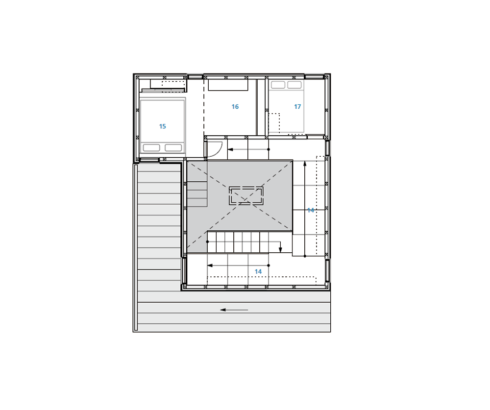 고양이에게 필요한 것은 크게 세 가지이다. 선호하는 온도의 미세한 차이, 사람들과 너무 가깝지도 멀지도 않은 적절한 거리, 고양이들이 안전하다고 느낄 수 있는 장소를 다양하게 마련하는 것이다. 건축가는 이러한 조건을 고려하여 주택 전체를 하나의 ‘캣트리(Cat tree)’처럼 설계했다. 천장의 조명을 중심으로 아트리움을 배치하고, 나선형 계단으로 집을 둘러싸 자연광이 하루종일 나선형 계단을 밝힌다. 집 안의 공간들은 층마다 미세한 온도 차이가 나며, 고양이들은 시간에 따라 자신이 좋아하는 온도별 공간을 찾아 움직일 수 있다. 또, 나선형 계단은 집 전체를 둘러볼 수 있게 설계되어 고양이가 숨거나 사람과의 거리를 유지할 수 있게 한다. 계단을 따라 놓인 벽의 캔틸레버 구조 책장은 복층 도서관의 역할을 한다. 고양이에게는 계단이 아늑한 침대가 되고, 건축주는 어느 곳에서나 앉아 책을 읽을 수 있는 공간이 된다. 원형 계단의 일부는 고양이 눈높이에 맞춰 창문을 두었다.