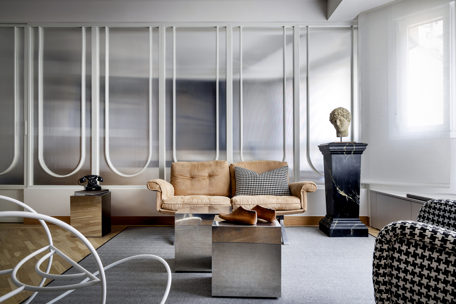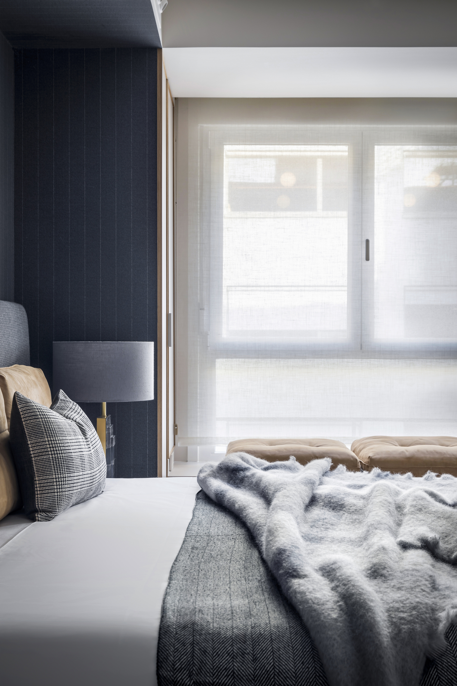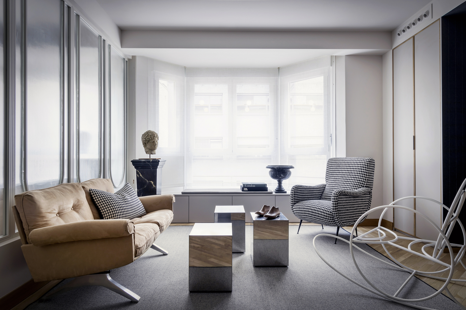 빌트인 캐비닛이나 고정 패널을 전체 둘레에 걸쳐 방을 감싸는 듯하게 보이는 막을 만들었다. 이 컨셉은 보드의 캐시미어 배경 톤으로 얼음 항아리로 알려진 구조에 적용되었다. 참나무를 이용하여 프레임의 테두리를 만들었으며 기존 창의 높이와 동일하다. 이 최첨단 디자인은 천장의 높이 차이를 균등하게 할 뿐만 아니라 가정의 에어컨 시스템을 통합하여 격자 효과를 통해 개방된 공간의 최대 높이까지 가도록 하였다. 이 공간에는 두 개의 창이 있고, 거실과 침실 영역에 있으면서 시각적으로 대조되는 모습을 보인다. 이 창들은 내부 디자인과 대조를 이루며 향수를 불러일으키는 마드리드의 비오는 날을 우울날이 떠오르게 하는 듯한 무거운 회색 헤링본 패브릭은 검은 밸벳 속의 다이아몬드를 떠오르게 한다.