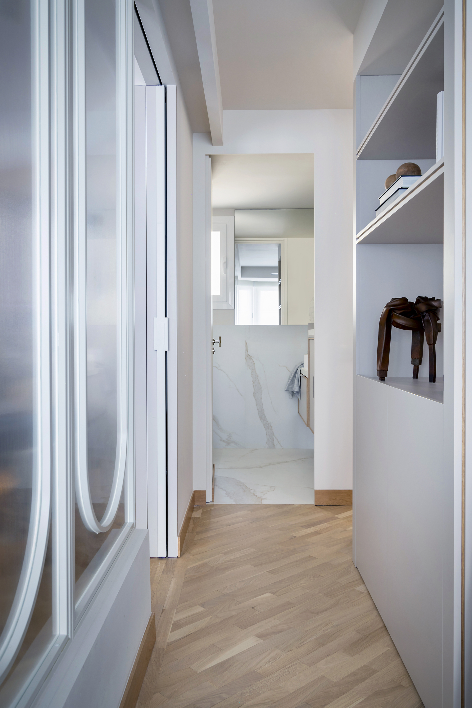 The apartment features a rectangular layout, which Viruta Lab simplifies from six closed zones to three, with the bathroom being the only completely independent area. The removal of these opaque partitions allows for a thorough unveiling of the entire living space, expanding diagonal views and perception of floor dimensions. This solution brings natural light into every corner, previously shrouded in shadows, enhancing the overall natural light influx. The key player in this element is Viruta Lab's custom-designed transparent glass filter. Materialized as a stained glass with a metal frame profile, it stands as the primary architectural feature. This bespoke piece delicately filters the most intimate resting area without obstructing views or overall luminosity.