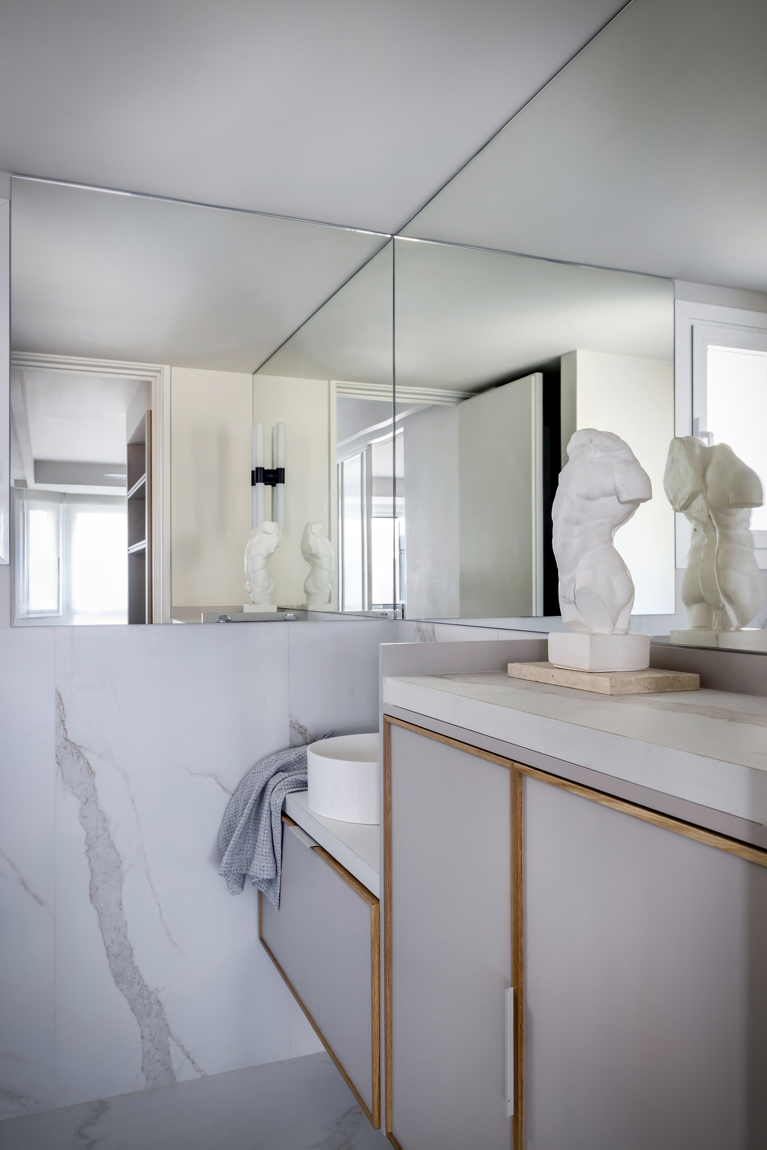 빌트인 캐비닛이나 고정 패널을 전체 둘레에 걸쳐 방을 감싸는 듯하게 보이는 막을 만들었다. 이 컨셉은 보드의 캐시미어 배경 톤으로 ‘얼음 항아리’로 알려진 구조에 적용되었다. 참나무를 이용하여 프레임의 테두리를 만들었으며 기존 창의 높이와 동일하다. 이 최첨단 디자인은 천장의 높이 차이를 균등하게 할 뿐만 아니라 가정의 에어컨 시스템을 통합하여 격자 효과를 통해 개방된 공간의 최대 높이까지 가도록 하였다. 이 공간에는 두 개의 창이 있고, 거실과 침실 영역에 있으면서 시각적으로 대조되는 모습을 보인다. 이 창들은 내부 디자인과 대조를 이루며 향수를 불러일으키는 마드리드의 비오는 날을 우울날이 떠오르게 하는 듯한 무거운 회색 헤링본 패브릭은 ‘검은 밸벳 속의 다이아몬드’를 떠오르게 한다.