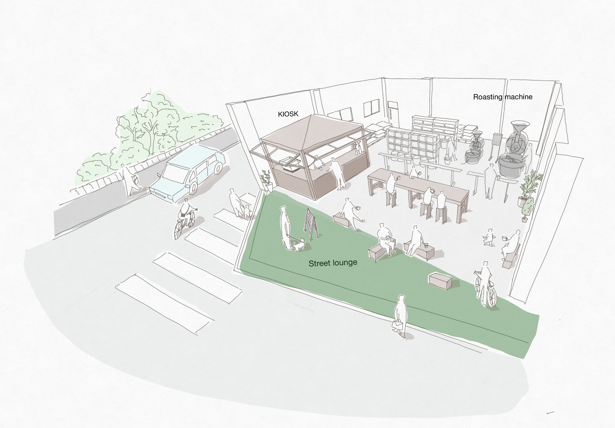 이 건물은 원래 자동차 정비소였기 때문에 거리에 접해 있는 건물의 전면은 모두 천장까지 열 수 있는 셔터로 되어 있다. 셔터를 열면 활짝 열린 공간이 연출되어 지나가는 이웃, 자전거를 탄 사람들, 개와 산책 중인 이웃 등 주변 사람들과 가까운 듯한 느낌을 받을 수 있다. 이 공간을 카페로 바꿔 도시속에서도 사람들이 자유롭게 커피를 즐기고 야외에 있는 듯한 분위기 속에서 일상속의 소통이 이루어지길 바라는 마음에서 '스트리트 라운지'를 설계하였다.