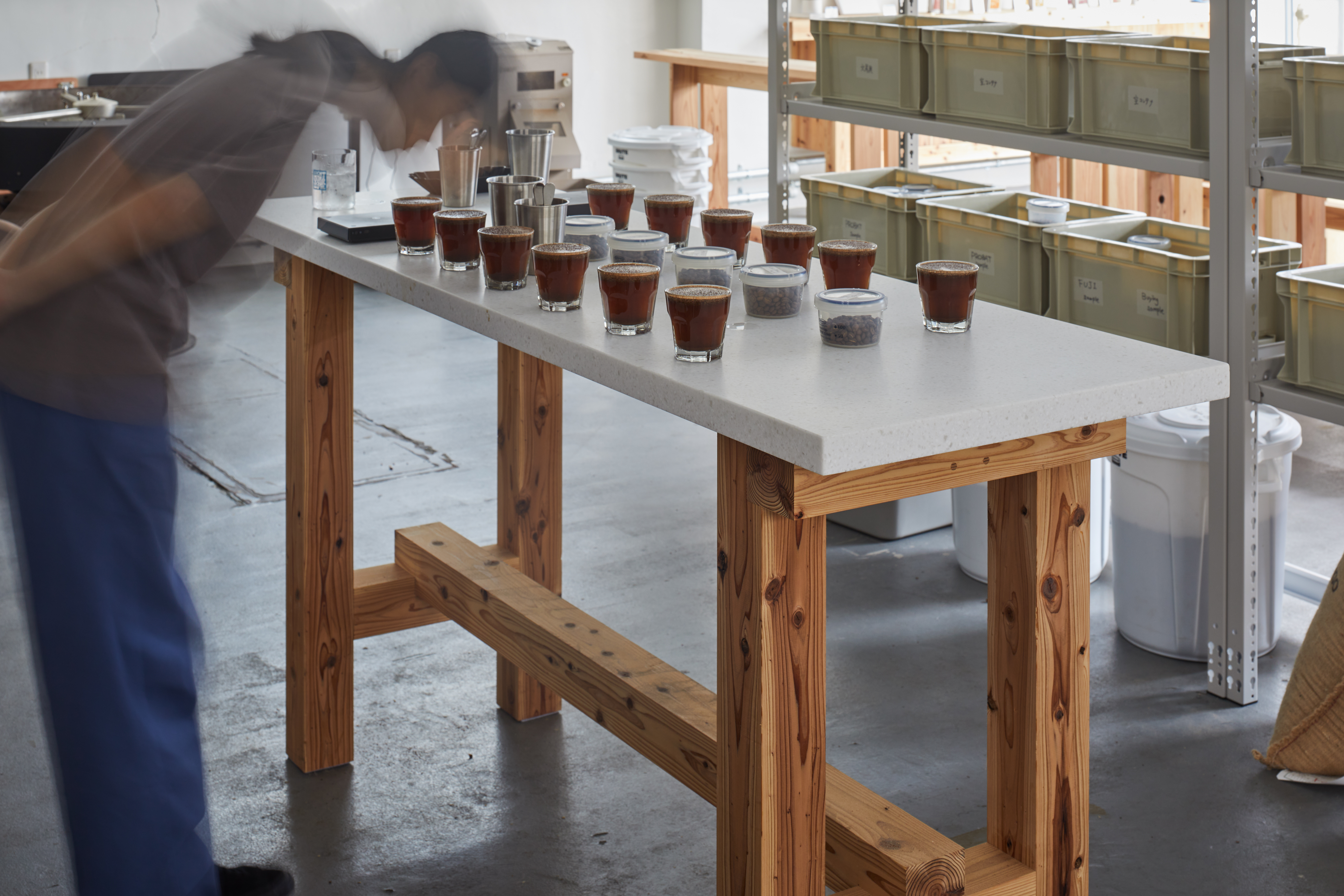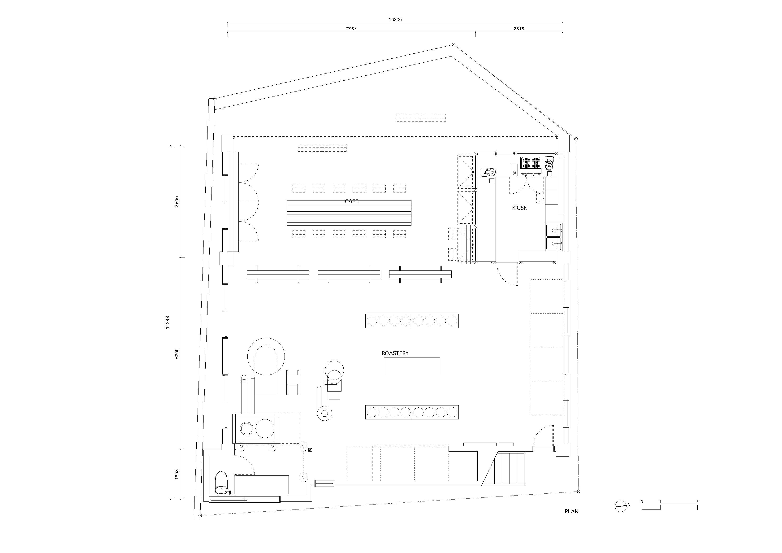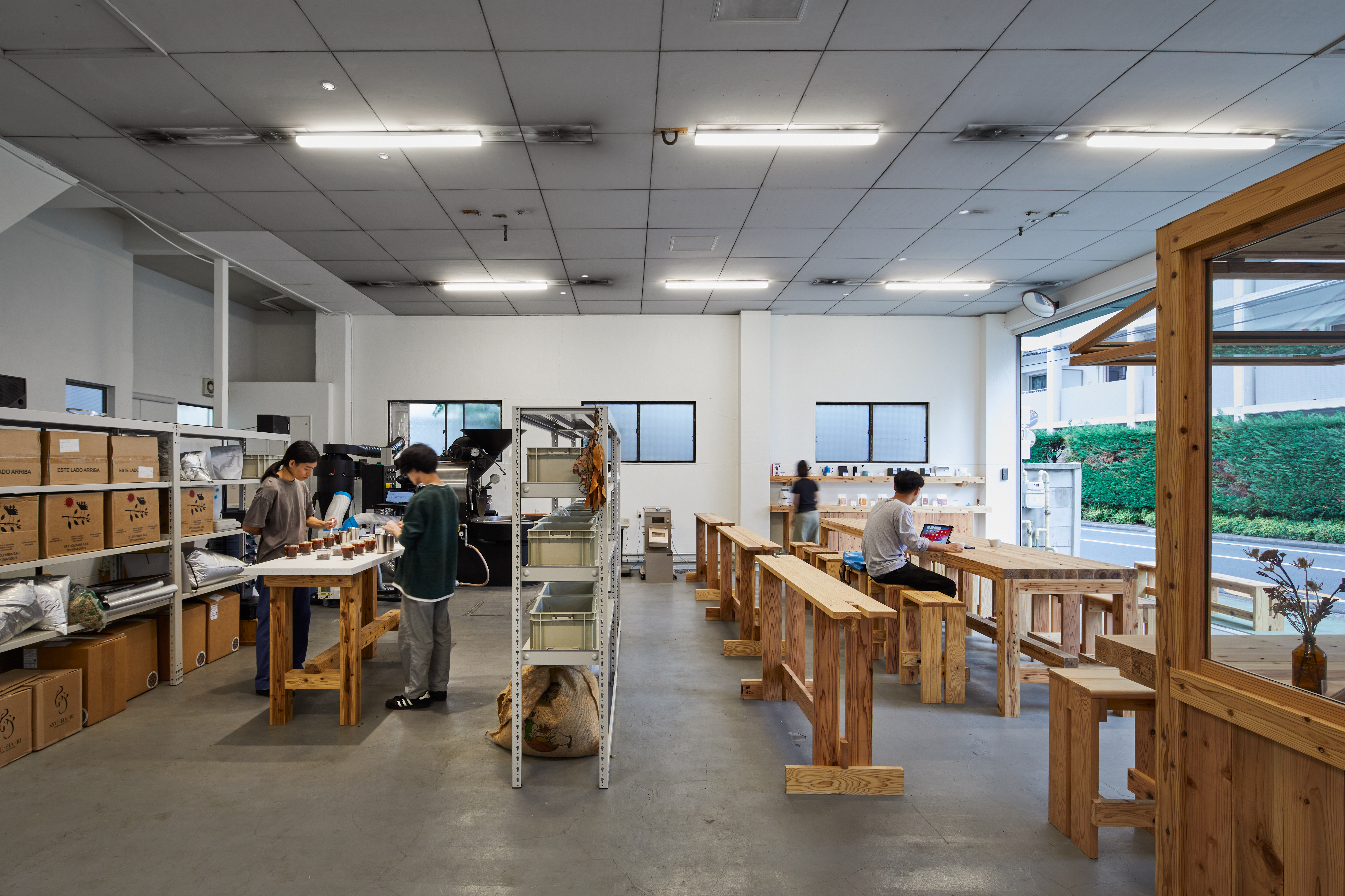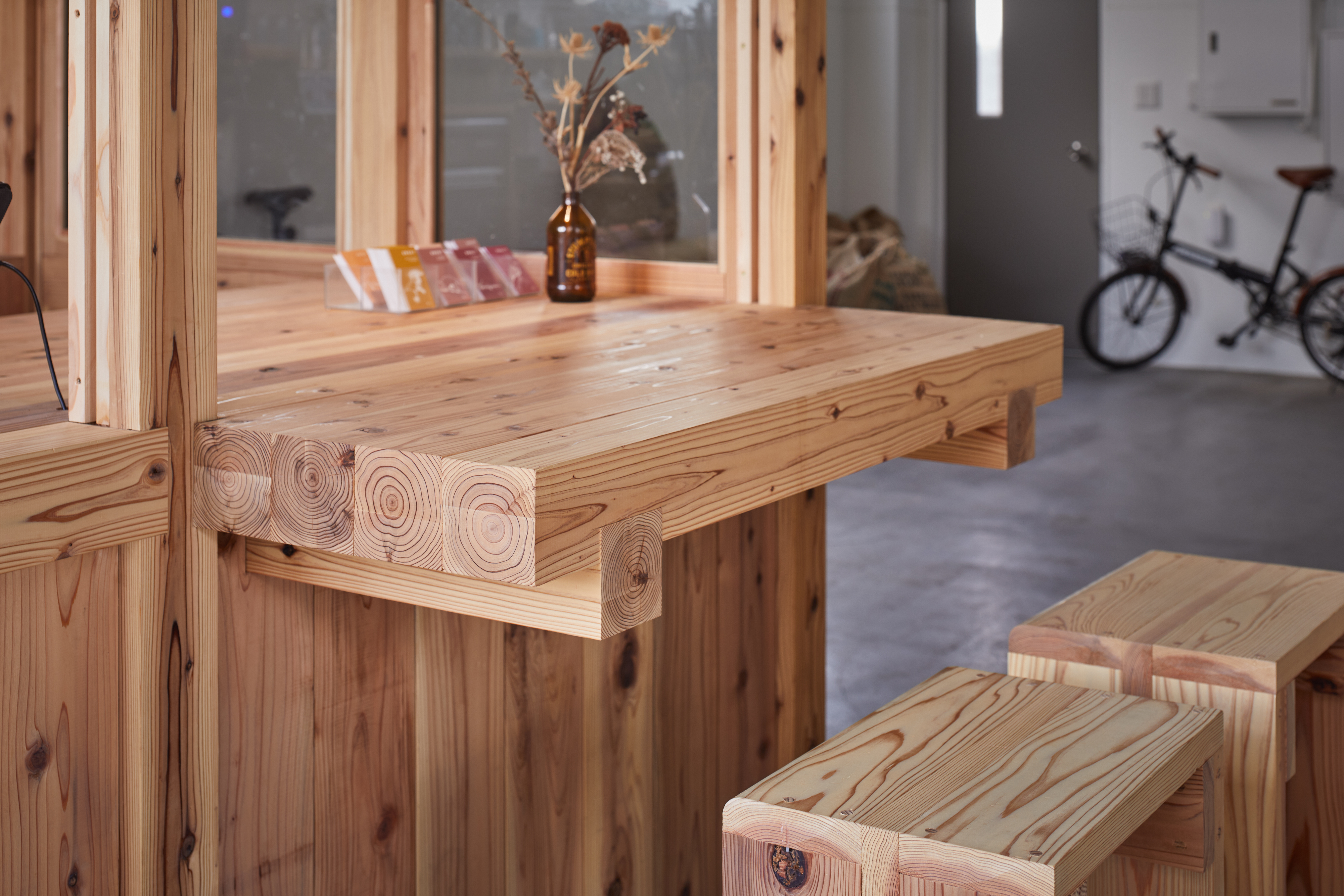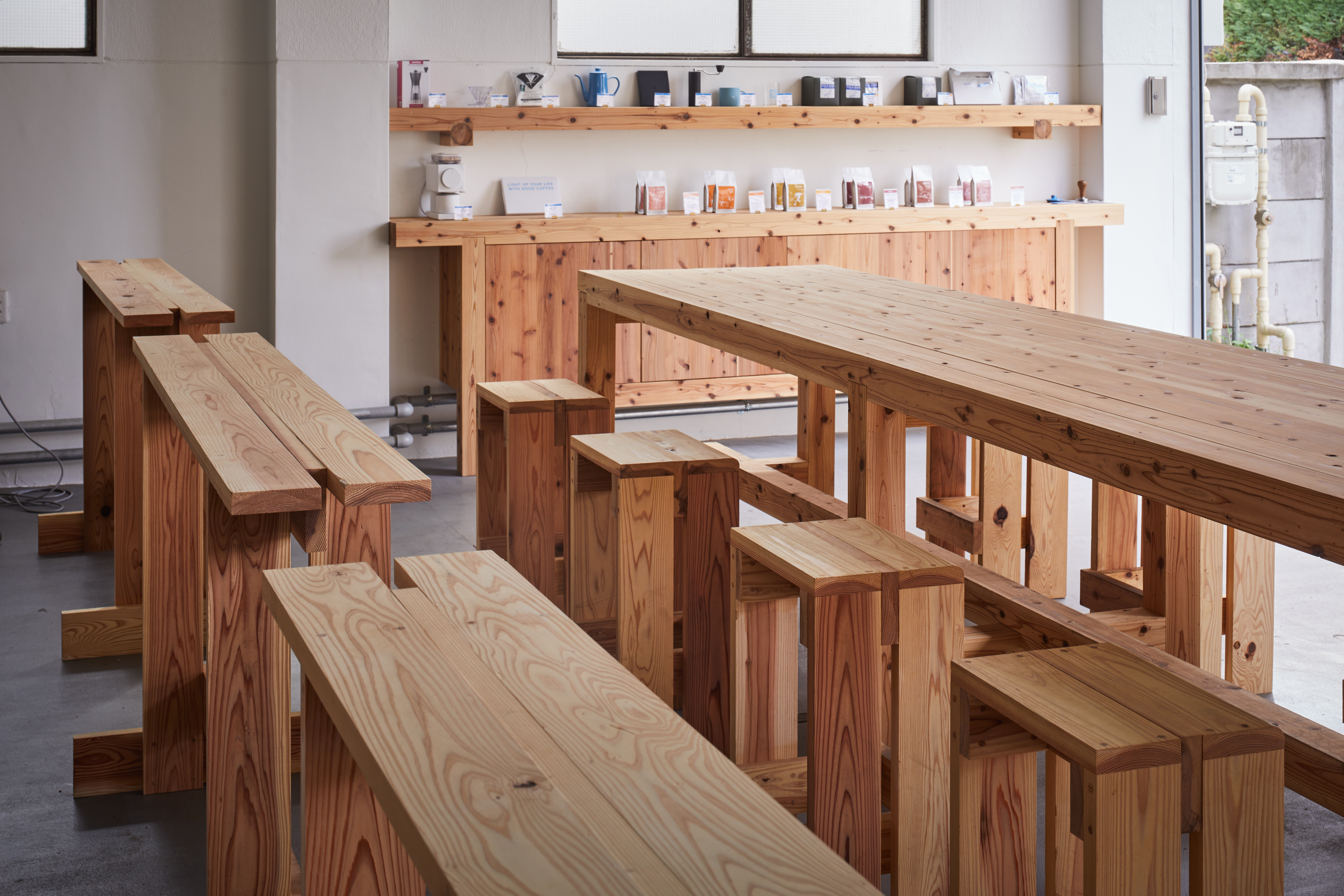 카페 공간에는 키오스크(KIOSK), 4m 길이의 테이블과 바 스툴, 2인용 벤치가 있다. KIOSK는 건물 앞쪽 도로를 향하여 놓여 있고 강렬한 느낌의 로스팅 머신과 대조를 이룬다. 긴 하이 테이블은 직원과 이웃들이 대화를 할 수 있도록 디자인 하였고 벤치는 외부로 옮기기 용이하게 디자인하였다. 공장 느낌의 로스팅 공간과는 다르게 카페 공간은 따뜻한 느낌을 주는 삼나무를 사용하였다. 세심하게 내린 커피처럼 각 조인트도 그 자리에서 직접 손으로 자르고 조립하였다. 로스팅 공간과 카페, 실내외 공간을 개방함에 따라 로스팅 머신의 소리와 냄새는 이웃과 긴밀하게 이어준다.