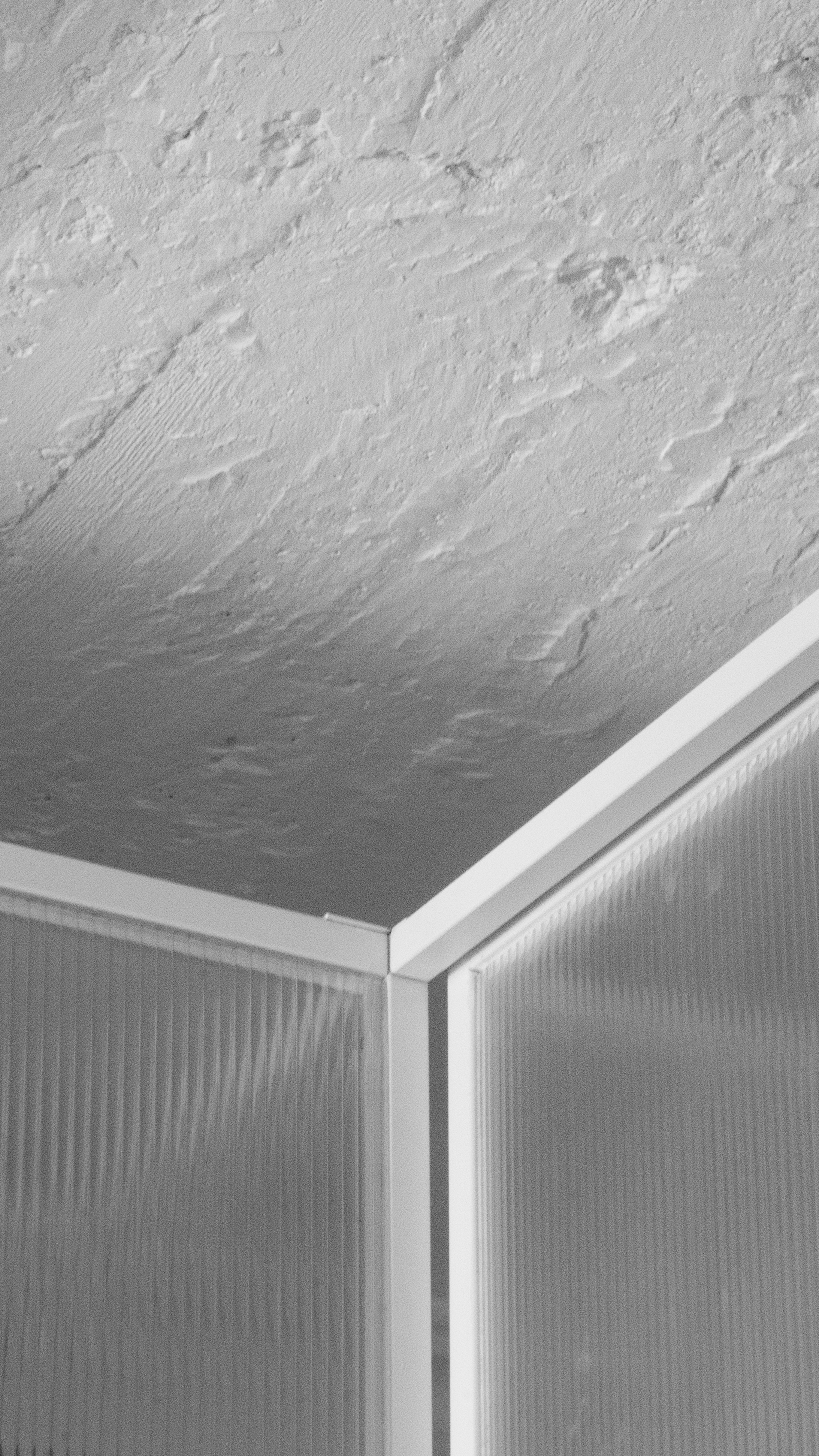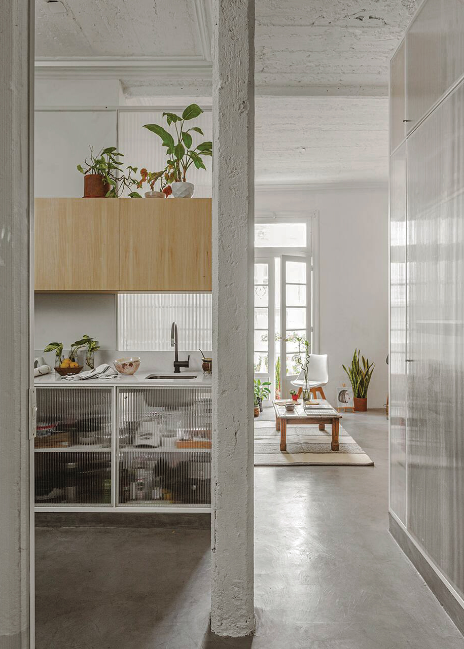 The catalog of materials is defined by the integration of pre-existing textures, discovered after the demolition and removal of the ceilings. The exposed brick was left on the walls and the trace of the wood from the formwork was preserved in the concrete of the ceiling and columns, as well as the original moldings of the building. All these materials became homogeneous starting from the color white, highlighting the subtle variations of the textures. The floor was made continuous by applying smoothed microcement. In addition, translucent materials such as polycarbonate were used to filter the visuals, allowing light to pass through the entire apartment, as well as guatambú storage modules that provide warmth to the intervention. In the case of the bathroom, we worked with opaline glass on the outside and polycarbonate on the inside, operating as a thermal bridge breaker and preventing steam condensation, while preserving the entry of light.