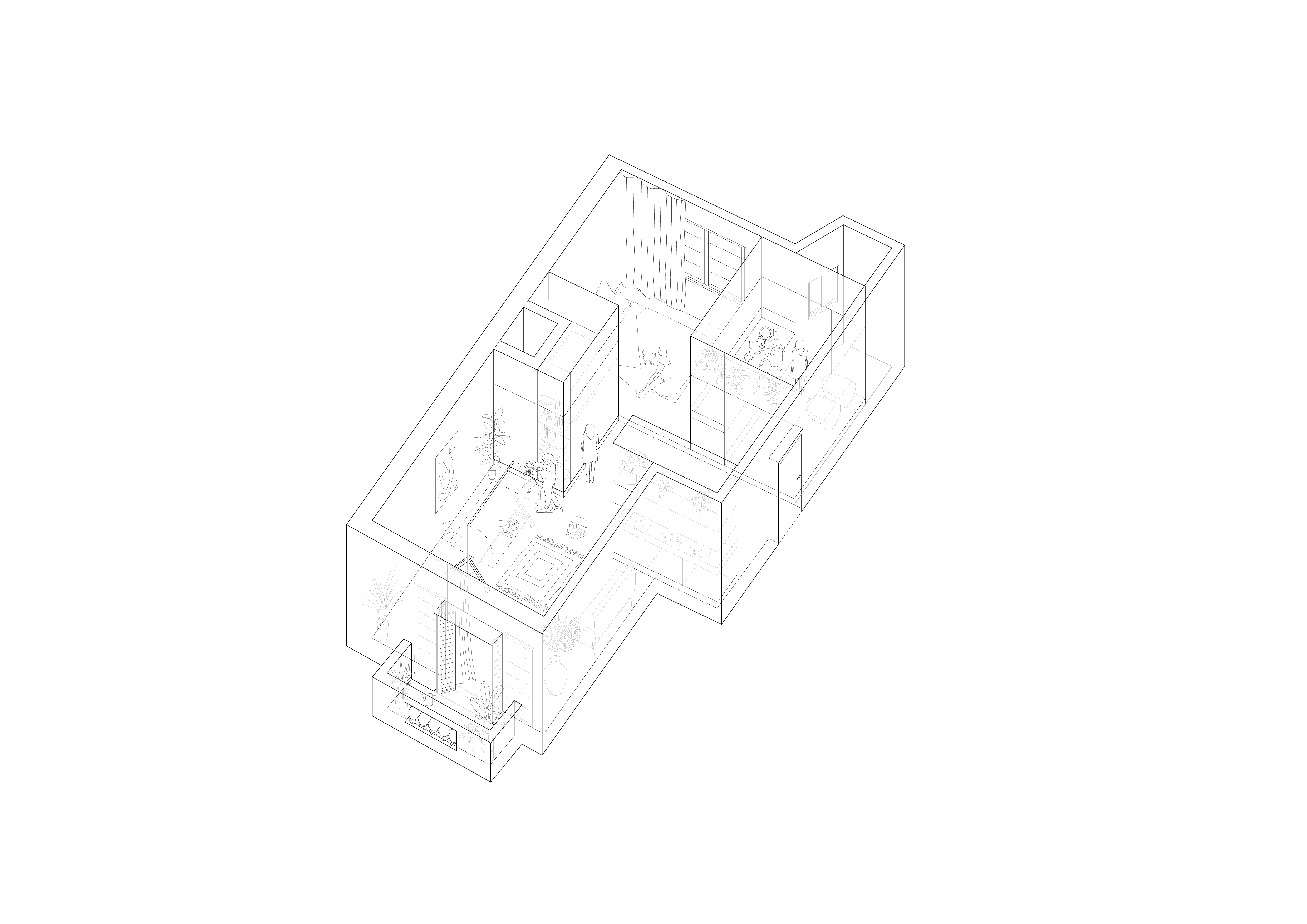 The purpose of the apartment was to house a permanent home and professional development space for a textile designer, which required the unit's flexibility and adequate storage space. To this end, three pieces were designed that organize the new configuration of the department and take up almost its entire height, capable of housing various storage spaces, as well as activities such as cooking and hygiene, among others. One of them defines the bathroom space, another the kitchen space and another is responsible for having a triple function, providing a library-storage towards the living-work space, housing some appliances adjacent to the kitchen space, while towards the bedroom. It is responsible for functioning as a dressing room, complemented by a two-position door that allows the bedroom to be isolated from the rest of the apartment.