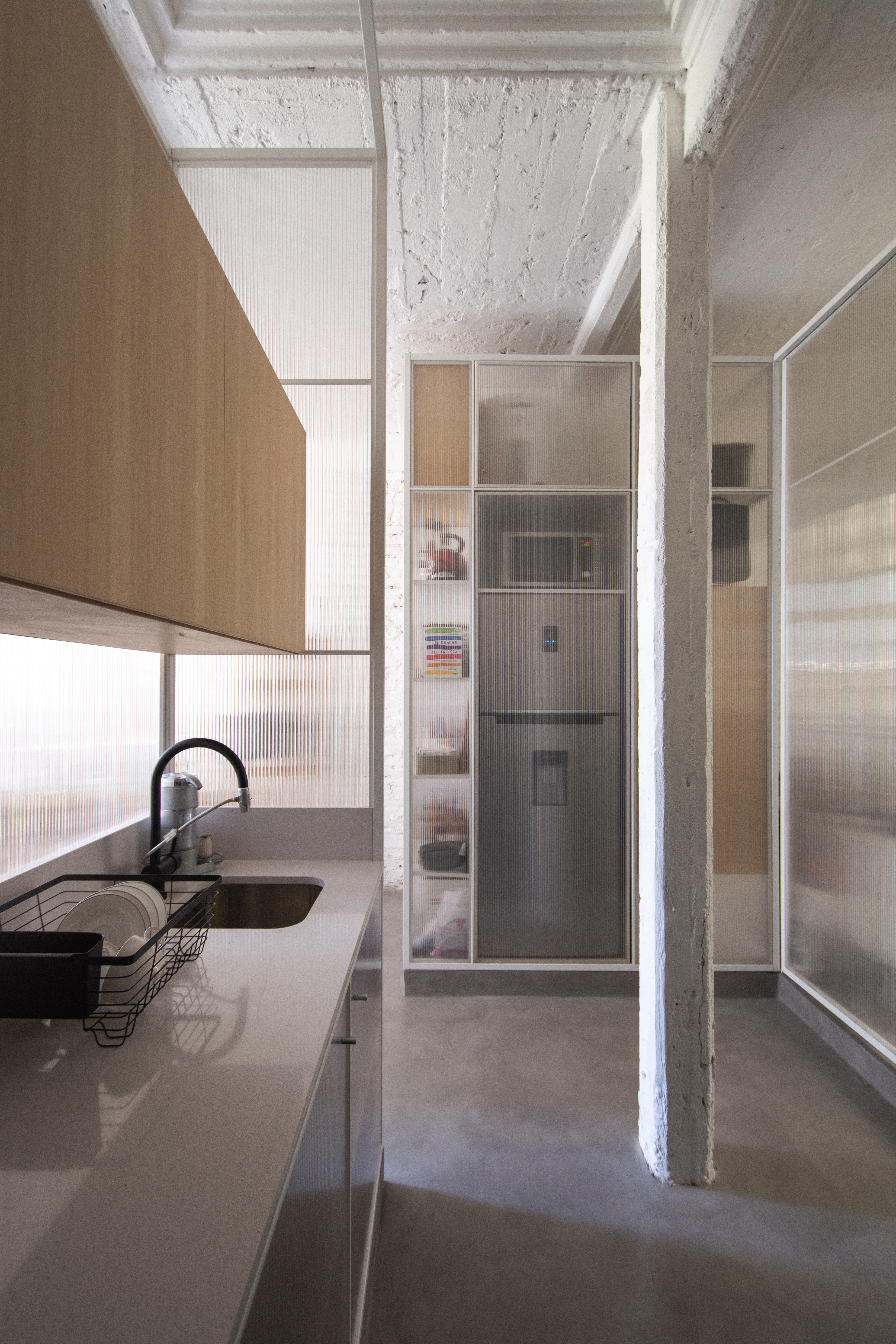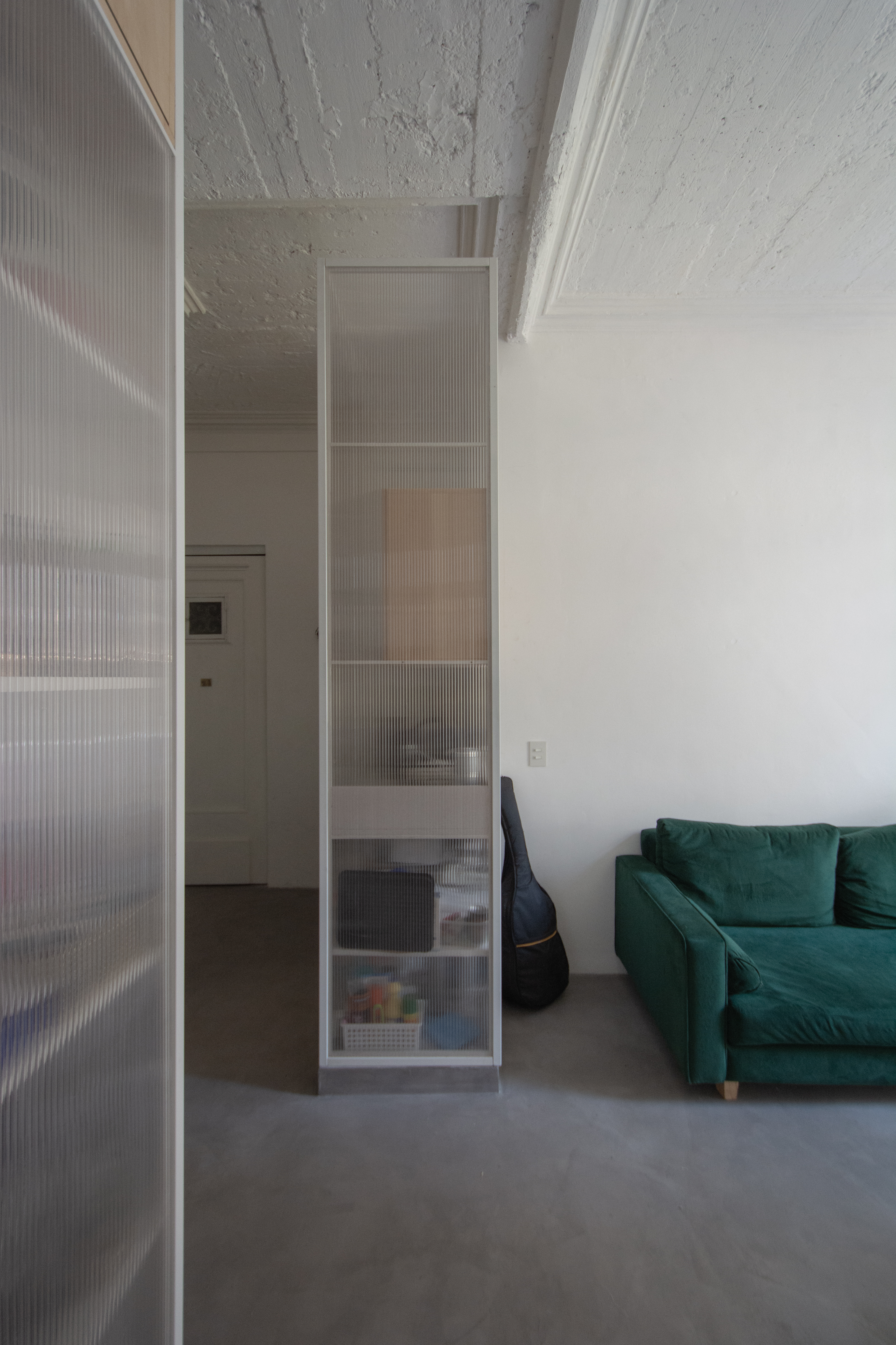 The catalog of materials is defined by the integration of pre-existing textures, discovered after the demolition and removal of the ceilings. The exposed brick was left on the walls and the trace of the wood from the formwork was preserved in the concrete of the ceiling and columns, as well as the original moldings of the building. All these materials became homogeneous starting from the color white, highlighting the subtle variations of the textures. The floor was made continuous by applying smoothed microcement. In addition, translucent materials such as polycarbonate were used to filter the visuals, allowing light to pass through the entire apartment, as well as guatambú storage modules that provide warmth to the intervention. In the case of the bathroom, we worked with opaline glass on the outside and polycarbonate on the inside, operating as a thermal bridge breaker and preventing steam condensation, while preserving the entry of light.