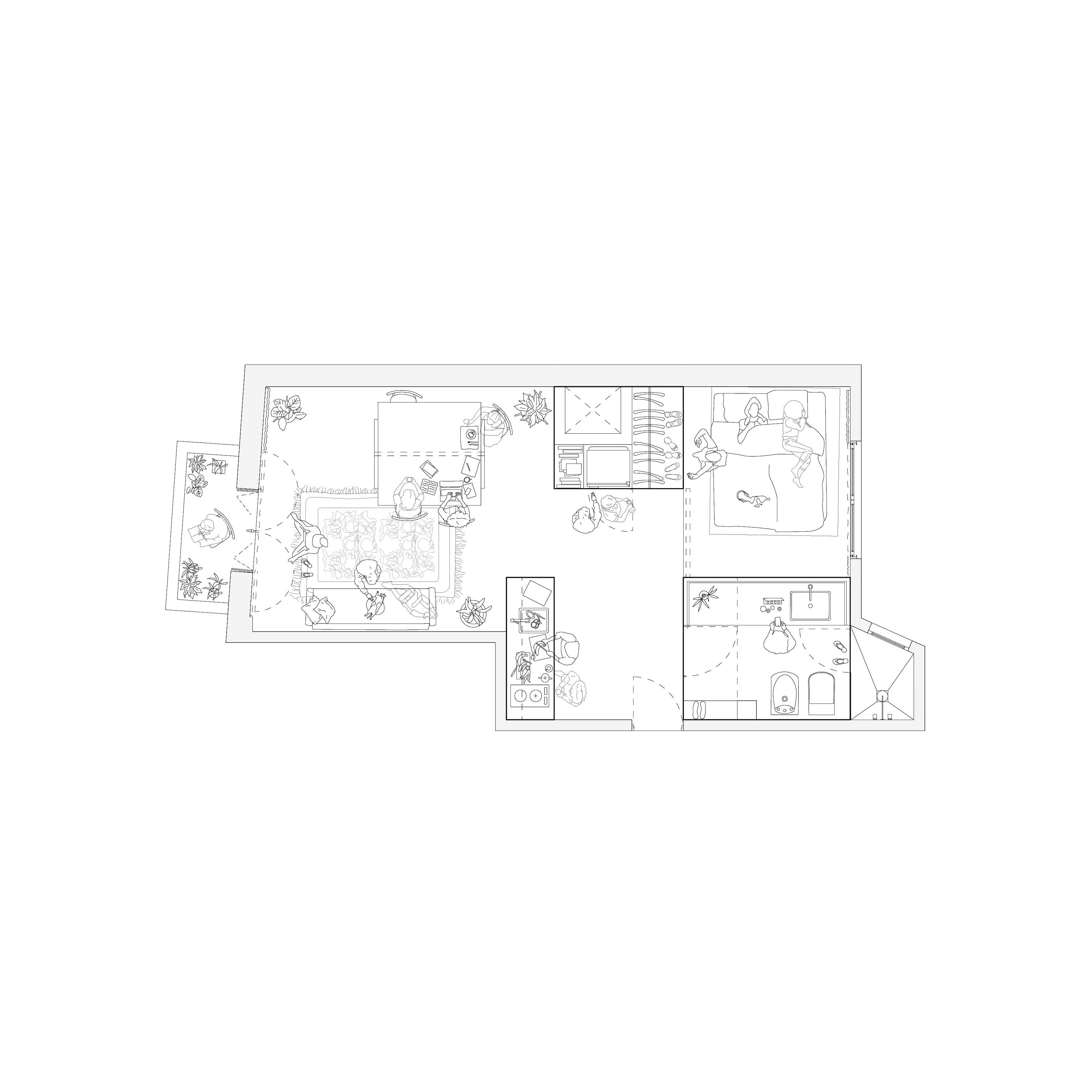아파트의 목적은 텍스타일 디자이너를 위한 영구적인 주택과 전문 작업 공간을 수용하는 것이었고, 이를 위해서는 공간을 유연하게 사용할 수 있어야 하고 적절한 저장 공간이 필요했다. 이를 위해 구역을 새롭게 구성하고 전체 높이를 차지하며 다양한 수납이 가능할 뿐만 아니라 요리, 위생 등의 활동을 수용할 수 있는 세 개로 구성해야 했다. 그 중 하나는 욕실 공간을, 다른 하나는 주방 공간을, 다른 하나는 삼중 기능을 담당하여 거실 및 작업 공간과 도서 저장 공간으로 사용하였다. 주방 공간에 인접한 곳의 일부 가전제품을 침실을 향해 배치하고 침실을 아파트의 나머지 부분과 분리할 수 있는 투 포지션 문으로 보완하여 드레스룸의 기능도 하도록 하였다.