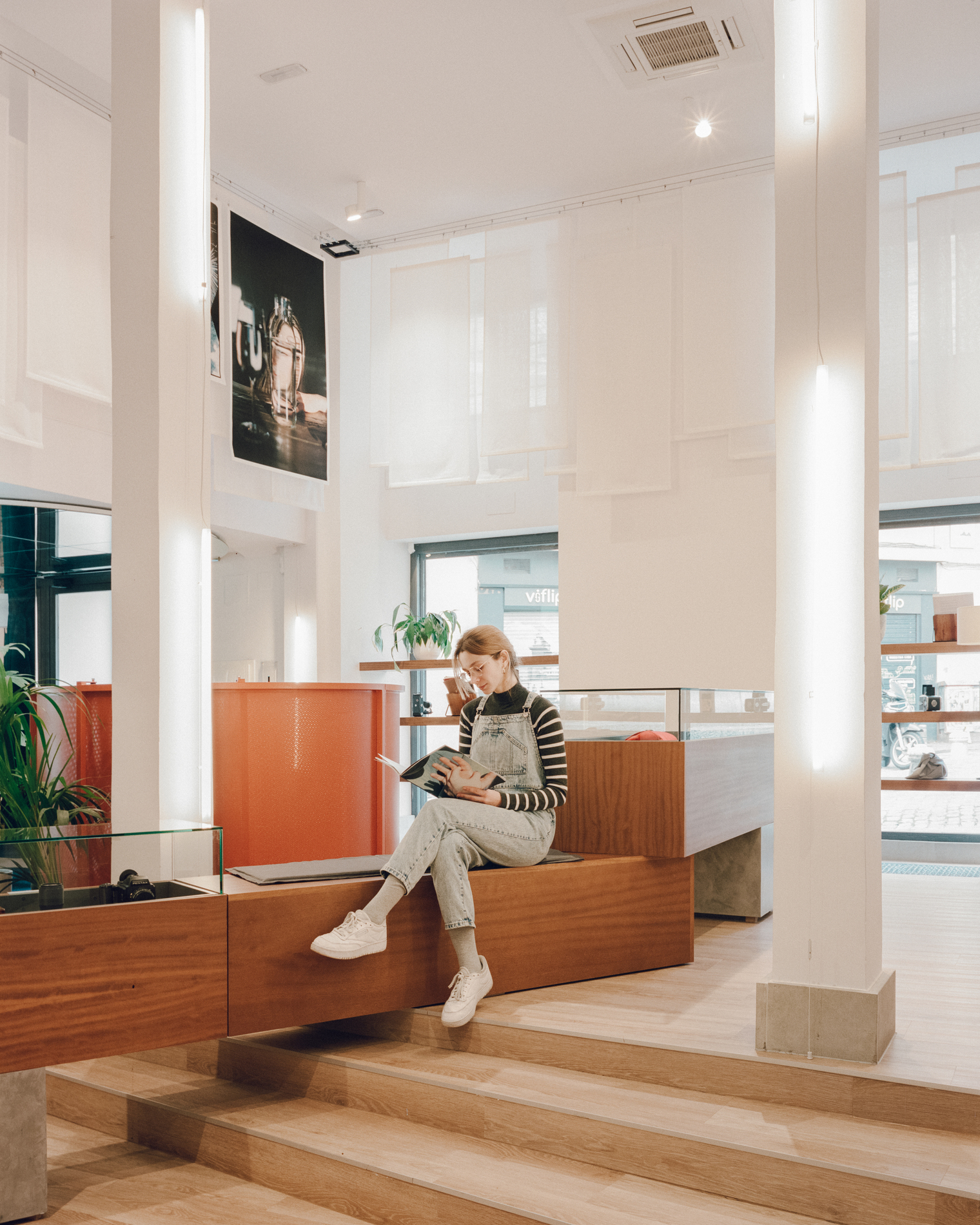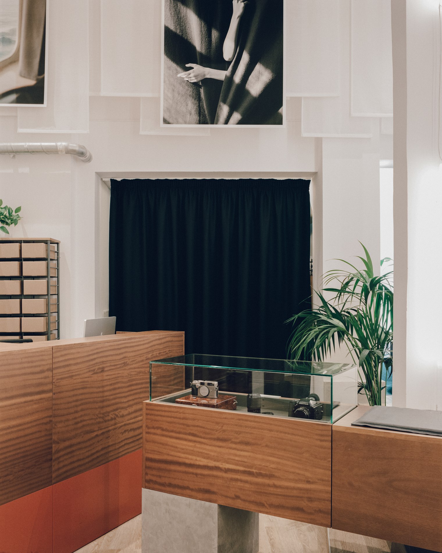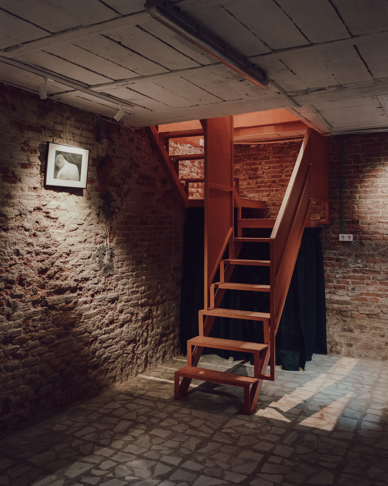 This concept coexists with the industrialization of the current developing process, reflected in the custom-designed furniture for the new establishment. Furniture pieces draw inspiration from the assembly line process to seamlessly fit together, offering various usage options: displays, waiting areas, storage and counters. Through a small perforation in the floor, access is granted to a 30m2 basement housing a gallery of selected works, transporting visitors into a camera obscura. Thus, the studio has created a space that not only meets the brand's basic needs for storage, exhibition and customer service but also generates a comprehensive and immersive experience for users. Beyond the imposing access lens, a photobooth awaits users, inviting them to enjoy a 100% analog immersion, aligning perfectly with Carmencita Film Lab's values.