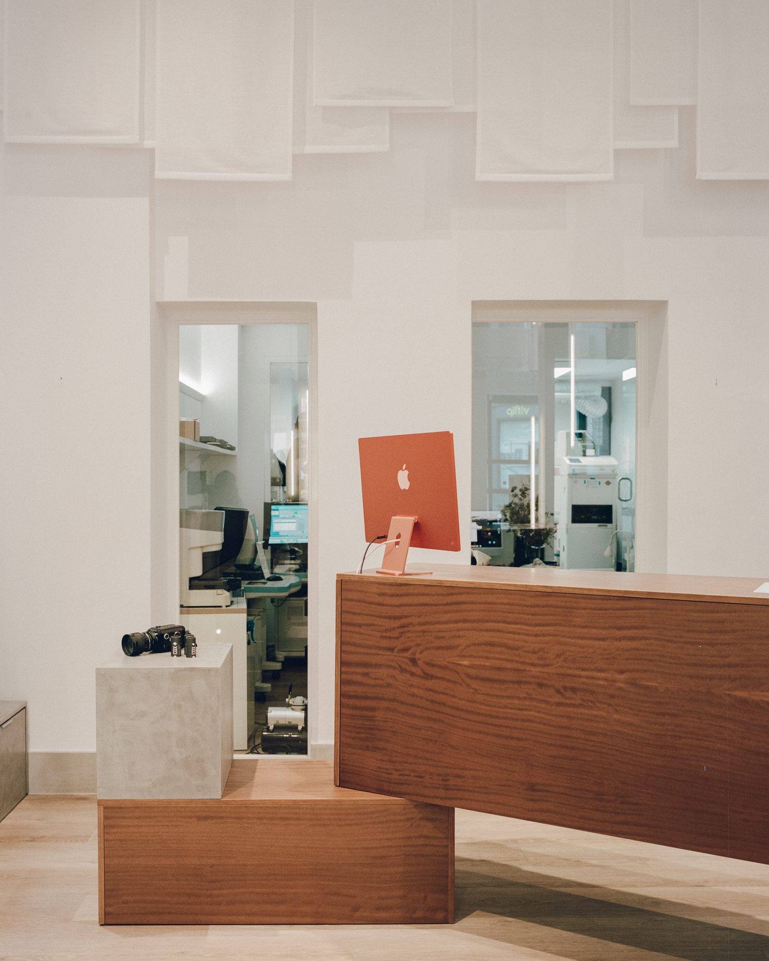 이 개념은 현재 개발 과정의 산업화와 공존하며 새로운 시설을 위한 맞춤 디자인 가구에 반영된다. 가구의 부품들은 조립 라인 프로세스에서 영감을 얻어 서로 완벽하게 결합되며 디스플레이, 대기 공간, 보관 및 카운터 등 사용에 따른 다양한 옵션이 존대한다. 바닥에 있는 작은 통로를 이용해 갤러리가 있는 30㎡ 규모의 지하 공간으로 이동할 수 있으며 방문객을 카메라 옵스큐라로 안내한다. 따라서 스튜디오는 보관, 전시, 고객 서비스에 대한 브랜드의 기본 요구 사항을 충족할 뿐만 아니라 고객들에게 포괄적이고 몰입되는 경험하게 해줄 수 있는 공간을 만들었다. 인상적인 렌즈 너머에는 카르멘시타 필름 랩(Carmencita Film Lab)의 가치와 맞는 100% 아날로그 느낌을 그대로 즐길 수 있는 포토부스가 고객들을 기다리고 있다.