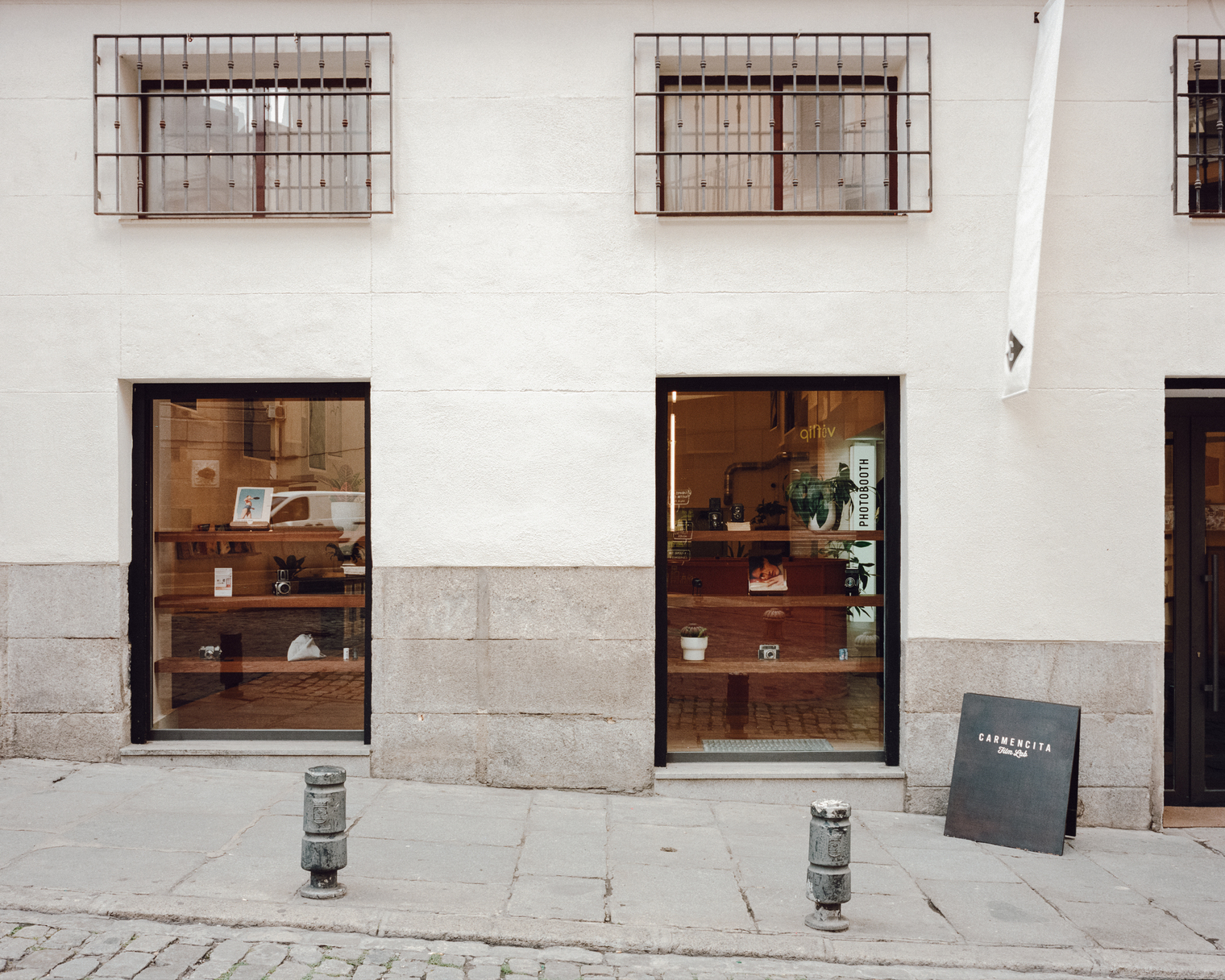 The brand identity eschews embellishments or set decorations. In this regard, Paloma Bau's team has pursued a sober and timeless aesthetic reflected in the choice of raw and natural materials such as iroko wood, stone, jute, cotton fabric and "negative" color. This material palette also reinterprets applications in the brand's previous spaces. Moreover, the furniture has been custom designed by the studio and executed by Lebrel Furniture. Pieces, made of lacquered iroko wood with microcement finish, overlap and connect to move and rotate through an axis according to the establishment's needs. The furniture is complemented by classic design pieces such as the TMM lamp by Miguel Milá for Santa & Cole and abundant greenery. Additionally, technical lighting has been provided by Arkoslight and suspended lamps distributed from floor to ceiling have been designed by Paloma Bau with LED tubes. To conclude this immersive experience in the Carmencita Film Lab universe, the studio opted to conduct a photo shoot of the space in analog format, by photographer Jorge Peiró. A gesture capturing the brand's idiosyncrasy and revealing its values.