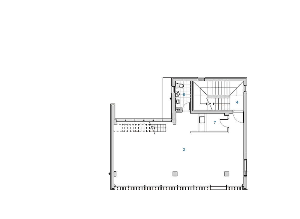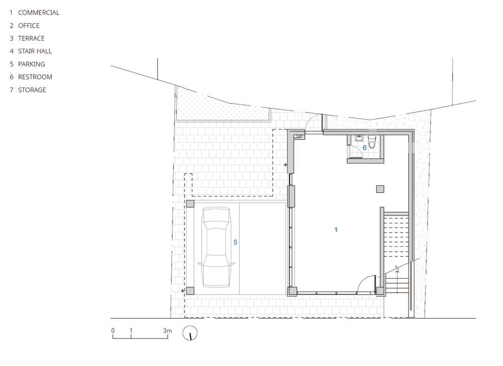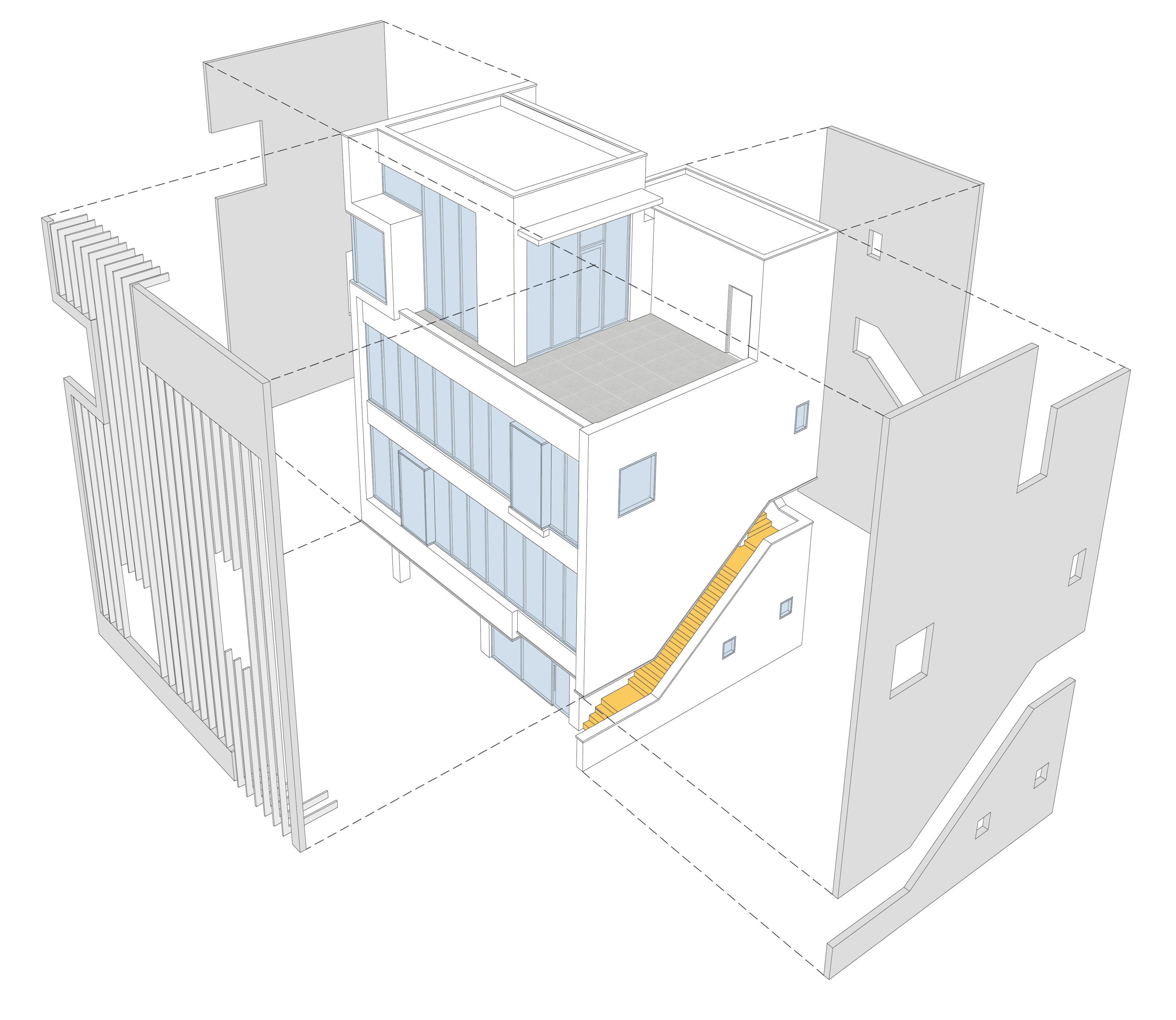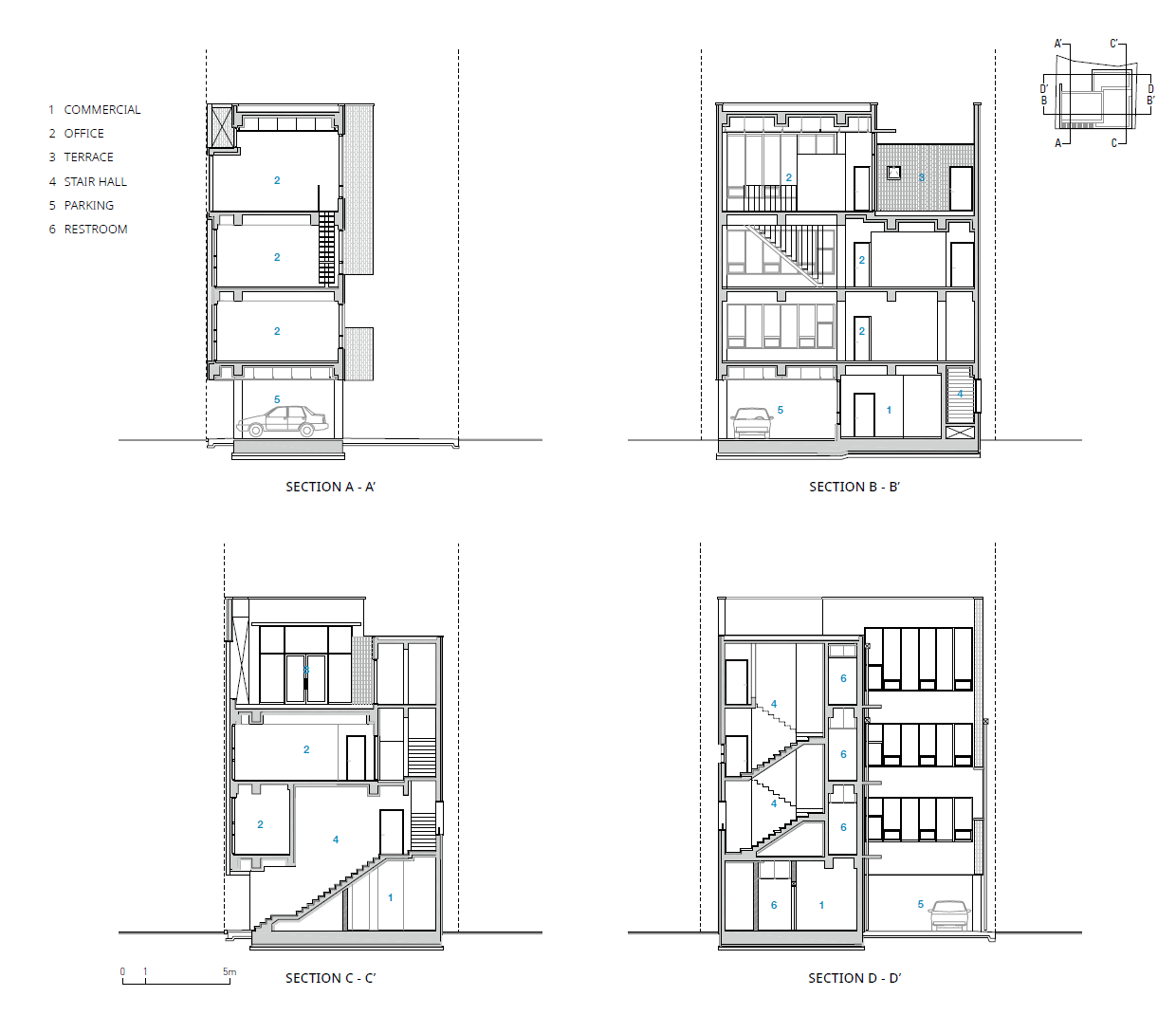도로에서 1m 후퇴한 1층을 구성하여 양방향 주차차량으로부터 간섭 없는 건물 진입이 가능하다. 이는 이동 차량과 보행자의 측면에서도 심리적, 기능적 여유를 주었다. 외기에 열려 있는 계단을 올라가면 2층을 지나 자연스럽게 건물 내부로 진입하게 되고 4층 옥상 테라스까지 계단이 이어진다. 지상으로부터 외부, 내부 공간이 반복되면서 사용자가 지루하지 않게 수직 동선을 구성하고 있다. 옥상 테라스는 5m 높이의 콘크리트벽과 금속 루버로 둘러싸여 주변에 방해받지 않고 업무와 휴게공간으로 사용되면서 직·간접적으로 소통이 가능한 환기 공간으로 역할을 하고 있다.