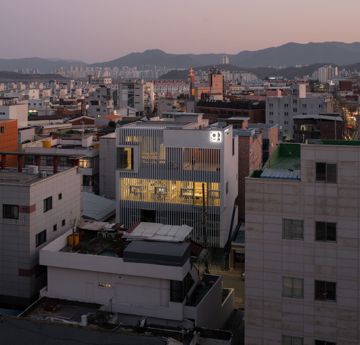 대지는 대구 반야월의 구도심에 위치한다. 이 지역은 한때 2차 산업의 호황으로 양적 개발이 있었으나 현재는 공항 인근 고도 제한과 난개발, 고령화와 인구 유입 감소 등의 문제로 수십년 동안 도시적 성장이 더딘 지역 중의 하나이다. 폭 8m의 작은 가로변은 낙후된 상가주택, 다가구주택, 근생 등이 무질서하게 혼재되어 오랫동안 피로가 쌓이면서 지치고 무기력해진 지역이었다. 이렇게 생명력이 약해진 가로 분위기에 작은 활기와 새로운 질서를 불어넣을 수 있는 건축적 해결책을 우선적으로 고민하면서 프로젝트를 진행하였다. 복잡하거나 난해한 매스의 조합보다는 차분한 질서를 잡을 수 있는 단순하고 명쾌한 형태와 틀이 필요했고, 그 질서의 틀 안에 지역 주민들의 흥미를 이끌어 내면서 건축물의 개성을 표출하는 요소가 필요하다고 판단했다.