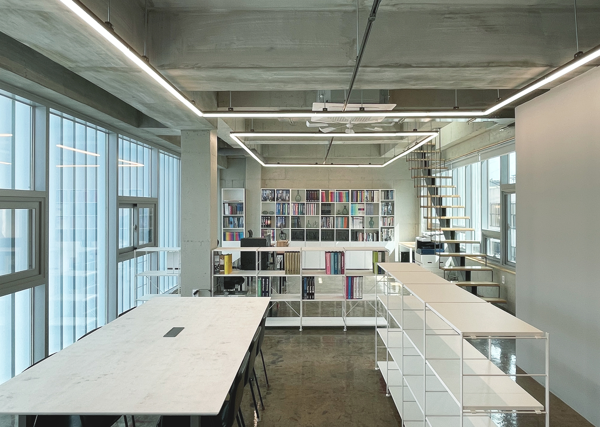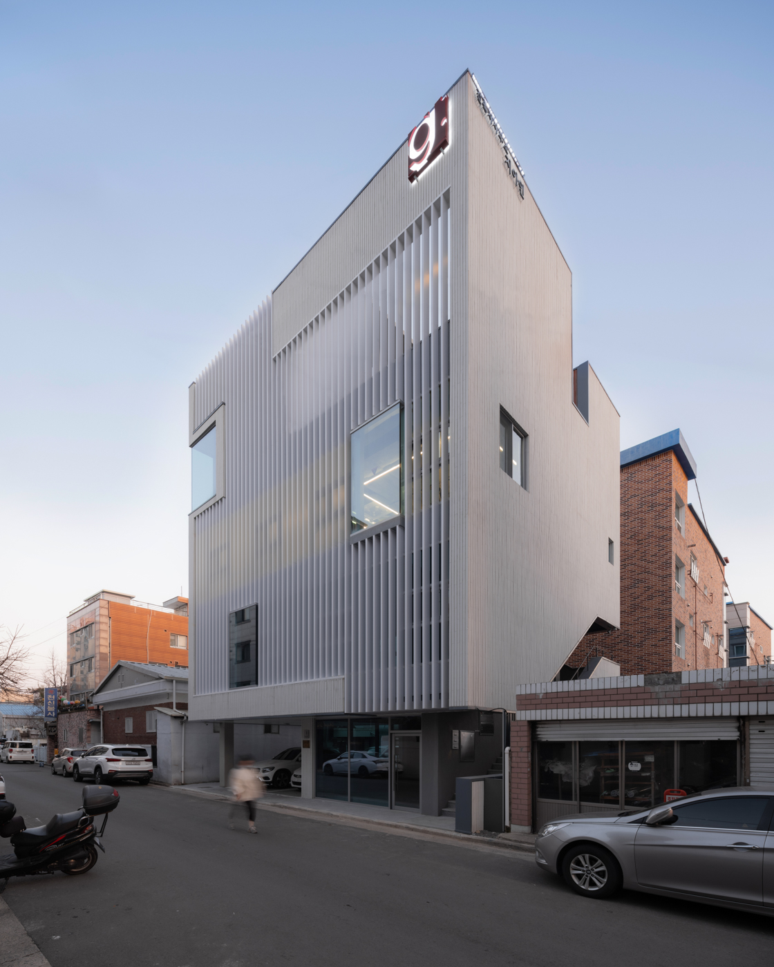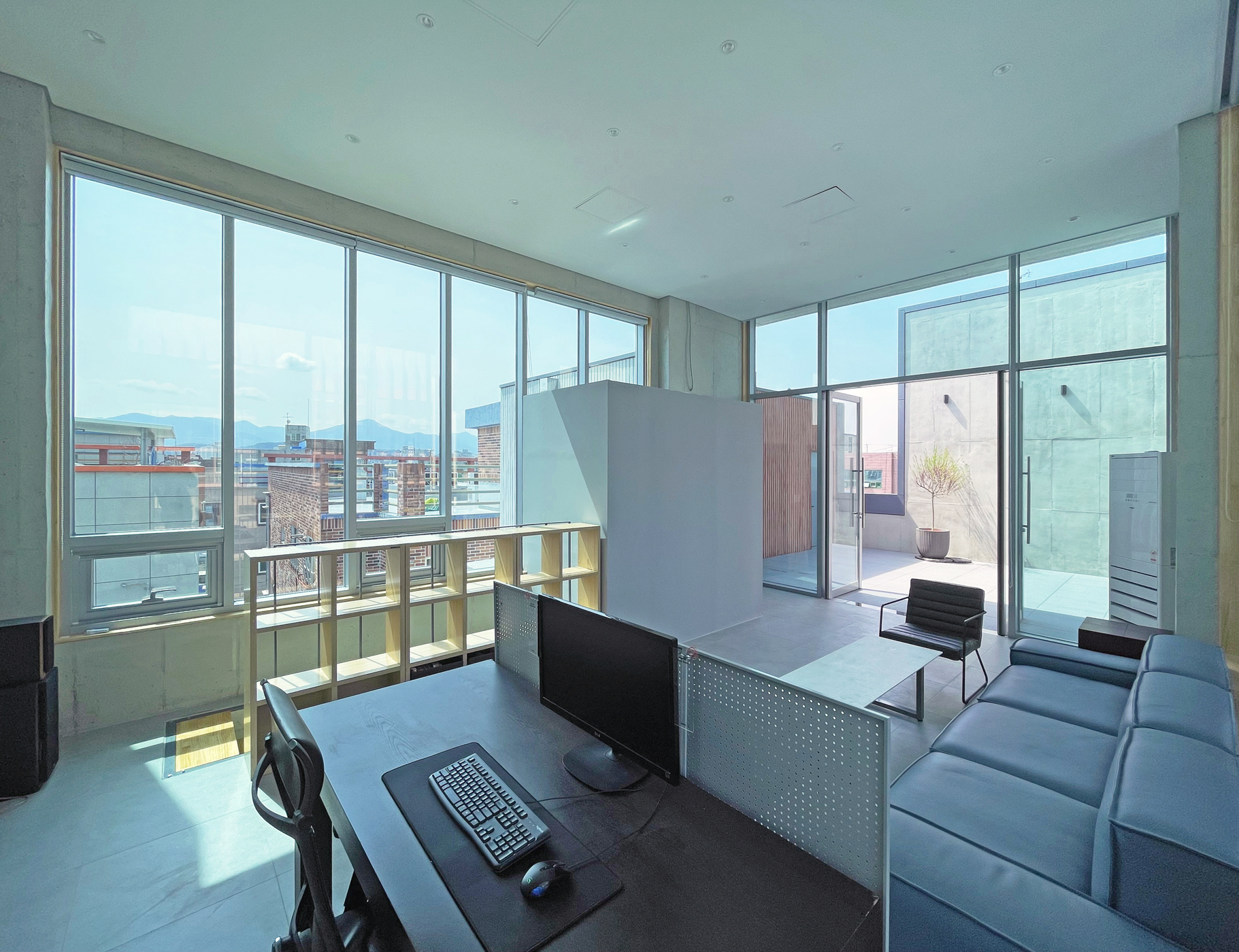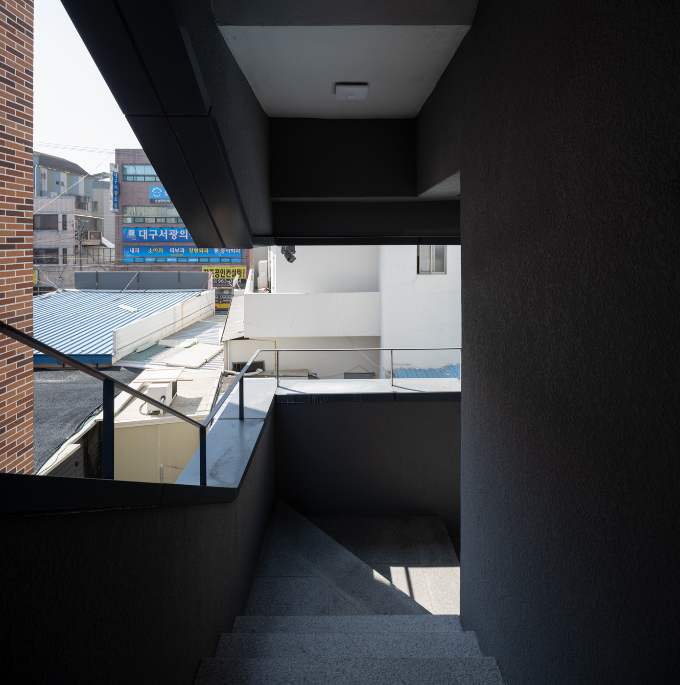 도로에서 1m 후퇴한 1층을 구성하여 양방향 주차차량으로부터 간섭 없는 건물 진입이 가능하다. 이는 이동 차량과 보행자의 측면에서도 심리적, 기능적 여유를 주었다. 외기에 열려 있는 계단을 올라가면 2층을 지나 자연스럽게 건물 내부로 진입하게 되고 4층 옥상 테라스까지 계단이 이어진다. 지상으로부터 외부, 내부 공간이 반복되면서 사용자가 지루하지 않게 수직 동선을 구성하고 있다. 옥상 테라스는 5m 높이의 콘크리트벽과 금속 루버로 둘러싸여 주변에 방해받지 않고 업무와 휴게공간으로 사용되면서 직·간접적으로 소통이 가능한 환기 공간으로 역할을 하고 있다.