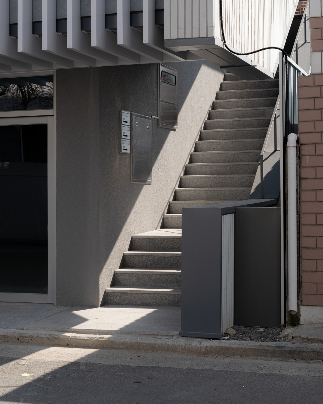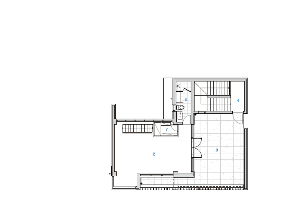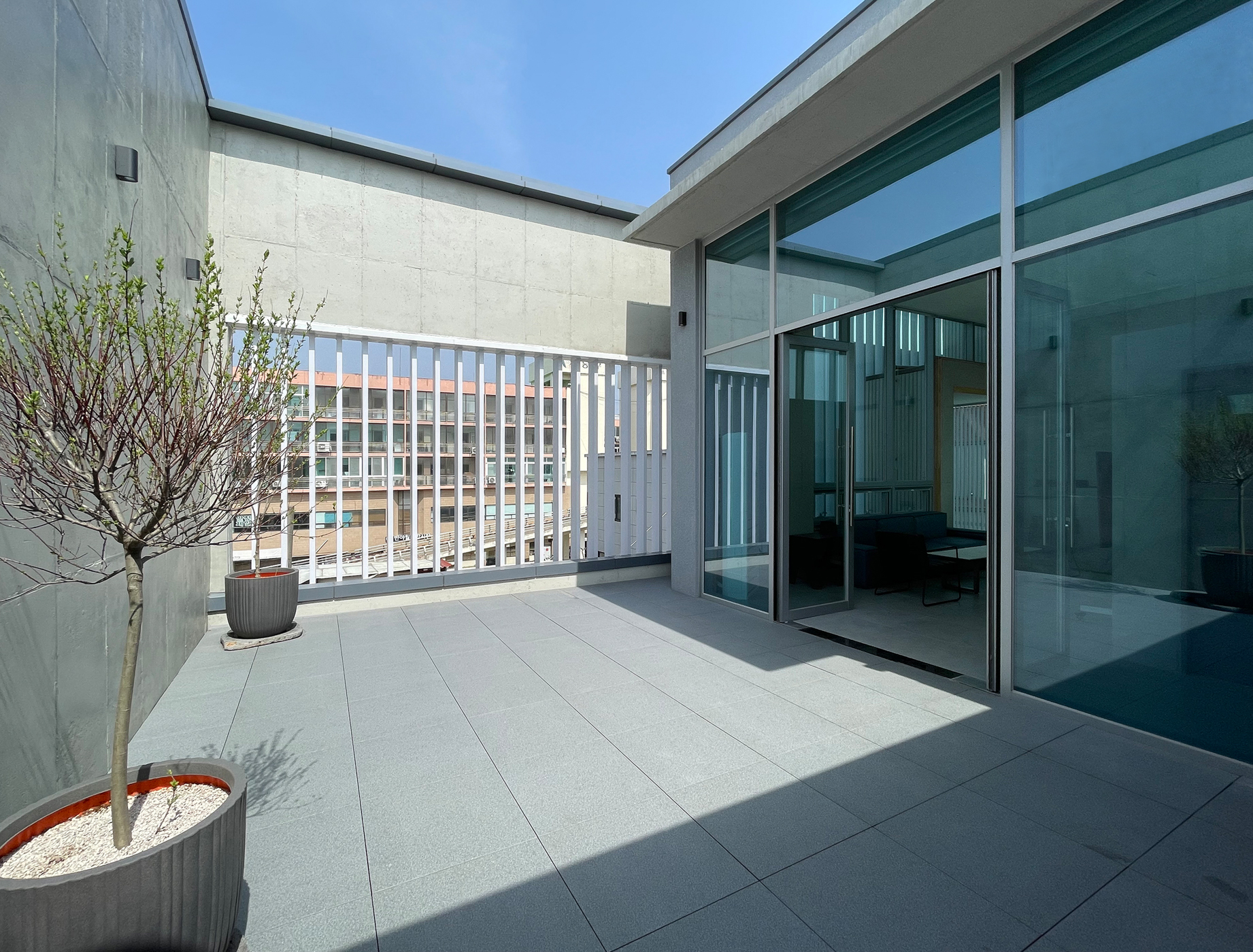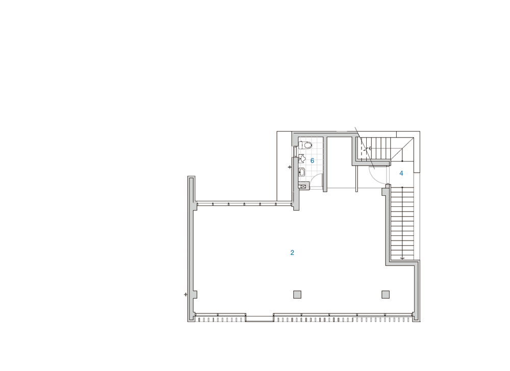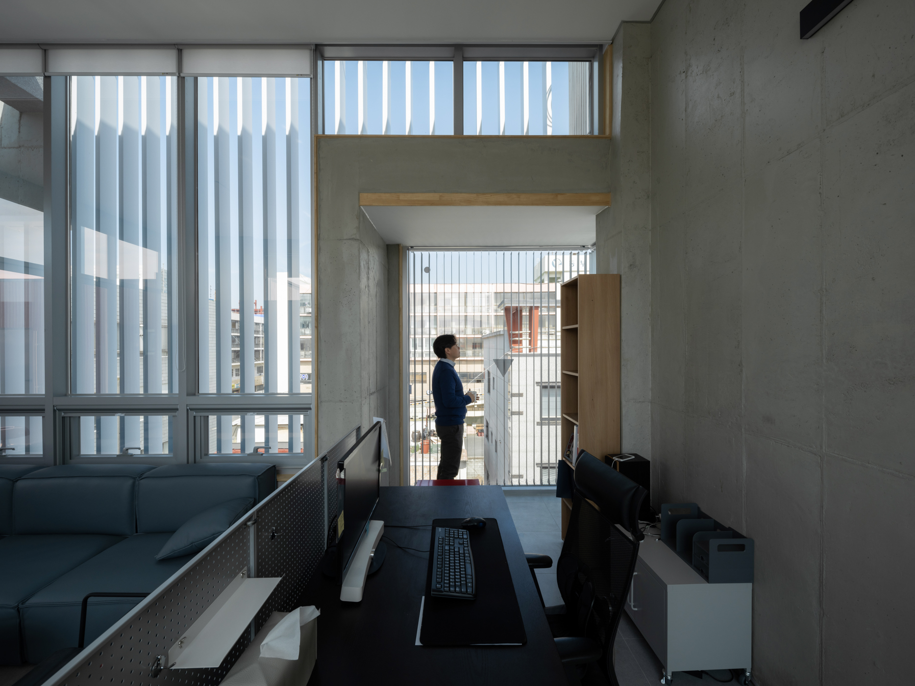 도로에서 1m 후퇴한 1층을 구성하여 양방향 주차차량으로부터 간섭 없는 건물 진입이 가능하다. 이는 이동 차량과 보행자의 측면에서도 심리적, 기능적 여유를 주었다. 외기에 열려 있는 계단을 올라가면 2층을 지나 자연스럽게 건물 내부로 진입하게 되고 4층 옥상 테라스까지 계단이 이어진다. 지상으로부터 외부, 내부 공간이 반복되면서 사용자가 지루하지 않게 수직 동선을 구성하고 있다. 옥상 테라스는 5m 높이의 콘크리트벽과 금속 루버로 둘러싸여 주변에 방해받지 않고 업무와 휴게공간으로 사용되면서 직·간접적으로 소통이 가능한 환기 공간으로 역할을 하고 있다.