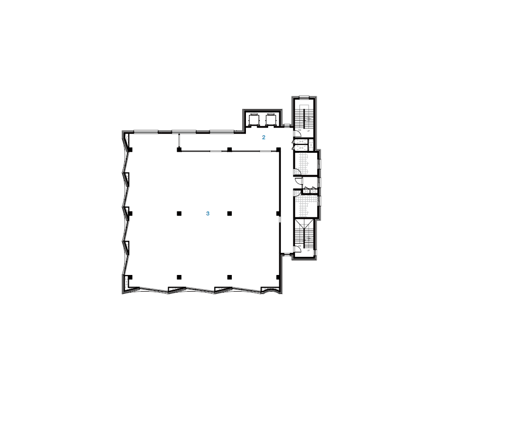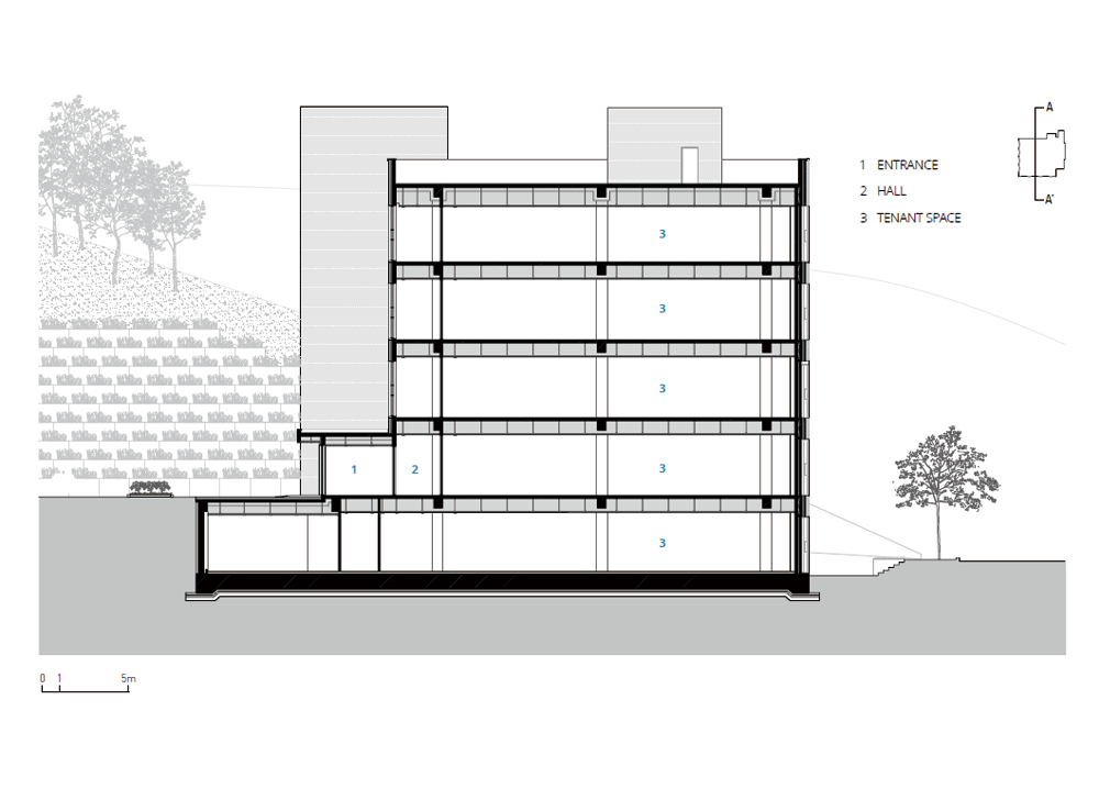 근린생활시설(이하 근생) 프로젝트는 설계 당시에 어떤 사용자가 들어올지 혹은 어떤 용도로 사용될지 알 수 없다. 그래서 여러 가능성을 고려하여 평이한 구조 모듈의 건조한 평면으로 구성하게 된다. 호와 사선 프로젝트도 이러한 ‘근생의 리듬’에 기반한 건물이다. 코어 등 기능부를 ‘ㄱ’자로 바깥쪽에 배치하여 임대 공간을 최대한 정방형으로 만들었으며, 이러한 정방형 임대공간의 구조 모듈, 즉 ‘근생의 리듬’을 자연스럽게 외부의 입면에 드러냈다. 그리고 평이한 리듬으로 산과 아파트 사이를 조율할 수 있는 기초를 마련한다.
