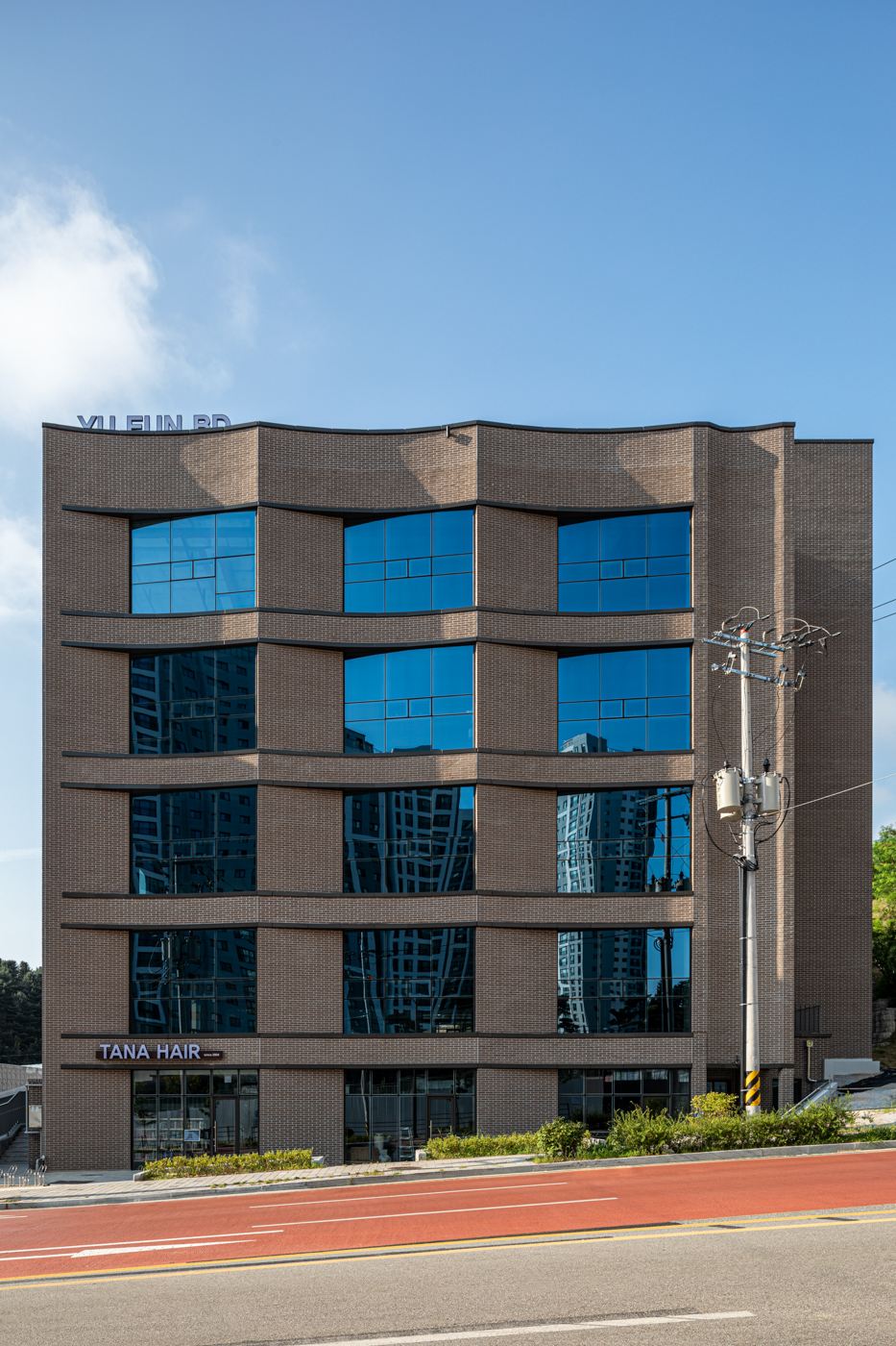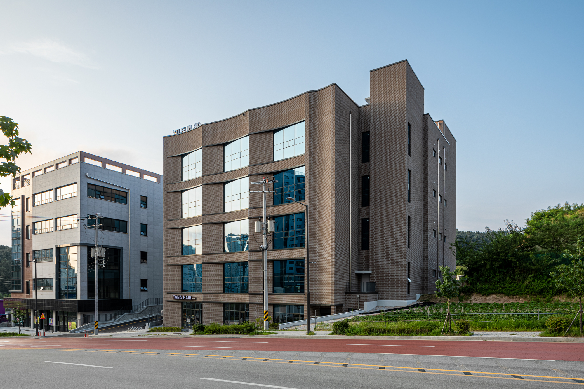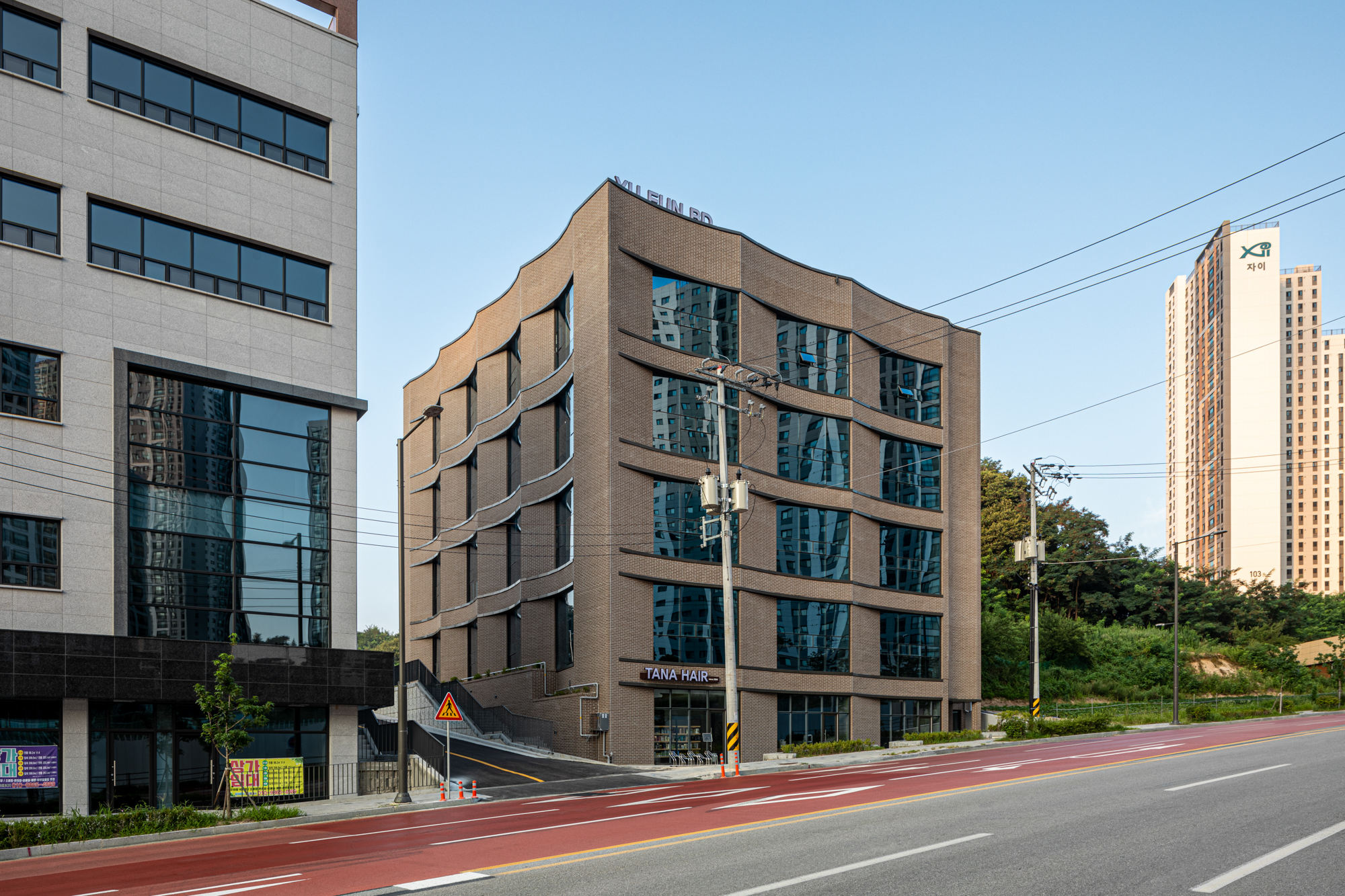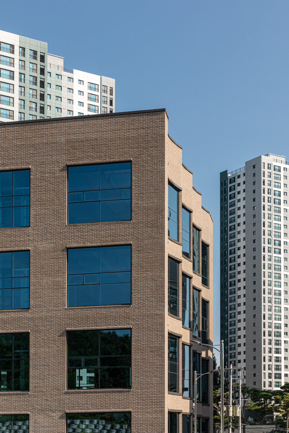 평면상의 선분(Line)을 호(Arc)로 만들어 입면의 평평한 면을 둥글게 누르고, 호에 접하는 두 개의 접선으로 각각 벽과 창을 만들었다. 둥글게 눌러진 면이 비스듬한 벽에 그림자를 두르고, 하루 종일 입면이 태양빛에 따라 시시각각 다르게 보이게 하였다. 산을 배경으로 하는 건물이 밋밋하지 않고 자연과 어우러져 변화하는 모습이었으면 하는 바람이 있었다. 이 밖에도 호와 접선의 조합을 통해 여러 이점을 만들 수 있었는데, 그 중 하나가 실내 공간에서 조금 더 열린 방향, 즉 남측의 자연 쪽으로 시선을 유도한 것이다. 북측면에서는 사선창을 통해 아파트를 비껴 멀리 도로 너머를 바라보게 하고, 동측면에서는 인근 건물의 벽이 비껴서 남쪽의 산을 바라보도록 하였다.