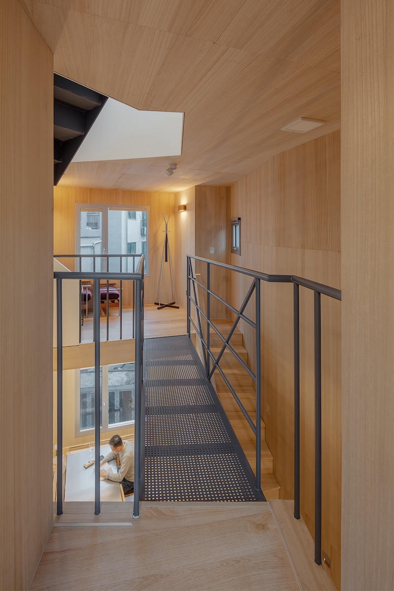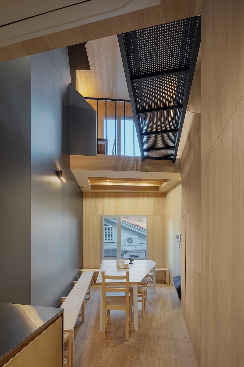 역사적인 서울 강북구 인수봉 자락에 위치한 무너미 스튜디오는 북한산의 인수봉과 도봉산을 멀리 바라보며 목재와 콘크리트라는 두 가지 주요 재료를 흥미로운 방식으로 혼합했다. 이 주택은 어릴 적부터 친구였던 두 명의 집주인을 위해 설계된 쌍둥이 주택으로, 작은 출판사를 위한 공간과 1인 가구를 수용할 수 있는 주택으로 각각 구성되어 있다. 쌍둥이 주택은 각 동에 두 개의 방과 두 개의 욕실을 갖추고 있으며, 97㎡의 콤팩트한 내부에는 수직으로 통합된 생활 공간과 인접한 주방이 조성되어 있다.