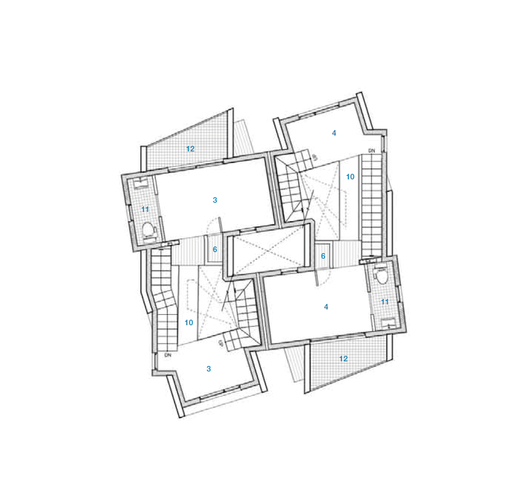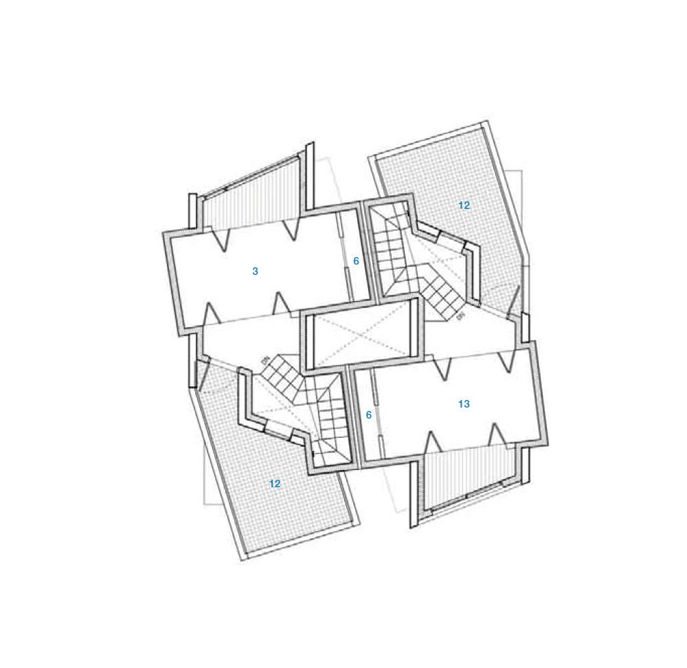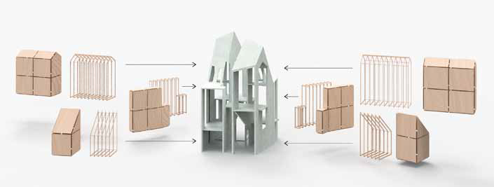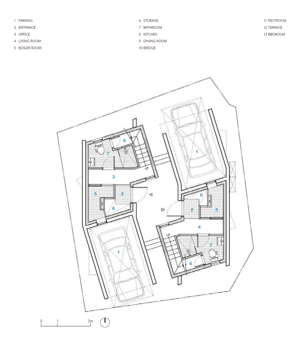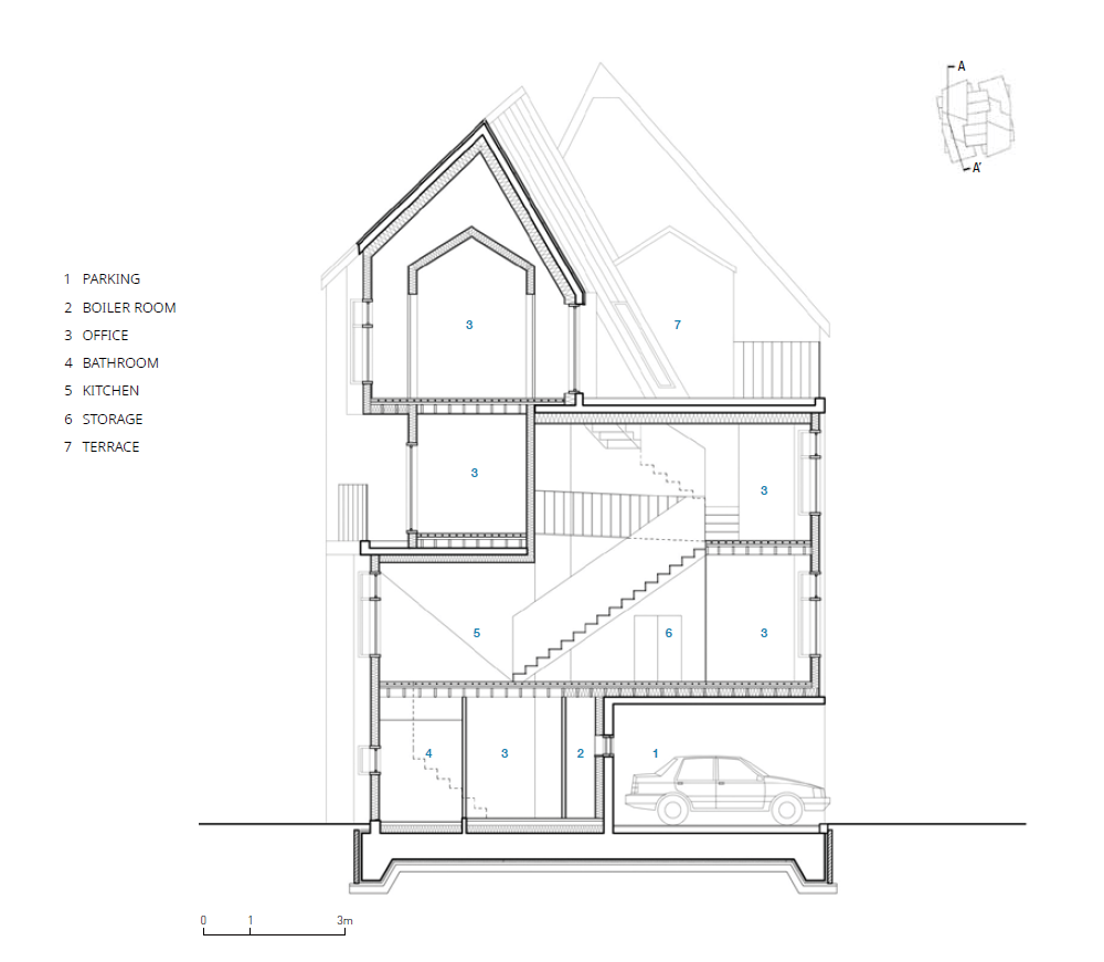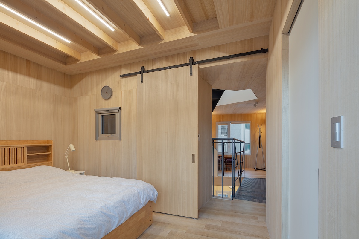 기존의 아파트 방식의 건설과 도시 주택 구성 관행에서 벗어나, 수직으로 같은 유닛이 적층되는 방식과는 다른 수직 구성을 도입하는 것을 목표했다. 건축가는 건축 법규를 창의적으로 재해석하고 작업자들의 장인 정신을 최적화하여 같이 사는 주거의 수직 통합 뿐만 아니라 목재와 콘크리트의 조합에서 나오는 예기치 않은 우연적 상황에 주목했다. 각 동의 상호 침투로 인한 도시 주택의 공간적 조직을 재정의하는 한편, 두 동이 완전히 분리됐지만 긴밀하게 통합된 연결을 이루도록 했다.여기서 ‘통합’과 ‘독립’이라는 용어가 모순된 것처럼 들릴 수 있지만, 한국의 전통적인 ‘방’을 목재 큐브와 박공지붕으로 전환한 가장 단순한 유형을 채택하고, 콘크리트가 지상 인프라 역할을 하면서 개방형 뼈대로 이를 지지하는 철근 콘크리트와 혼합된 목조 주택의 다른 형식을 선보였다.